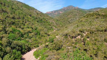 Le massif de l’Estérel, situé dans le Var et les Alpes-Maritimes, s’étend depuis le littoral de Saint-Raphaël à l’ouest jusqu’à Mandelieu-la-Napoule à l’est. Il est constitué de roches acides, principalement des rhyolites issues d’une importante période de volcanisme permien. Le relief, très accidenté, est marqué par de nombreux pics et sommets — dont le mont Vinaigre (614 m) — entaillés par des ravins profonds, drainés par des rivières et ruisseaux à régime torrentiel temporaire. Sur le versant sud, les principaux cours d’eau sont les ruisseaux du Perthus (photo 1) et du Grenouillet, tributaires du petit fleuve côtier l’Agay. Le versant nord appartient au bassin-versant de l’Argentière qui se jette dans la Méditerranée à la Napoule. La présence de sources permanentes ou semi-permanentes, souvent localisées dans les vallons amont au niveau d’éboulis, compense partiellement l’assèchement estival des cours d’eau (Salanon, 2007).
