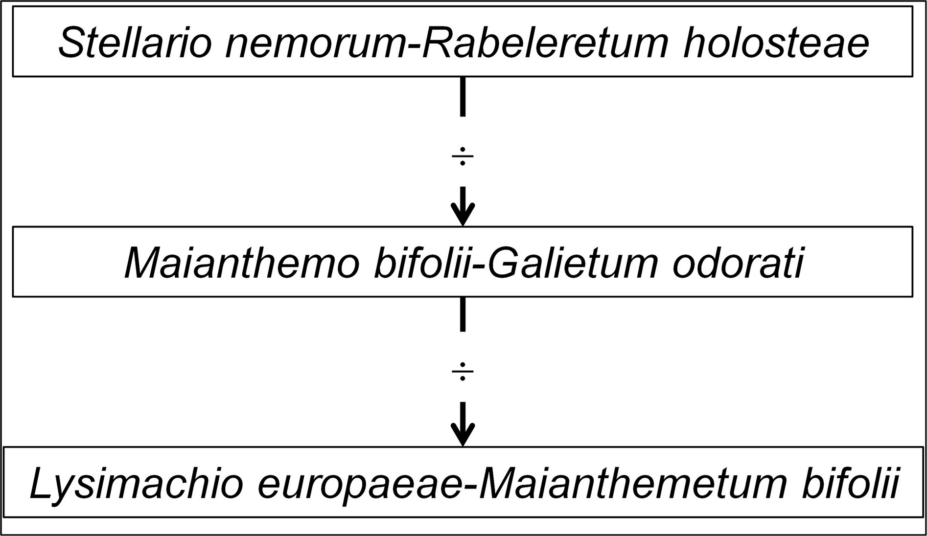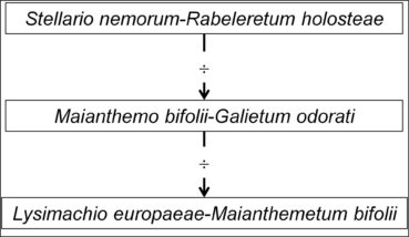Globalement, le tableau 7 décrit une série temporelle d’oligotrophisation (figure 1 ; ¸ symbolise l’oligotrophisation édaphique) menant du Stellario nemorum-Rabeleretum holosteae au Lysimachio europaeae-Maianthemetum bifolii, le Maianthemo bifolii-Galietum odorati s’avérant intermédiaire ; il montre la disparition progressive des taxons de l’hydromull et leur remplacement par ceux du moder/mor, alors que le groupe sociologique à Oxalis acetosella supporte l’oligotrophisation. Le troisième stade pourrait précéder une lande à Vaccinium myrtillus, mais celle-ci n’est pas évoquée par l’auteur néerlandais. On a là une nouvelle réalisation de la série structurale décrite antérieurement (de Foucault, 2020 : 67). Cette interprétation en terme temporel d’une série avant tout spatiale est autorisée par le fait qu’elle se déroule au sein d’un système caractérisé par une géologie et un climat à peu près homogènes : des matériaux d’origine glaciaire (moraines argileuses et dépôts fluvio-glaciaires) recouvrant un sous-sol d’âge crétacé et tertiaire (Nordmann, 1928), climat boréo-atlantique.