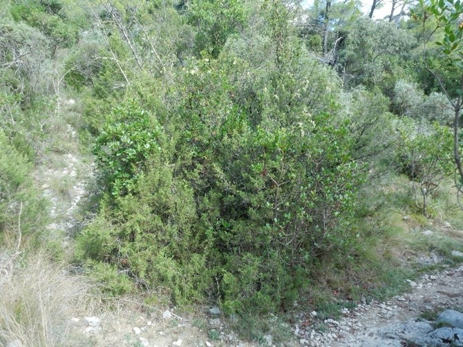 • Juniperus phoenicea *ph. 3, oxycedrus *o. 2, Amelanchier ovalis *o. 2, Buxus sempervirens 2, Phillyrea media 2, Arbutus unedo 1, Pistacia terebinthus 1, Smilax aspera 1, Quercus coccifera 1, Genista scorpius +, Lonicera implexa +, Rhamnus saxatilis *s. +, Phillyrea latifolia +, Rhamnus alaternus *a. +, Viburnum tinus +, Clematis flammula +,