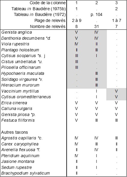 Le même auteur (1972a, 1975b) apporte des données plus précises sur les landes à Ericaceae du même massif, qui ne paraissent pas avoir été prises en compte dans la synthèse récente de Glemarec et al. (2025). Le tableau 10 synthétise cet apport. La synthèse de classe de 2025 montre que la première de ces landes (colonnes 1 et 2) peut se ranger dans l’Erico cinereae-Callunion vulgaris Glemarec et al. 2025, mais ne coïncide avec aucune des associations listées : Genistetum anglico-pilosae ass. nov. hoc loco, typus nominis hoc loco : relevé 3 du tableau 1 in Baudière (1975b, Colloq. Phytosoc. II : 103). La troisième (colonne 3) se rattache plutôt au Cytiso oromediterranei-Vaccinietum myrtilli B. Foucault 2017 décrit des Cévennes, qui se place dans le Cytiso oromediterranei-Ericion cinereae B. Foucault 2021.
