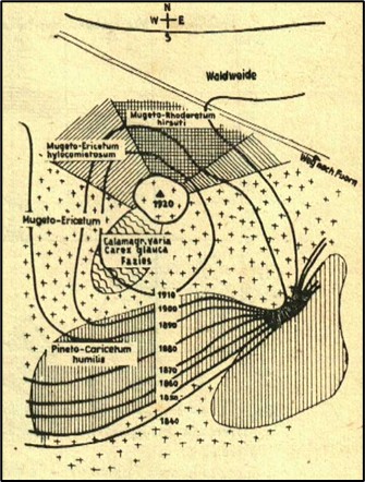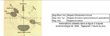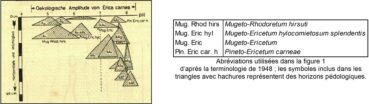 Un des pionniers dans l’étude des relations entre phytosociologie et pédologie, Pallmann (1948) met en relation les unités phytosociologiques connues à son époque avec des facteurs climatiques. Ainsi les figures 2 et 3 replacent ces unités selon l’exposition et par suite les facteurs photiques et thermiques ; on voit la situation du « Pineto-Caricetum humilis » en exposition sud, celle des variations du « Mugeto-Ericetum » plutôt à l’est et à l’ouest, celle du « Mugeto-Rhodoretum hirsuti » plutôt au nord. Selon l’approche développée ici, le « Pineto-Caricetum humilis » correspond aux sous-bois cryptophyto-chaméphytiques à aspect de pelouses basiphiles du type Melampyro catalaunici-Polygalion chamaebuxi, Galio corrudifolii-Arctostaphylion uvae-ursi et Onobrychido saxatilis-Ononidion rotundifoliae des Alpes occidentales, Festuco amethystinae-Polygalion chamaebuxi des Alpes centro-orientales. Le « Mugeto-Rhodoretum hirsuti » correspond aux sous-bois cryptophyto-chaméphytiques à aspect de landes acidiphiles à Vaccinium. Cette diversité est à mettre en relation avec l’activité biologique du sol selon le facteur thermique et ses conséquences sur le développement de l’humus : forte activité en exposition sud avec humus réduit de type mull calcique, faible activité en exposition nord avec accumulation d’humus de type moder ou mor, notamment sous l’influence du dépôt d’aiguilles de résineux acidifiantes.