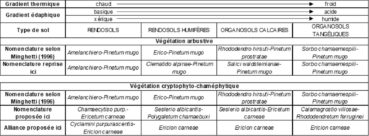 En 1996, Minghetti accompagne la description de ses cinq Pineta mugo de précisions écologiques, en particulier en ordonnant les associations qu’il a reconnues selon des gradients. On laissera de côté le « Rhododendro ferruginei-Pinetum prostratae » développé sur substrats cristallins (schistes, paragneiss, granites, tonalites, granodiorites) et volcaniques (rhyolites, rhyodacites) pour ne considérer que les quatre autres sur roche mère plus ou moins homogène pour la végétation (calcaires durs, dolomies, calcaires marneux), abordant ainsi une approche systémique. Ainsi ses figures 16 à 18 les placent selon des gradients traduits ici dans le tableau 8, en distinguant la végétation arbustive (reprise d’après de Foucault, 2021, § 2) et la végétation cryptophyto-chaméphytique ; les types de sols sont repris de Minghetti et al. (1997) qui ont adopté la nomenclature du Référentiel pédologique de l’AFES (1992, noms en majuscules selon la recommandation de ce document).