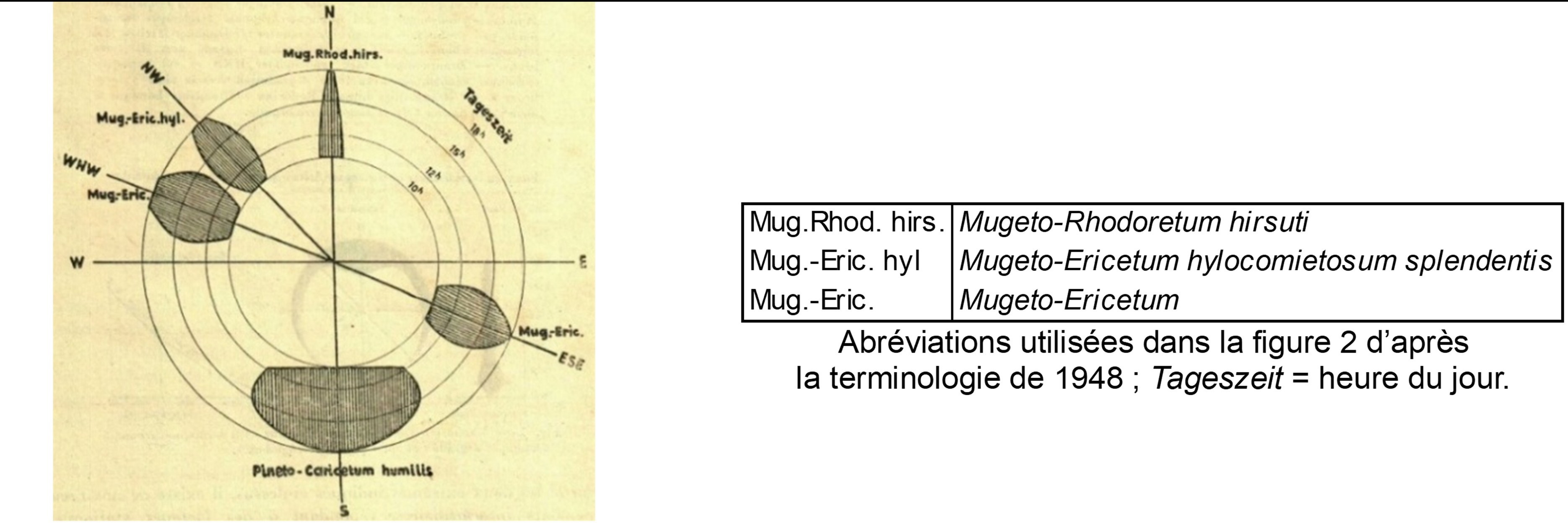 Un des pionniers dans l’étude des relations entre phytosociologie et pédologie, Pallmann (1948) met en relation les unités phytosociologiques connues à son époque avec des facteurs climatiques. Ainsi les figures 2 et 3 replacent ces unités selon l’exposition et par suite les facteurs photiques et thermiques ; on voit la situation du « Pineto-Caricetum humilis » en exposition sud, celle des variations du « Mugeto-Ericetum » plutôt à l’est et à l’ouest, celle du « Mugeto-Rhodoretum hirsuti » plutôt au nord. Selon l’approche développée ici, le « Pineto-Caricetum humilis » correspond aux sous-bois cryptophyto-chaméphytiques à aspect de pelouses basiphiles du type Melampyro catalaunici-Polygalion chamaebuxi, Galio corrudifolii-Arctostaphylion uvae-ursi et Onobrychido saxatilis-Ononidion rotundifoliae des Alpes occidentales, Festuco amethystinae-Polygalion chamaebuxi des Alpes centro-orientales. Le « Mugeto-Rhodoretum hirsuti » correspond aux sous-bois cryptophyto-chaméphytiques à aspect de landes acidiphiles à Vaccinium. Cette diversité est à mettre en relation avec l’activité biologique du sol selon le facteur thermique et ses conséquences sur le développement de l’humus : forte activité en exposition sud avec humus réduit de type mull calcique, faible activité en exposition nord avec accumulation d’humus de type moder ou mor, notamment sous l’influence du dépôt d’aiguilles de résineux acidifiantes.