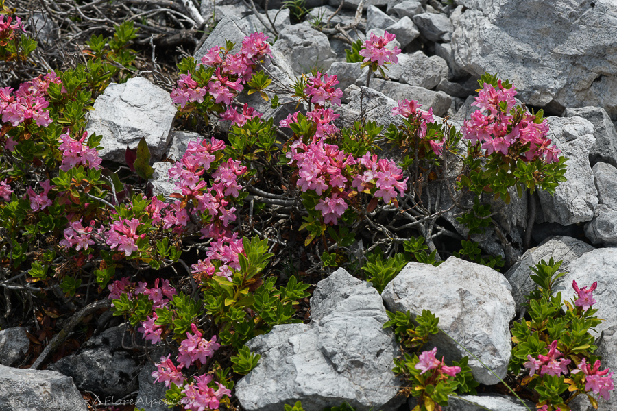 Les syntaxons 24 à 27 possèdent quelques liens avec les 18 à 23, mais affaiblis ; en 24 : le Chamaecytiso purpurei-Ericetum carneae ass. nov. hoc loco, typus nominis hoc loco : composante cryptophyto-chaméphytique du relevé 86 du tableau 1 in Minghetti (1996, Doc. Phytosoc., n. s., XVI hors texte) ; en 25 : le Thliphthiso purpureae-Ericetum carneae ass. nov. hoc loco, typus nominis hoc loco : composante cryptophyto-chaméphytique du relevé 24 du tableau 2 in Minghetti (2003, Braun-Blanquetia 33 : 16-17, en remplaçant Asperula purpurea par Thliphthisa p.). La colonne 26 est le Rhododendro hirsuti-Juniperetum alpinae Horvat ex Horvat et al. 1974 (Surina, 2013), la 27 l’Helianthemo nitidi-Ranunculetum scutati Lakušić et al. 1979 nom. inval., validé ici comme Helianthemo glabri-Ranunculetum thorae Lakušić et al. ex ass. nov. hoc loco, typus nominis hoc loco : relevé 1 du tableau XX in Lakušić et al. (1979, Drugi kongres ekologa Jugoslavije 1 : 658). La 28 est l’Aquilegio nigricantis-Rhododendretum hirsuti Lakušić et al. ex Surina 1983. La valeur de cette belle unité slovèno-croate (avec irradiation vers le Trentin ?) en tant qu’alliance est confortée par un cortège floristique caractéristique et différentiel rassemblant Cyclamen purpurascens, Betonica alopecuros, Genista januensis, Gentiana symphyandra, Chamaecytisus hirsutus, Rhodothamnus chamaecistus (Ericaceae ; photo 15), Melampyrum velibiticum, Lotus germanicus, Galium lucidum, Laserpitium siler, L. peucedanoides, Leontodon incanus, Thymus polytrichus, Helleborus niger, Valeriana tripteris, Carex mucronata, Campanula cespitosa, Grafia golaka (Apiaceae), l’Aquilegio nigricantis-Rhododendrion hirsuti Čarni & Mucina 2015 (Hacquetia 14 (2) : 291). Cette alliance n’apparaît toutefois pas absolument homogène, de grands vides floristiques marquant les colonnes 26 à 28, l’une d’elles (la 28) correspondant justement au type de l’alliance. Elle devra être revue sur la base de nouveaux tableaux.
