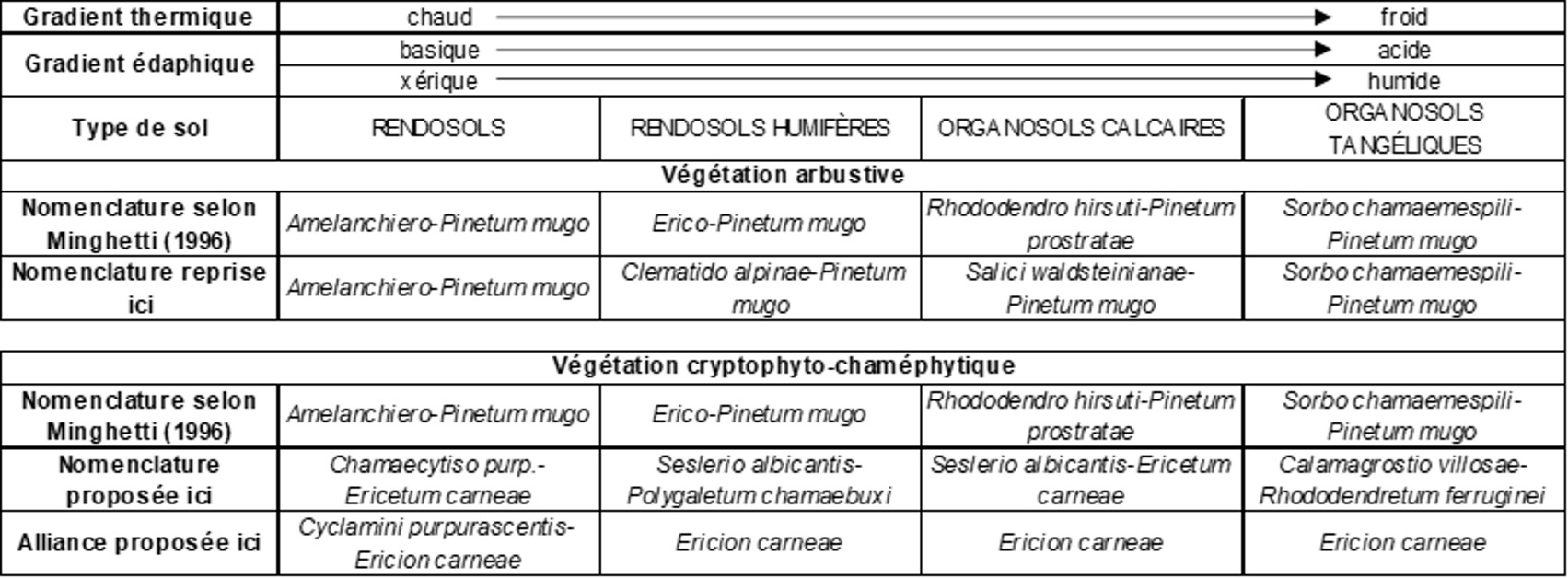 En 1996, Minghetti accompagne la description de ses cinq Pineta mugo de précisions écologiques, en particulier en ordonnant les associations qu’il a reconnues selon des gradients. On laissera de côté le « Rhododendro ferruginei-Pinetum prostratae » développé sur substrats cristallins (schistes, paragneiss, granites, tonalites, granodiorites) et volcaniques (rhyolites, rhyodacites) pour ne considérer que les quatre autres sur roche mère plus ou moins homogène pour la végétation (calcaires durs, dolomies, calcaires marneux), abordant ainsi une approche systémique. Ainsi ses figures 16 à 18 les placent selon des gradients traduits ici dans le tableau 8, en distinguant la végétation arbustive (reprise d’après de Foucault, 2021, § 2) et la végétation cryptophyto-chaméphytique ; les types de sols sont repris de Minghetti et al. (1997) qui ont adopté la nomenclature du Référentiel pédologique de l’AFES (1992, noms en majuscules selon la recommandation de ce document).