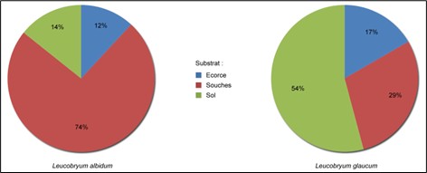 Trois échantillons seulement proviennent de milieux de landes, sur affleurements rocheux : deux sur rocher, attribués respectivement à L. albidum et L. glaucum, et un sur le sol, entre des rochers, attribué à L. glaucum. Les soixante-sept autres échantillons proviennent de milieux forestiers dominés par des feuillus, principalement chênes, hêtres et châtaigniers. Parmi ces échantillons, un seul a été récolté sur rocher, dans une carrière de schiste en sous-bois, et a été déterminé comme L. glaucum. Les soixante-six échantillons restants ont été récoltés sur écorce, sur souches ou au sol (figure 1). L. albidum (12 %) et L. glaucum (17 %) présentent des proportions comparables sur écorce. En revanche, L. albidum est largement majoritaire sur souches (74 %), tandis que L. glaucum prédomine au sol (54 %).