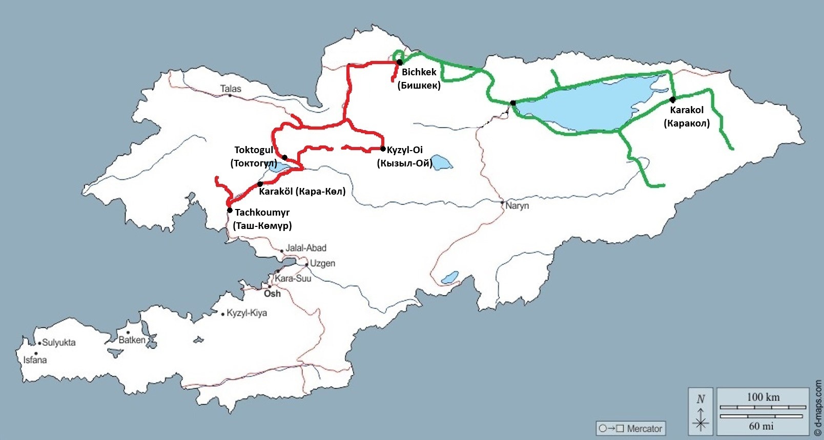 Nous atteignons Tachkoumyr (ou Tach-Koumyr) pour nous poser dans le seul hôtel de la ville. L’un et l’autre ont un charme tout soviétique, sorti d’un autre âge. Le nom de la ville signifie « Pierre de charbon ». Fondée en 1943, Tachkoumyr est devenue une ville industrielle importante de l’Asie centrale soviétique. C’était surtout une ville minière, mais elle avait aussi une usine de cigarettes et d’autres industries qui complétaient la production des mines de charbon. Une ligne de chemin de fer a été construite transportant le charbon aux quatre coins de l’Union soviétique. Les barrages construits sur le fleuve Naryn, transformèrent ce qui était jadis un ruisseau en un grand fleuve. Les résidents attestent également d’un changement de climat, qu’ils attribuent aux barrages. Malgré la présence des barrages et des usines hydroélectriques, Tachkoumyr n’est toujours pas fournie en électricité à 100 %. Nous échapperons toutefois aux coupures d’électricité. Les mines sont fermées pour la plupart, la voie de chemin de fer abandonnée, le tout a incontestablement un aspect de ville fantôme.