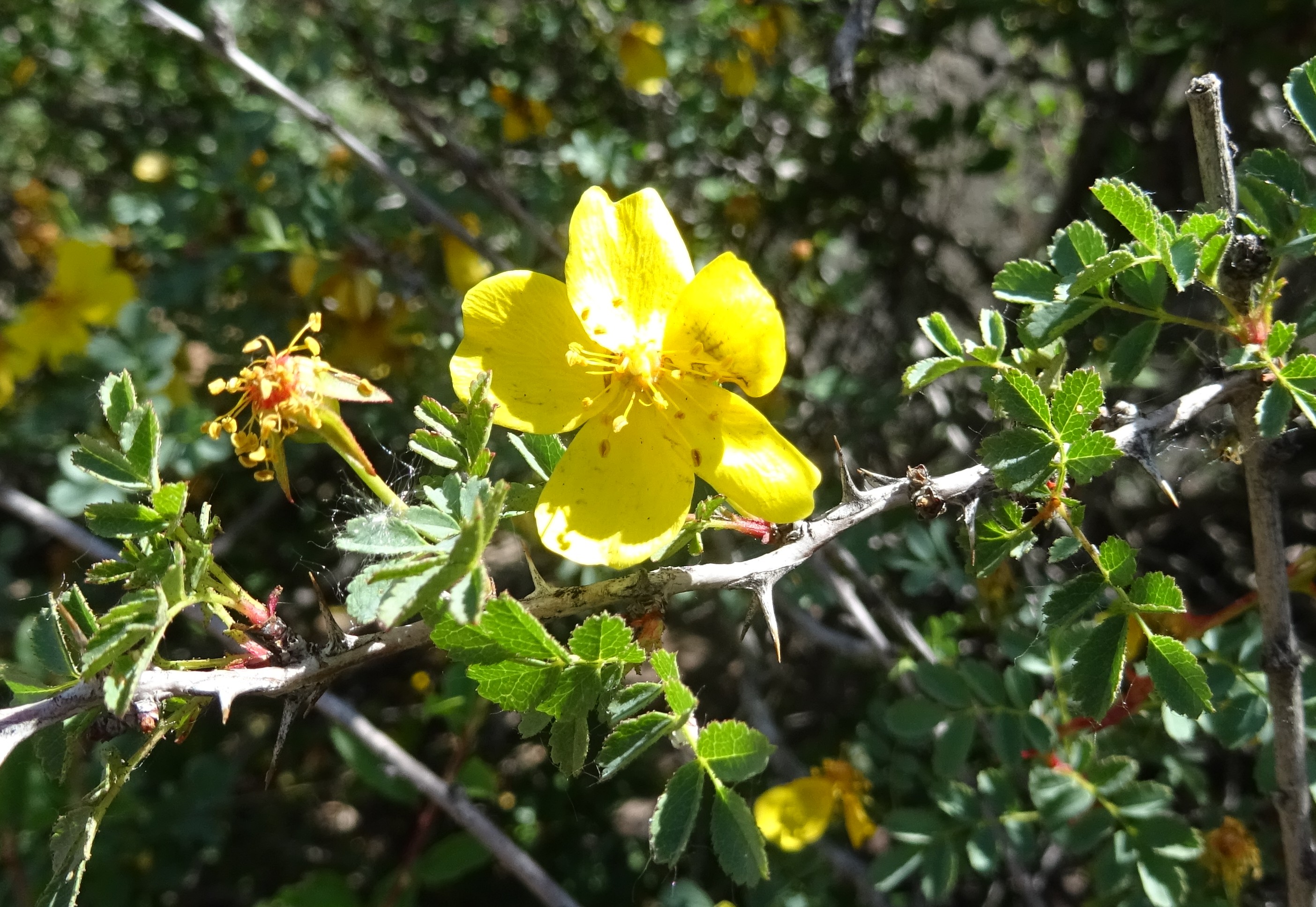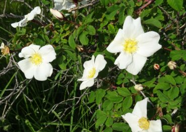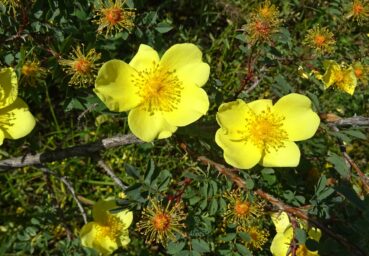 À quelques encablures de là (42° 37′ 13.9″ N, 74° 29′ 10.7″ E ; alt. 1 742 m), toujours près de la rivière Alà Artxà, c’est un rosier magnifique qui nous arrête (photo 9). Cette plante à grandes fleurs jaunes appartient à la section Pimpinellifoliae, à stipules étroites et oreillettes divergentes et à fleurs solitaires et sépales entiers. Assez commun dans cette partie du pays, il s’agit de Rosa platyacantha Schrenk (PCPR021650), elle aussi espèce particulièrement ornementale, aux pieds de laquelle nous trouvons Asperugo procumbens L. et ses fruits caractéristiques.