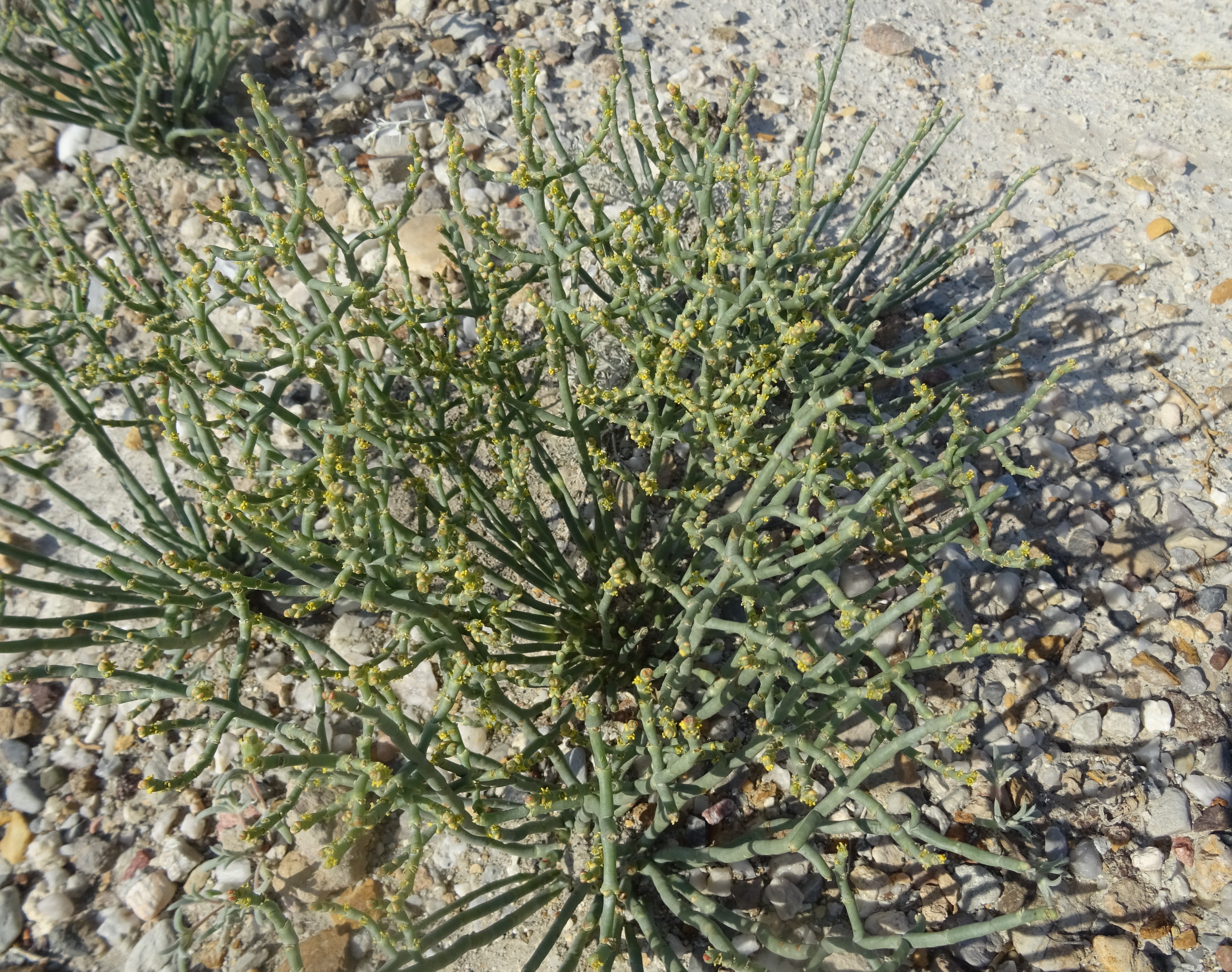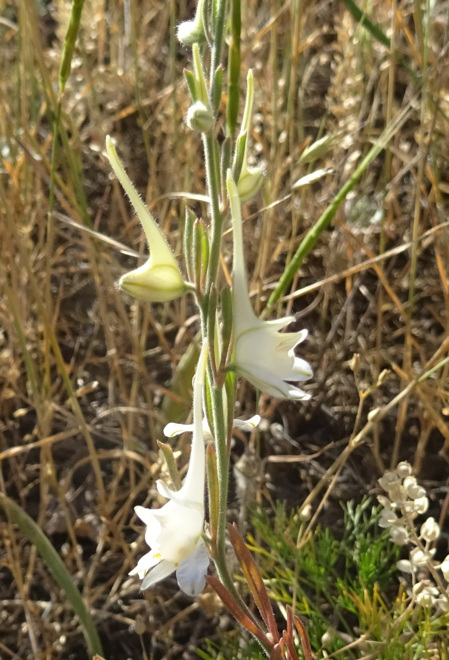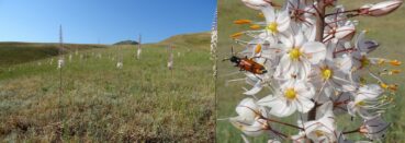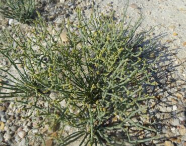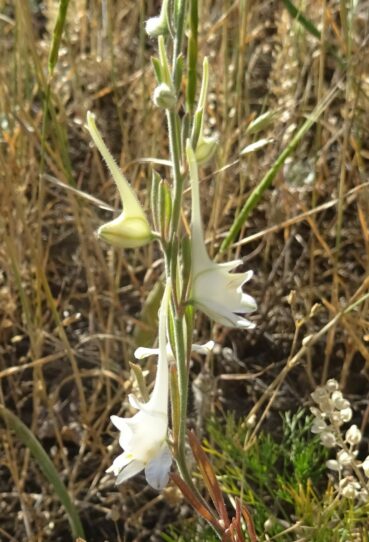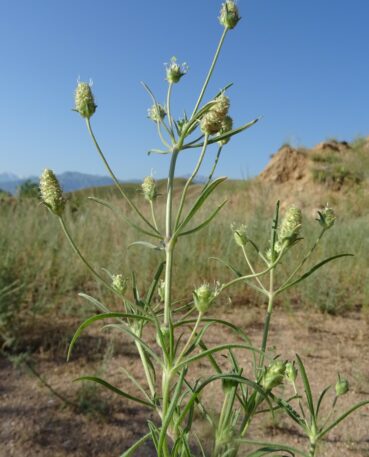 Plus loin, peu après la sortie sud-est de Torkent, au nord du lac de Toktogul (41° 49′ 43.0″ N, 73° 10′ 21.0″ E ; 1 040 m), nous longeons de vastes steppes vallonnées. Les monts du Tian Shan apparaissent dans le fond. L’ensemble est du plus bel effet et nous rappelle les plaines de l’Ouest américain (photo 69). Nous nous y arrêtons évidemment, ce d’autant qu’elles sont couvertes d’un Eremurus à fleurs blanches. Il s’agit de l’endémique E. tianschanicus Pazij & Vved. ex Pavlov (planche 27 ; PCPR002692 & PCPR021487), parfaitement épanoui à cette date. D’autres espèces remarquables sont à noter, notamment Delphinium rugulosum Boiss., à fleurs blanches (photo 70 ; PCPR021763 & PCPR021764), Camelina microcarpa Andrz. ex DC. (PCPR021765 & PCPR021766), Sideritis montana, Onobrychis pulchella (17* ; PCPR021767), la steppique Ceratocarpus arenarius (photo 71) et la Thymelaeaceae annuelle Diarthron vesiculosum (Fisch. & C.A. Mey. ex Kar. & Kir.) C.A. Mey. (PCPR021982 & PCPR021983).