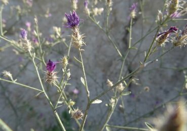Nous revoyons évidemment la quasi-totalité des espèces vues le matin, mais ajoutons à nos observations plusieurs taxons remarquables, eux aussi endémiques. Le premier est une amaranthacée steppique d’aspect très particulier, Anabasis truncata (Schrenk) Bunge (photo 104 ; PCPR021808), plante ramifiée sur une souche très épaisse. La deuxième est la troisième labiée du genre Lagochilus que nous observons, l’endémique L. occultiflorus Rupr., à dents du calice largement lancéolées, d’environ 15 mm de long et à tube légèrement oblique (PCPR021805). Enfin, nous notons Centaurea virgata Lam. subsp. squarrosa (Boiss.) Gugler (photo 105 ; PCPR021806 & PCPR021807), à nombreux petits capitules ovales à appendices recourbés. Outre Linum strictum L., toutes les autres espèces ont été vues le matin. Nous retournons dormir à Tachkoumyr, au même hôtel que la veille.