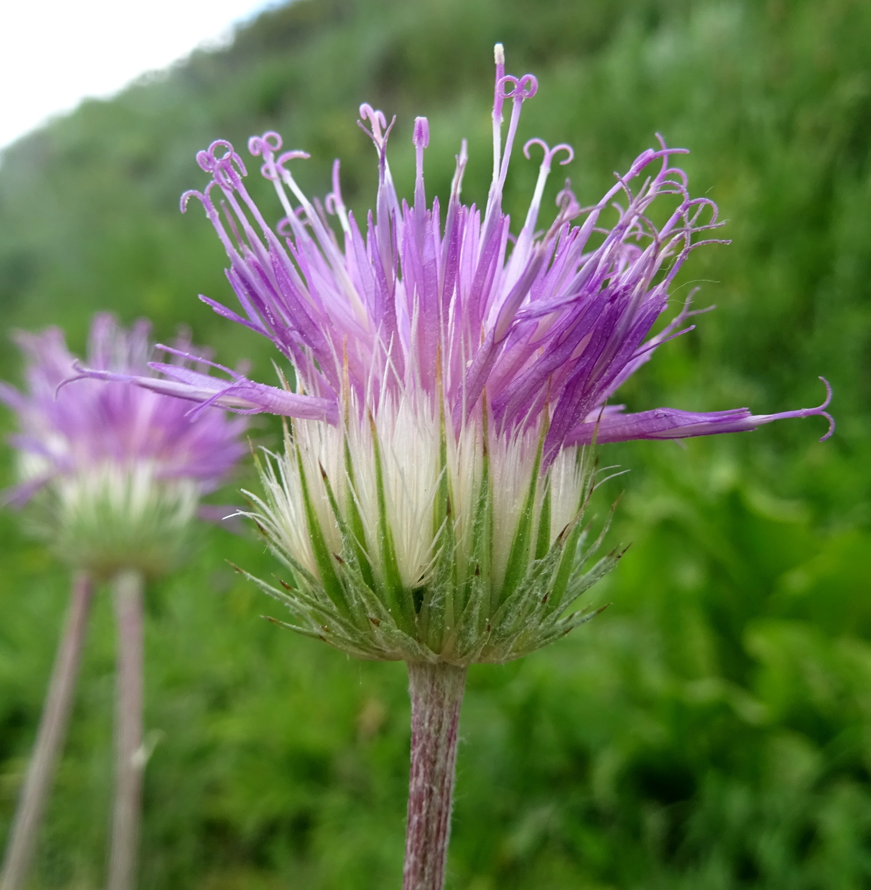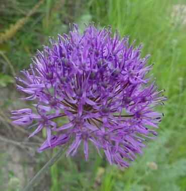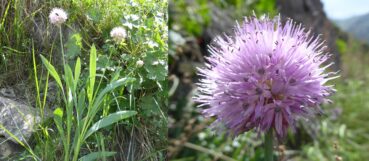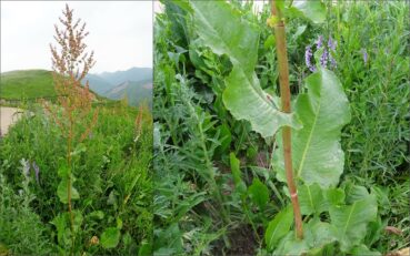 Le premier arrêt se fait à 1 984 m d’altitude au niveau de Burlykiya (41° 53′ 33.4″ N, 73° 23′ 20.9″ E). Nous y retrouvons de magnifiques populations de Dictamnus angustifolius (PCPR021865 & PCPR021883) et plusieurs espèces déjà vues les jours précédents comme Cerastium davuricum, Allium aflatunense (à inflorescences grosses comme des boules de pétanque ; PCPR021840 & PCPR021841), Leonurus turkestanicus var. turkestanicus, Eremurus fuscus, Aconitum leucostomum, Rosa platyacantha, Cynoglossum viridiflorum, Astragalus sieversianus (toujours en fruits ; PCPR021871 & PCPR021872) et des espèces bien communes telles que Lathyrus pratensis L., Lathyrus tuberosus L., Vicia sepium L., Silene vulgaris L., Echium vulgare L. et Vicia tenuifolia Roth. Mais c’est aussi l’occasion pour nous de découvrir quelques nouveaux taxons, comme les polygonacées Rumex paulsenianus Rech. f. (grande patience à fruits sans callosité nette renflée ; planche 50 ; PCPR021868) et Koenigia coriaria (Grig.) T.M. Schust. & Reveal (= Polygonum c. Grig. ; planche 51 ; PCPR021866), qui ressemble à K. alpina (All.) T.M. Schust. & Reveal. Nous observons également Hesperis sibirica L. (grande plante couverte de poils glanduleux ; photo 106 ; PCPR021863 & PCPR021864) et une jurinée que nous identifions comme Jurinea multiloba Iljin (photo 107). Enfin, nous récoltons un ail rose évoquant Allium chychkanense R.M. Fritsch (photo 108), mais que nous n’identifierons pas avec certitude.