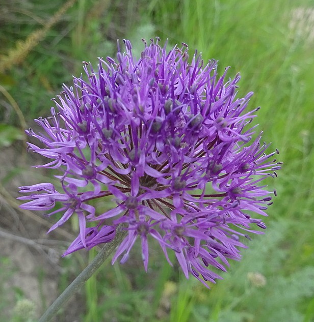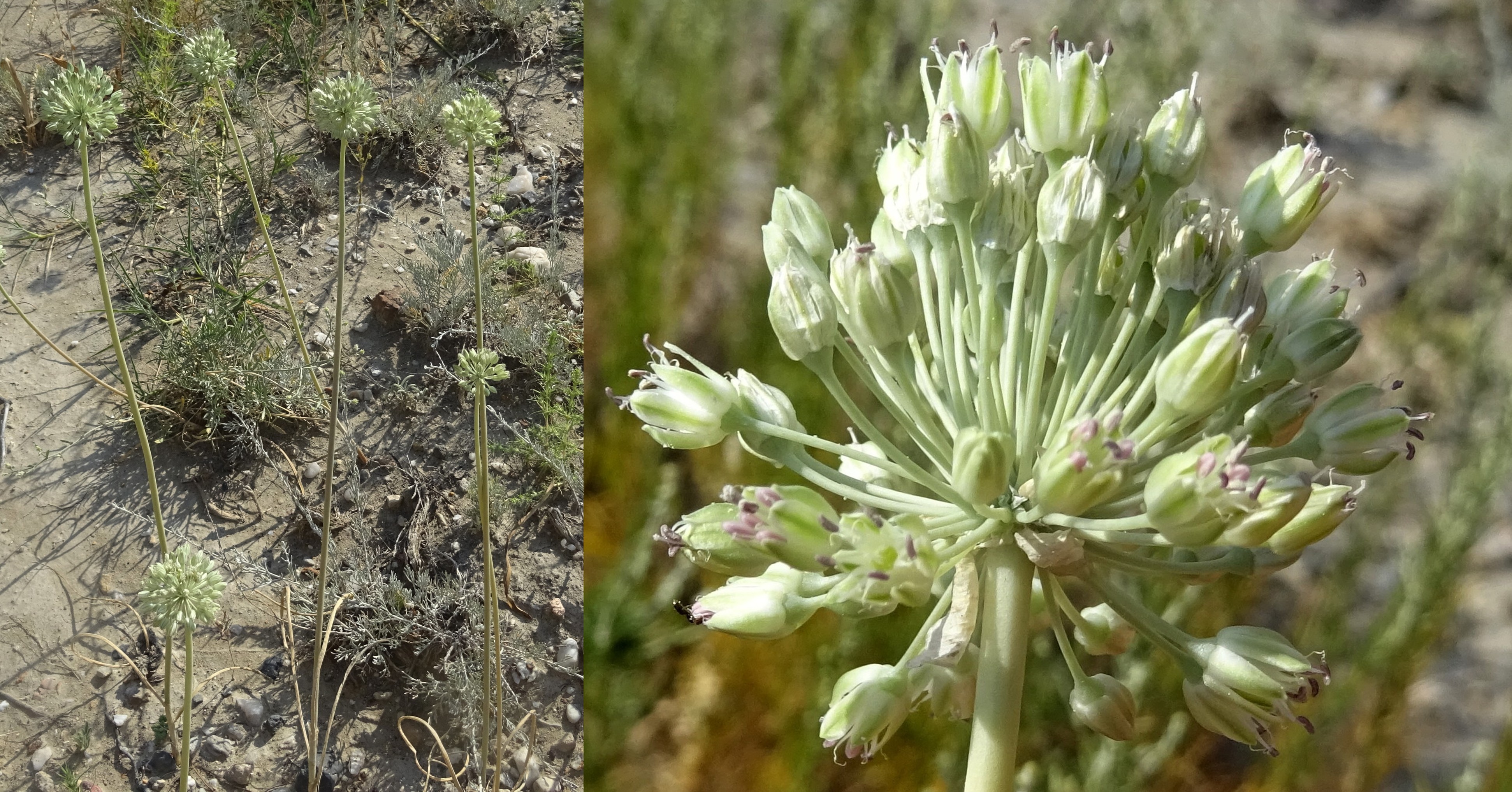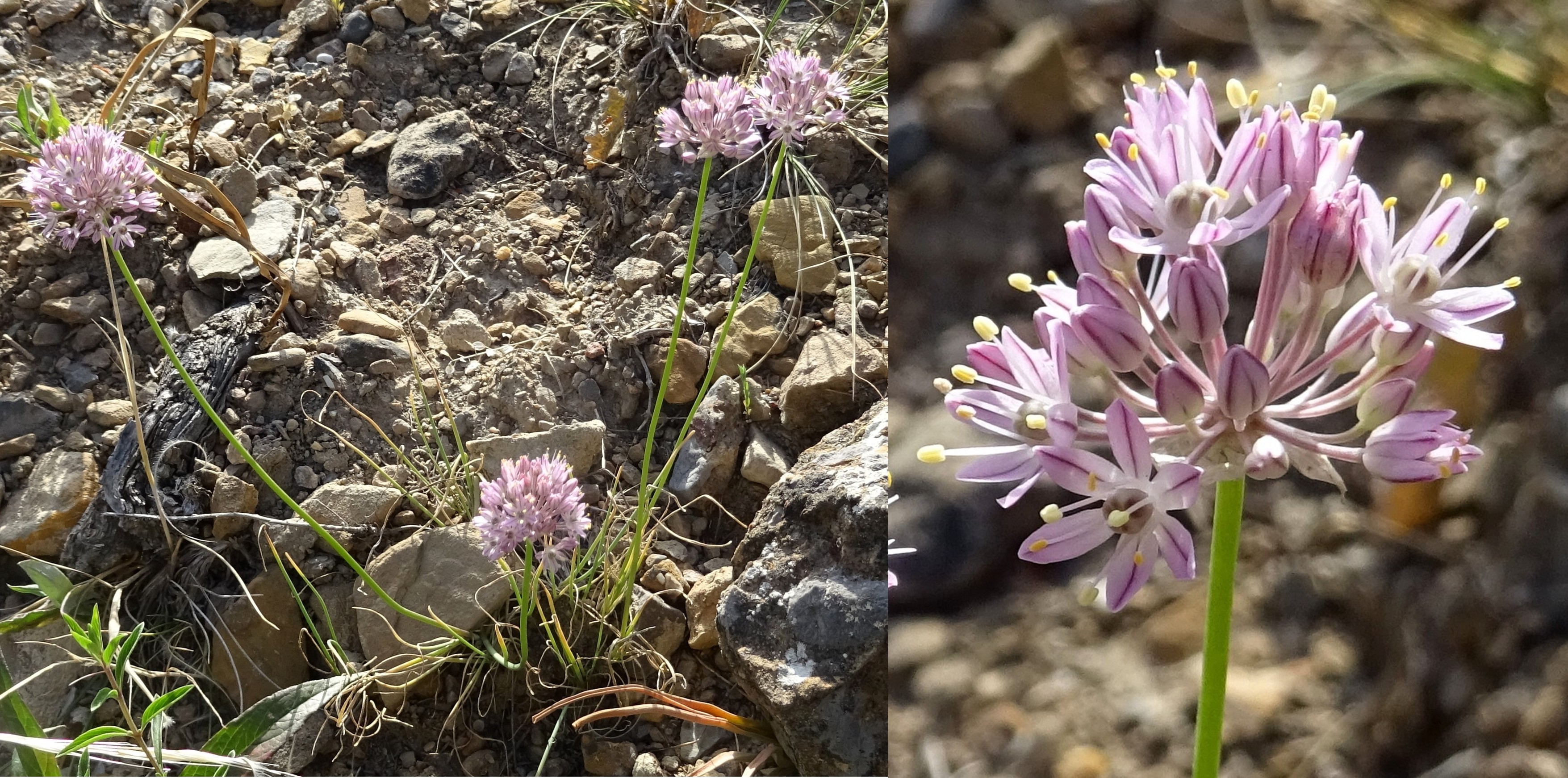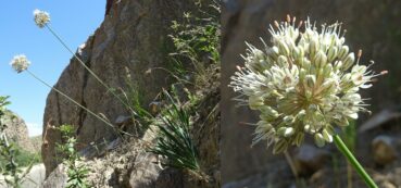 Nous ferons ensuite quelques arrêts dans ce même secteur, au bord de la route M41, sur des talus et éboulis fins. Le premier (42° 36′ 21.5″ N, 73° 53′ 01.1″ E ; 1 315 m) est consacré à l’observation d’un rosier à petites fleurs blanches et cynorrhodons sphériques, Rosa beggeriana Schrenk ex Fisch. & C.A. Mey. (photo 12 ; PCPR021936 & PCPR021937) et le deuxième à celle d’un ail bien connu des jardiniers, ici dans son aire naturelle, Allium karataviense Regel (photo 13), bien fructifié et accompagné sur des éboulis fins par Onosma irritans Popov, une autre endémique d’Asie centrale (photo 14 ; PCPR021666 & PCPR021667).