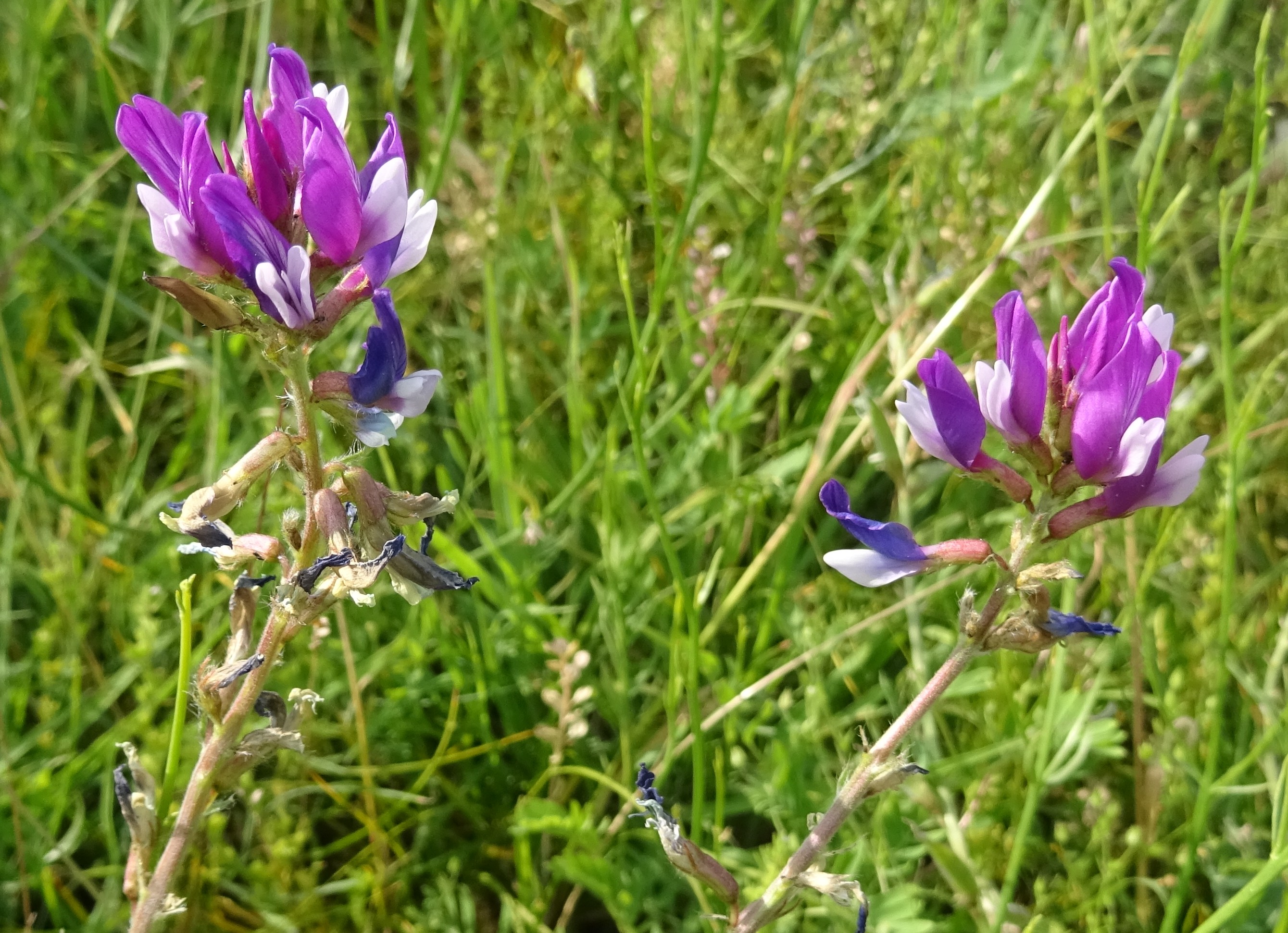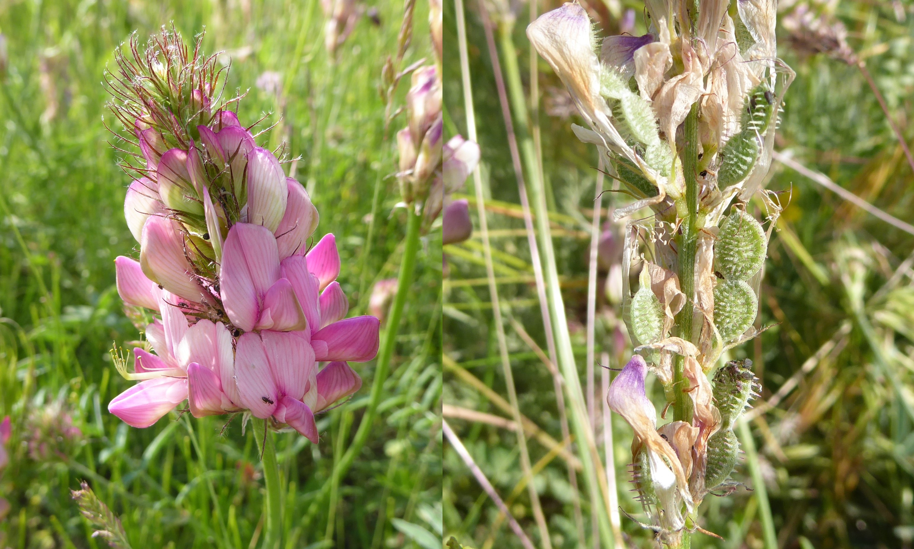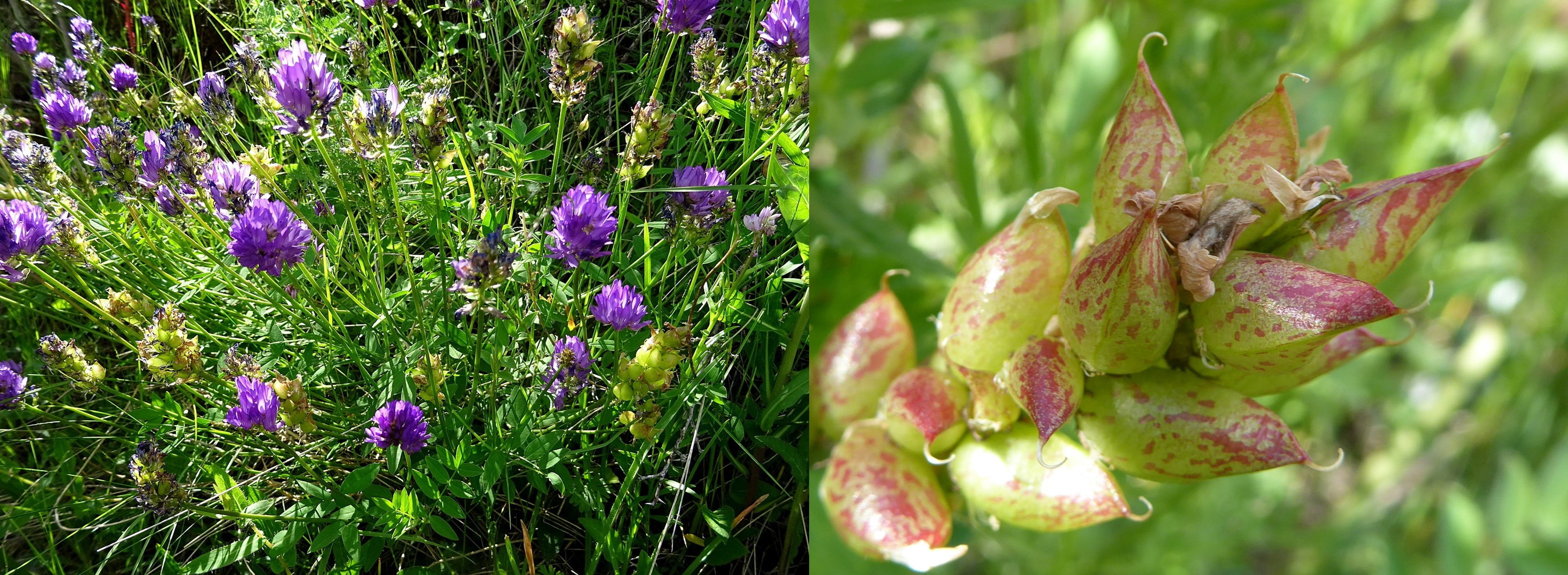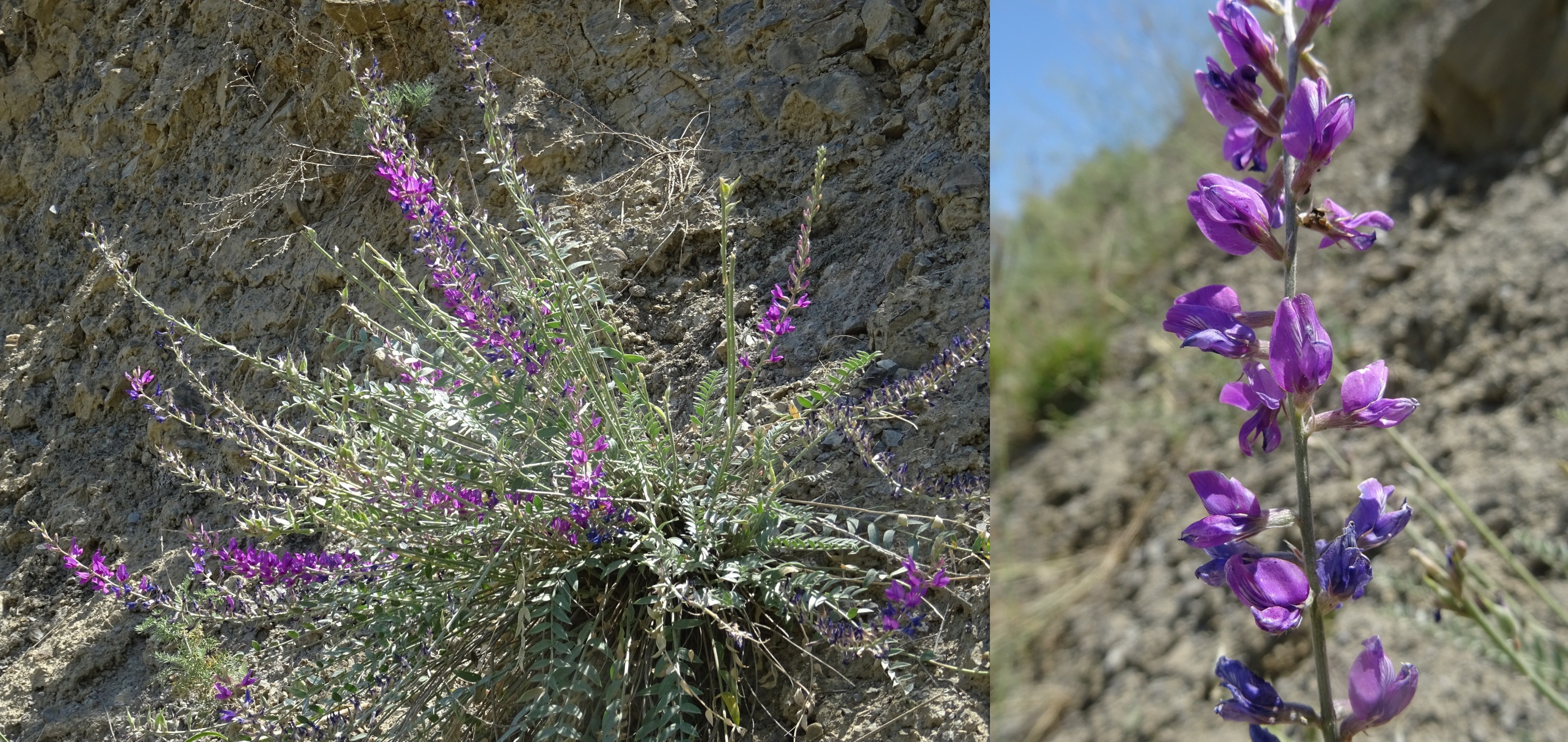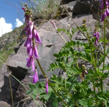 Notre dernier arrêt dans cette superbe vallée, après avoir noté la présence de Vicia tenuifolia Roth et de Dodartia orientalis L. (7*) en bord de route (famille des Mazaceae), se fait sur un coteau plus sec surplombant la route (42° 39′ 13.9″ N, 74° 29′ 38.1″ E ; 1 584 m). C’est l’occasion de voir pour la première fois Hedysarum songaricum Bong. (PCPR021656 & PCPR021657 ; planche 3), aux grandes corolles roses, ainsi qu’un Oxytropis de la section Eumorpha, à longues inflorescences violacées. Il s’agit d’O. ferganensis Vass., endémique de la région du Tian Shan (photo 11 ; PCPR021848).