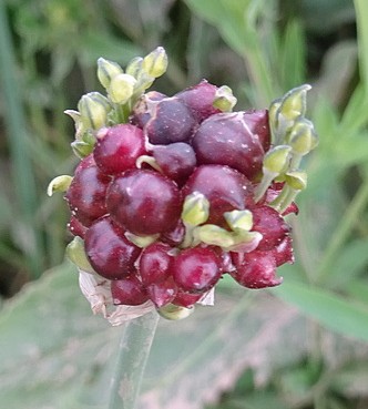 La flore des lieux est particulièrement riche. Outre la plupart des espèces vues lors de l’arrêt précédent, nous découvrons quatre autres taxons. Tout d’abord une grande ligulaire à feuilles cordées, Vickifunkia thomsonii (C.B. Clarke) C. Ren, L. Wang, I.D. Illar. & Q.E. Yang (= Ligularia t. (C.B. Clarke) Pojark), à inflorescence ramifiée et involucre cylindrique, plus long que large (planche 53 ; PCPR021870 & PCPR021897). Le deuxième est une caryophyllacée annuelle à deux styles, Lepyrodiclis holosteoides (C.A. Mey.) Fenzl ex Fisch. & C.A. Mey. (PCPR021873 & PCPR021874), à corolle blanche et pétales peu échancrés obovales. Le troisième est une crucifère à fruits dressés appartenant à l’ex-genre Stroganowia, désormais traitée sous le binôme Lepidium karelinianum Al-Shehbaz (= L. kirilowii Trautv. = Stroganowia intermedia Kar & Kir. ; photo 109 ; PCPR021891 & PCPR021892). Enfin, un ail à bulbilles violacées et petites fleurs bleu pâle s’avère être Allium caeruleum Pall. (photo 110 ; PCPR021894, PCPR021895 & PCPR003955). Sont également présents ici Euclidium syriacum (L.) W.T. Aiton (PCPR021893 & PCPR021973), Lamium album L. (se rapportant à L. turkestanicum Kuprian. ; 88* ; PCPR022159), Leonurus turkestanicus var. turkestanicus, Astragalus sieversianus et Arctium umbrosum. Nous redescendons vers Toktogul par la même route et nous nous arrêtons deux nouvelles fois dans ces magnifiques prairies. Le premier arrêt a lieu à 1 645 m d’altitude (41° 54′ 25.7″ N, 73° 21′ 00.2″ E).