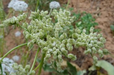 Le dernier arrêt avant de retrouver les zones rocheuses se fait dans une mégaphorbiaie située à 1 515 m d’altitude (41° 54′ 44.5″ N, 73° 19′ 37.9″ E). Elle nous permet de revoir Betonica betoniciflora, Campanula glomerata L. (PCPR002859 & PCPR021879), Allium caeruleum (PCPR021896 & PCPR003954), Salvia deserta, Eremurus tianschanicus, Lagochilus platycalyx et de découvrir Lomelosia songarica (Schrenk ex Fisch. & C.A. Mey.) Soják, à larges inflorescences roses (photo 112), ainsi que Eremodaucus lehmannii Bunge, apiacée à fruits fortement ornementés (photo 113 ; PCPR020894, PCPR020895 & PCPR003276).