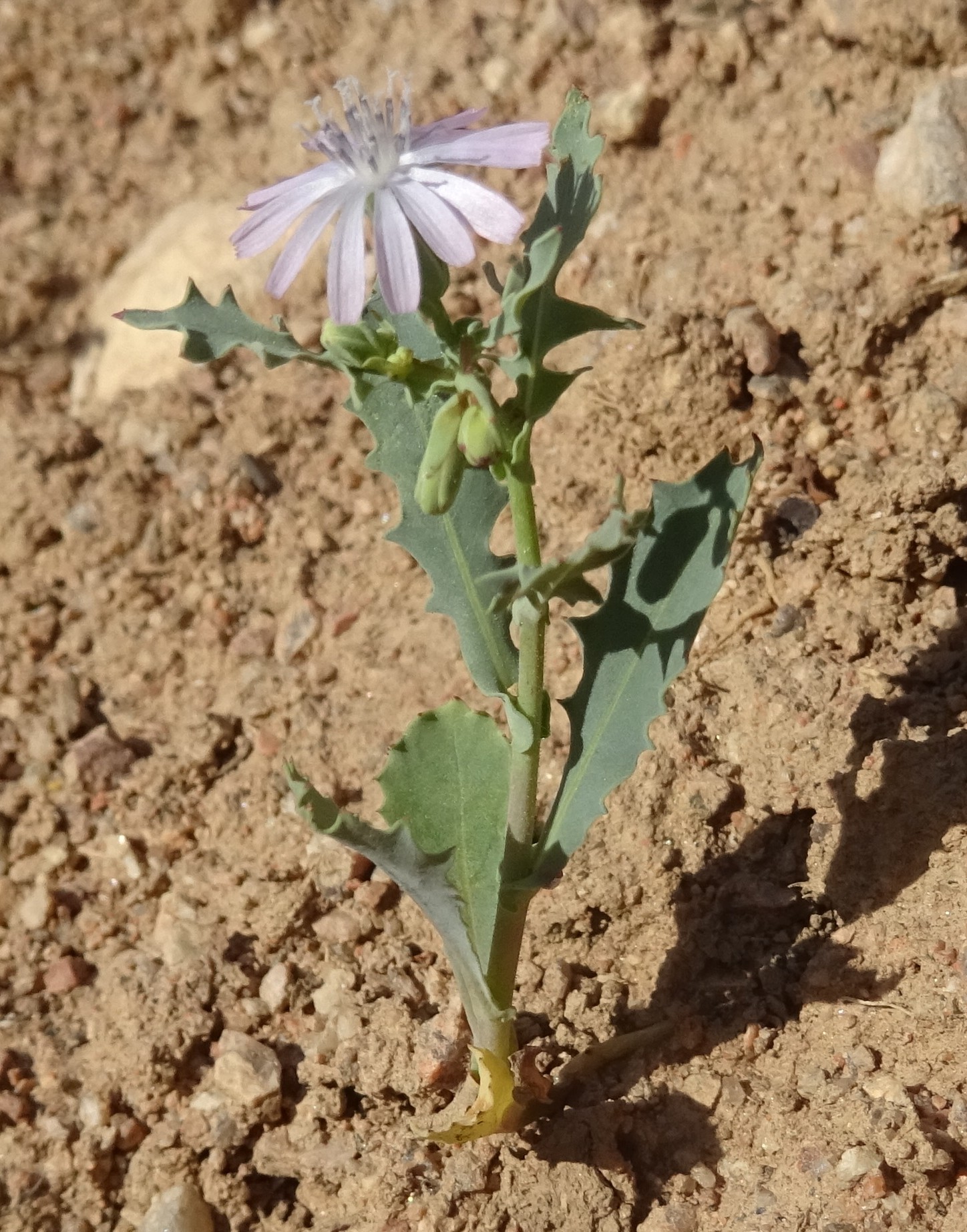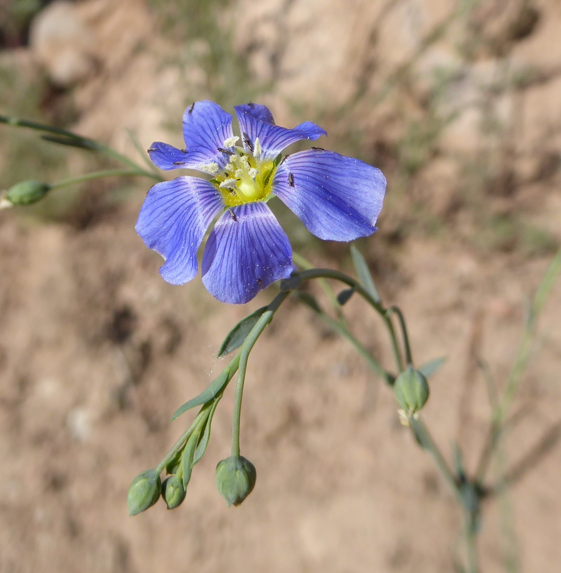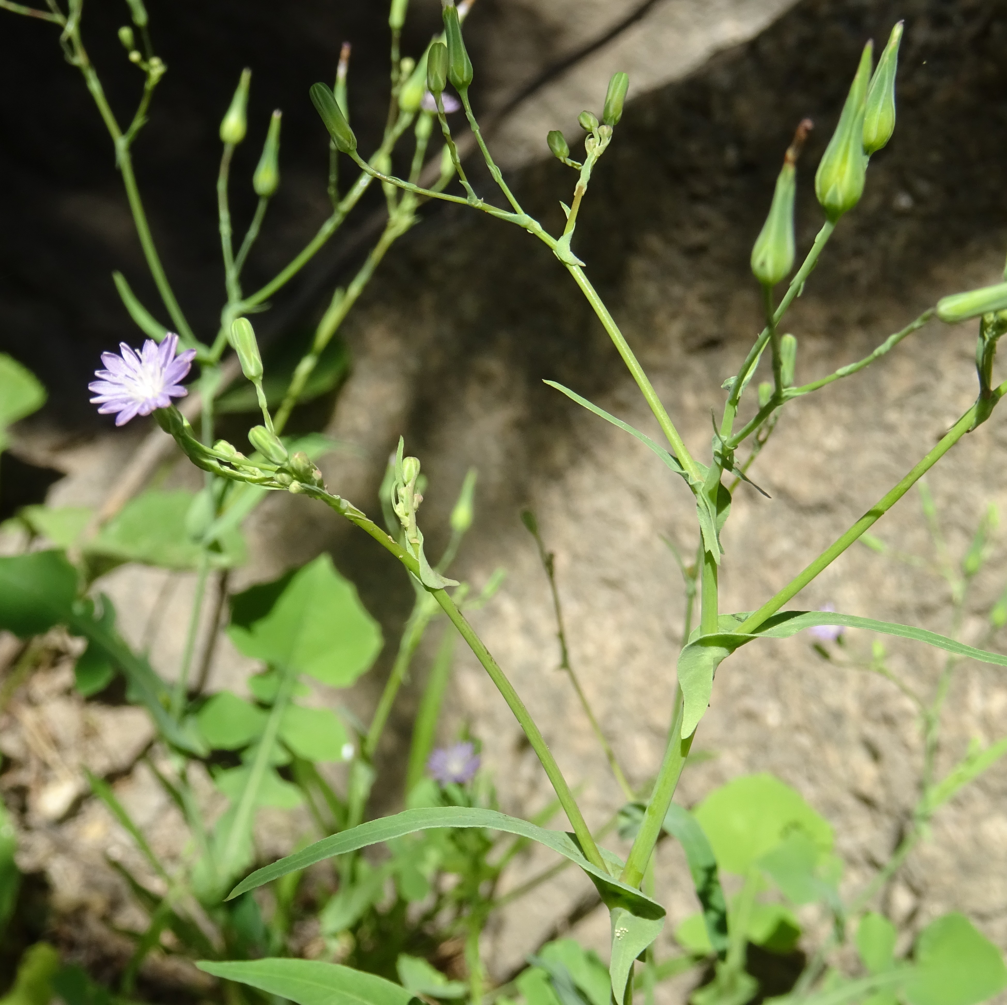 Nous bénécifions en ce lundi matin d’un temps splendide, comme ce sera le cas pendant presque tout le voyage. Cette journée sera très dense mais perturbée par des aléas difficiles à anticiper. Elle commence par un arrêt assez long à la sortie sud de Kyzyl-Oi, toujours le long de la rivière Kokemeren, pour explorer plus longuement les éboulis fins bordant la piste A367 (41° 56′ 25.4″ N, 74° 09′ 38.8″ E ; alt.1 747 m). Nous y retrouvons les espèces vues la veille au soir, mais également d’autres endémiques d’Asie centrale, comme Lactuca undulata Ledeb., annuelle à fleurs lilas (photo 45 ; PCPR021675), Linum pallescens Bunge (photo 46 ; PCPR021676 & PCPR021677), Caragana leucophloea Pojark. (planche 14 ; 193* ; PCPR021671 & PCPR021672), Tragopogon marginifolius Pavlov (35* ; PCPR022023), Lagochilus platycalyx Schrenk ex Fisch. & C.A. Mey. (43* ; PCPR021959), Allium caricifolium Kar. & Kir. (40* ; PCPR019004, PCPR001881 & PCPR022051), Clematis songorica Bunge (53* ; PCPR02207, PCPR022028 & PCPR022065) ainsi que des plantes à aire plus large comme Medicago medicaginoides (Retz.) E. Small (PCPR021943), Descurainia sophia (L.) Webb ex Prantl, Peganum harmala L. ou Nonea caspica (Willd.) G. Don. Nous nous arrêterons plus longuement sur un astragale de la section Dissitiflori, sous-arbrisseau ici en pleine floraison, Astragalus managildensis B. Fedtsch. (planche 15 ; PCPR021673 & PCPR021674). Cette espèce n’est présente qu’au Kirghizistan et au sud du Kazakhstan. Nous la reverrons plusieurs fois au cours de notre voyage ; elle n’est manifestement pas rare dans cette partie du pays.