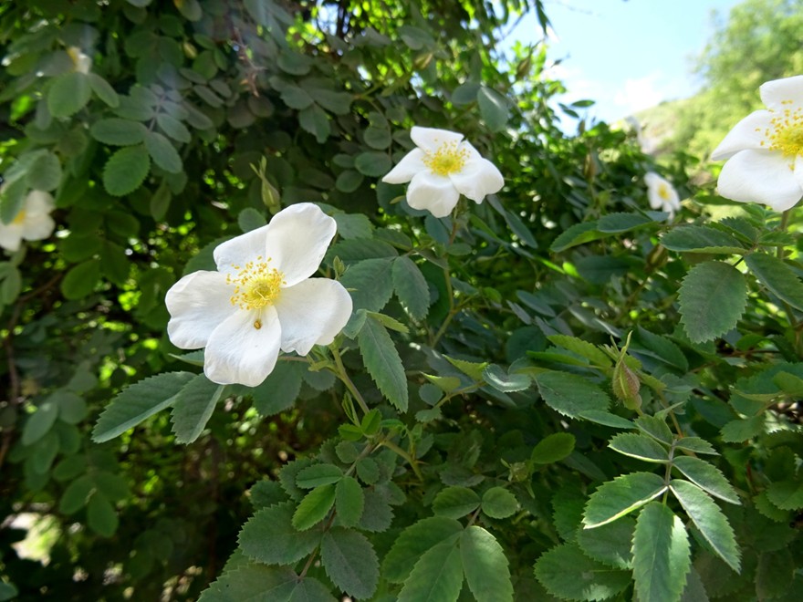 Toujours dans la même zone un autre Rosa, genre particulièrement diversifié en Asie centrale, forme également de remarquables arbustes. Celui-ci est à fleurs blanches et calices glabres lavés de rouge (photo 10). Il appartient à la section Cinnamomeae DC. Il s’agit de Rosa alberti Regel (PCPR021655), que nous avions déjà observé en 2022 près du lac Ysyk-Köl (156* ; PCPR022212 & PCPR022213).
