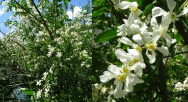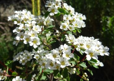 Nous parvenons au bord du lac de Sary-Chelek, où de nombreuses familles pique-niquent en cette magnifique journée de printemps. L’endroit est particulièrement agréable (photo 102). Sur les berges du lac nous observons un arbuste magnifiquement fleuri et odorant (planche 49), la rosacée Exochorda racemosa (Lindl.) Rehder (= Amelanchier r. Lindl.) ; cette plante est cultivée dans les jardins et commercialisée dans les pépinières sous le nom de « buisson de perles » en raison de ses boutons floraux évoquant des colliers de perles. Après un moment de repos au bord de ce splendide lac, nous décidons de rebrousser chemin vers Tachkoumyr.
