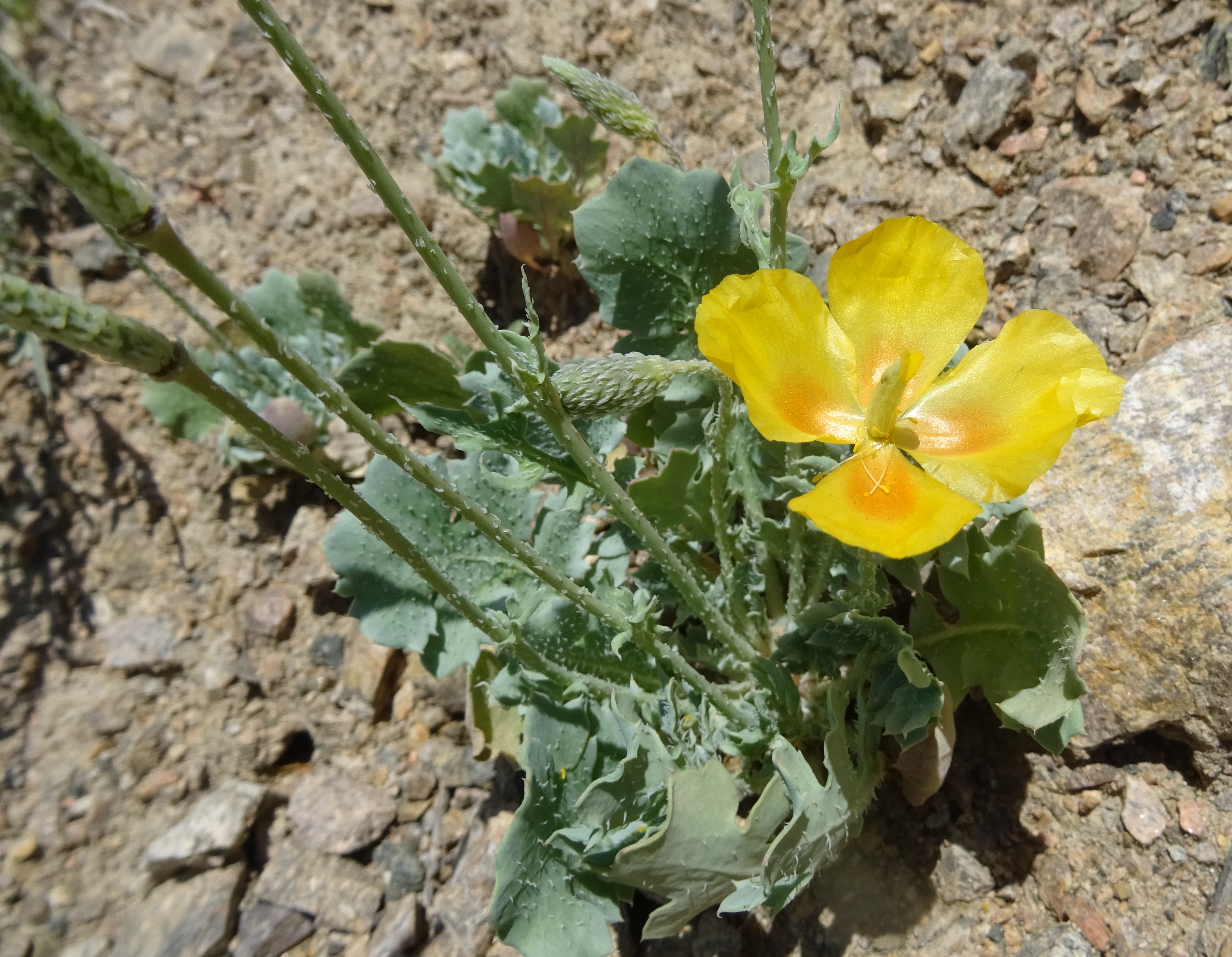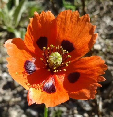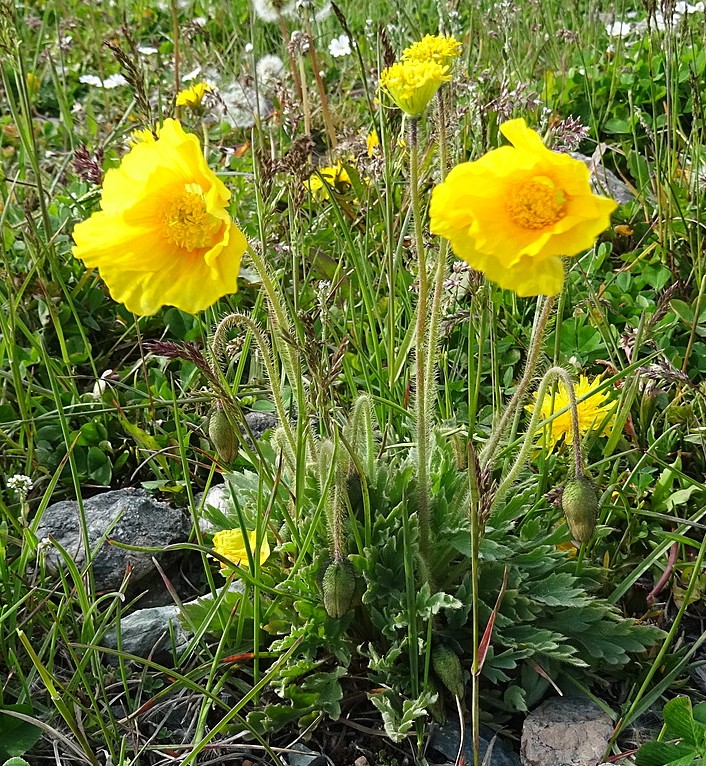 Nous terminons l’exploration de cette zone par une prairie alpine rocailleuse située sous les premiers lacets situés sous le tunnel sur le versant sud du col (42° 19′ 19.0″ N, 73° 49′ 16.2″ E ; 2 975 m), pour observer Oreomecon crocea (Ledeb.) Banfi, Bartolucci, J.-M.Tison & Galasso (photo 40 ; 108* ; PCPR021694 & PCPR021695) et à nouveau des tapis de Dracocephalum nutans (PCPR021693).