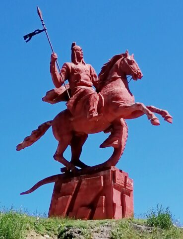 Au carrefour entre la M41 et la route montant au Otmok Pass, nous nous arrêtons devant la monumentale statue équestre de Manas (photo 126). Il est le héros de l’épopée kirghize du même nom qui a permis l’unification des Kirghizes. Avec quelque 500 553 lignes de vers, l’épopée de Manas est la plus longue au monde. Elle narre les exploits du héros Manas. Dans les versions les plus complètes de Manas, la partie concernant le petit-fils de Manas, Seitek, est complétée par des récits concernant son fils Kenen et ses petits-fils Alymsyrak et Kulansyrak.