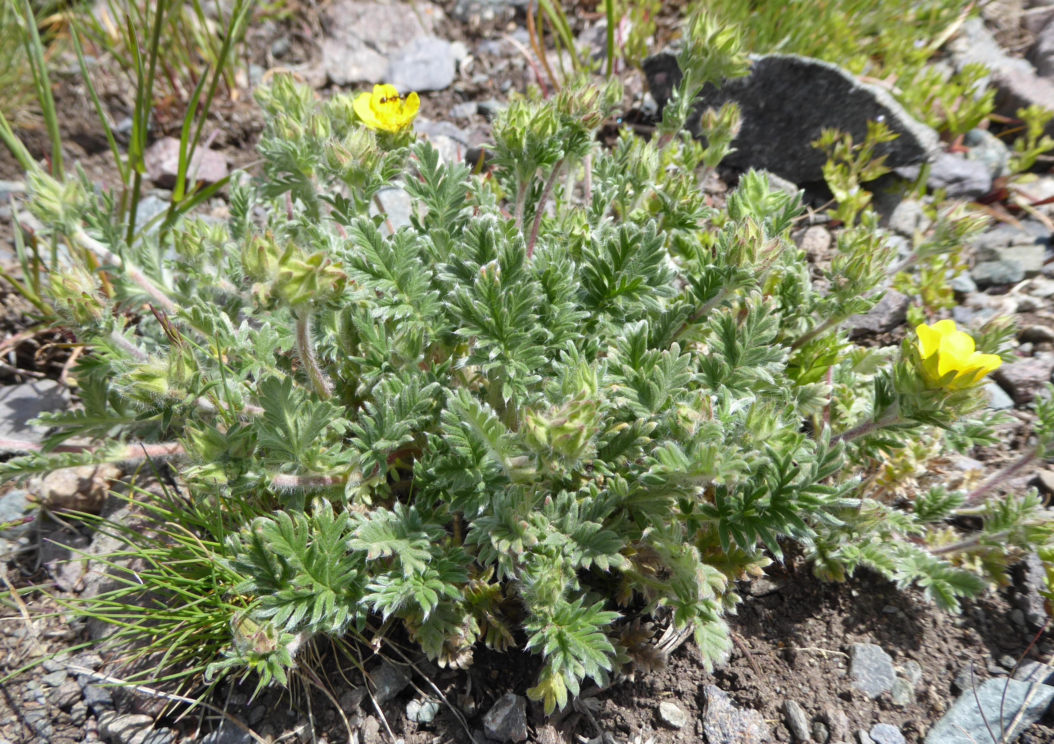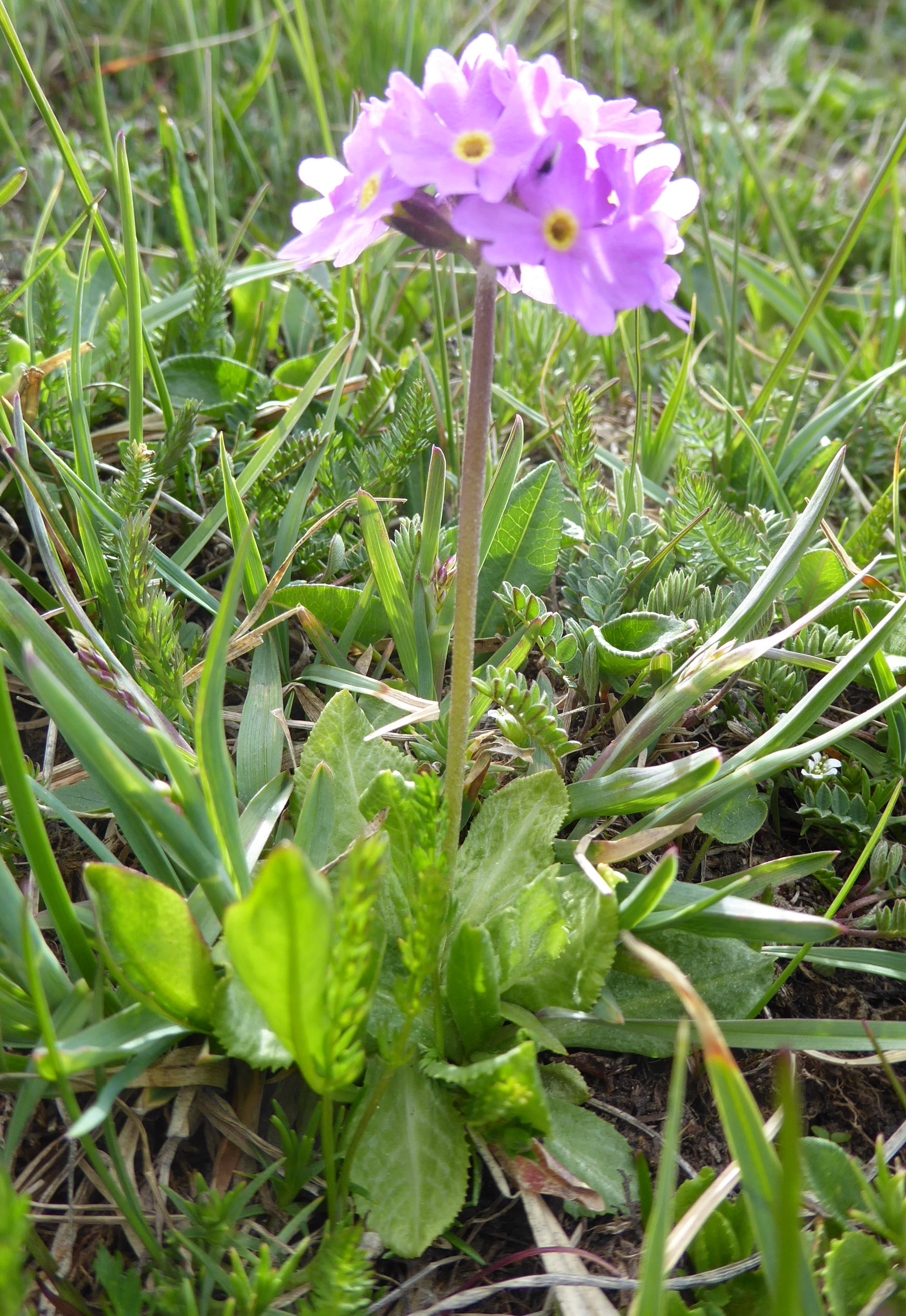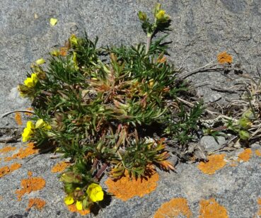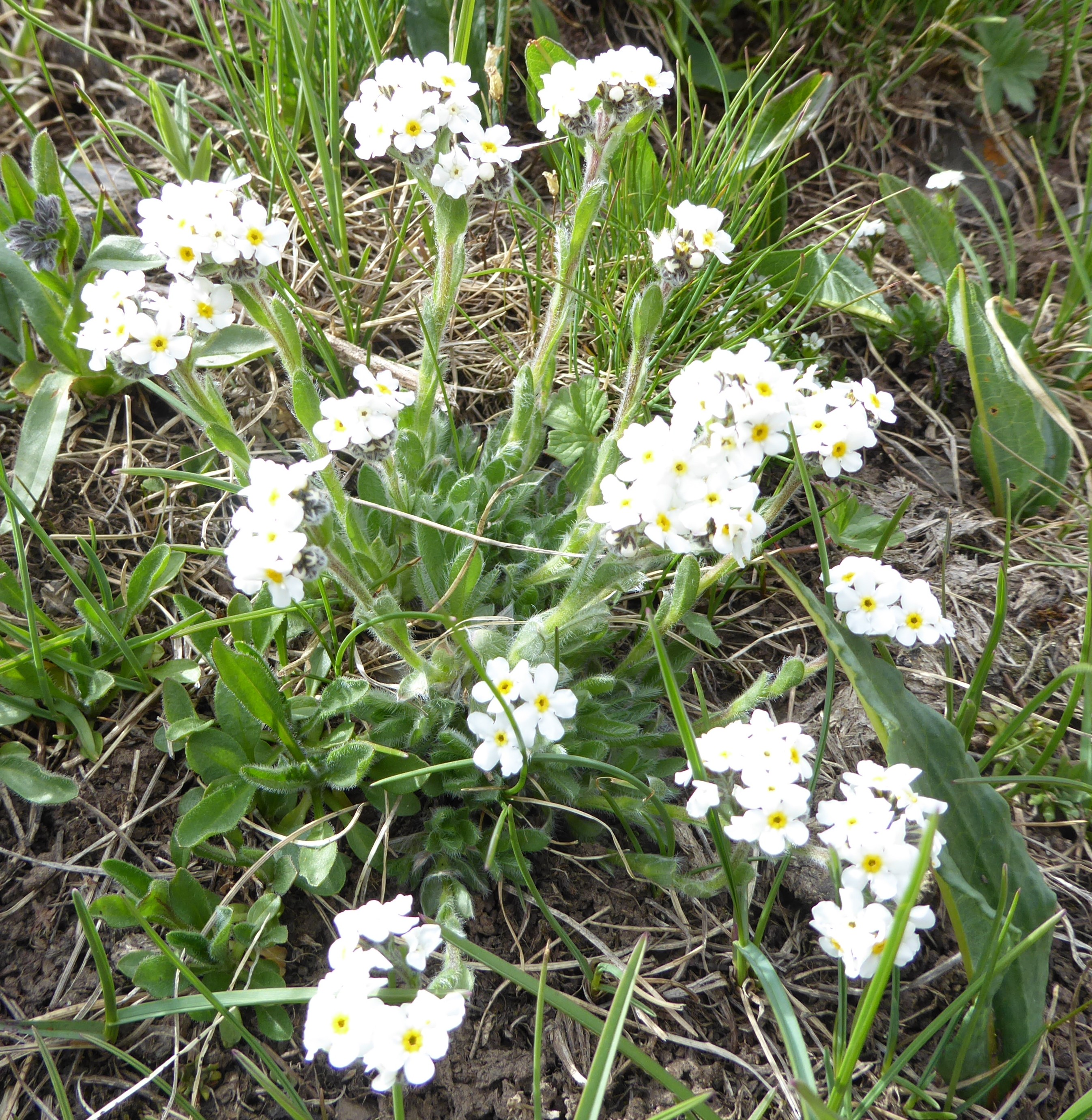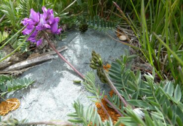 Un peu plus haut, nous atteignons l’entrée nord du tunnel du col (42° 21′ 23.6″ N, 73° 48′ 51.9″ E ; 3 135 m). Les pelouses sont ici rases, plus sèches et surpâturées. Pourtant, quelques espèces sont visibles ; toutes ou presque sont des endémiques d’Asie centrale, comme Eritrichium tianschanicum Iljin ex Ovczinnikova (photo 28 ; PCPR021706), Primula algida Adams (photo 29 ; PCPR021704), Cherleria biflora (L.) A.J. Moore & Dillenb. (= Minuartia b. (L.) Schinz. & Thell. : photo 30 ; PCPR021700), Trollius lilacinus Bunge, à corolle blanche lavée de violet (photo 31 ; PCPR021703) Silene gonosperma (Rupr.) Bocquet à calice typiquement renflé (photo 32 ; PCPR021705), l’apiaceae naine Schulzia albiflora (Kar. & Kir.) Popov (photo 33 ; PCPR021707). Nous observons également Oxytropis lapponica (Wahlenb.) J. Gay (photo 34 ; PCPR021988).