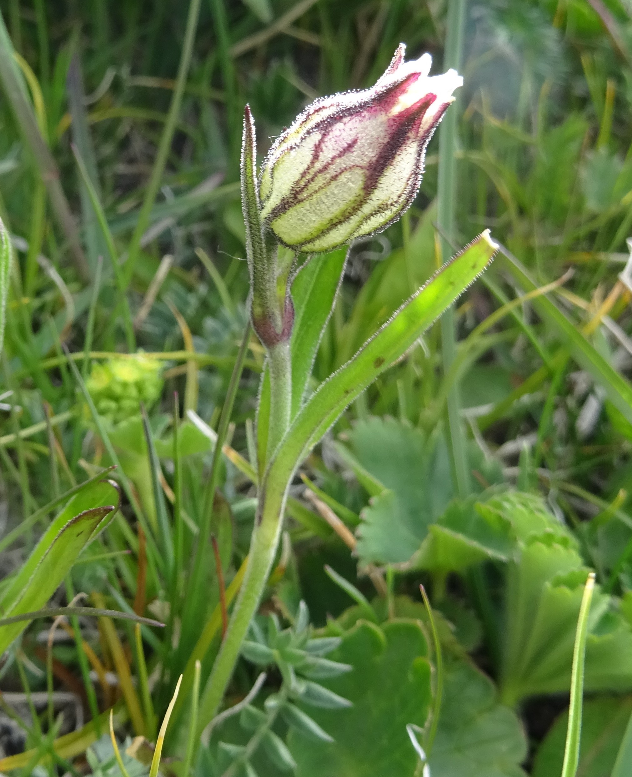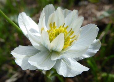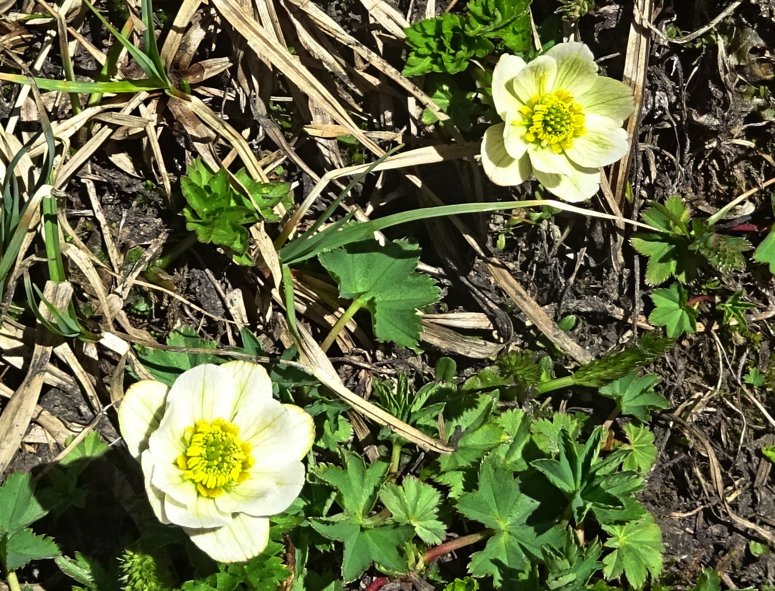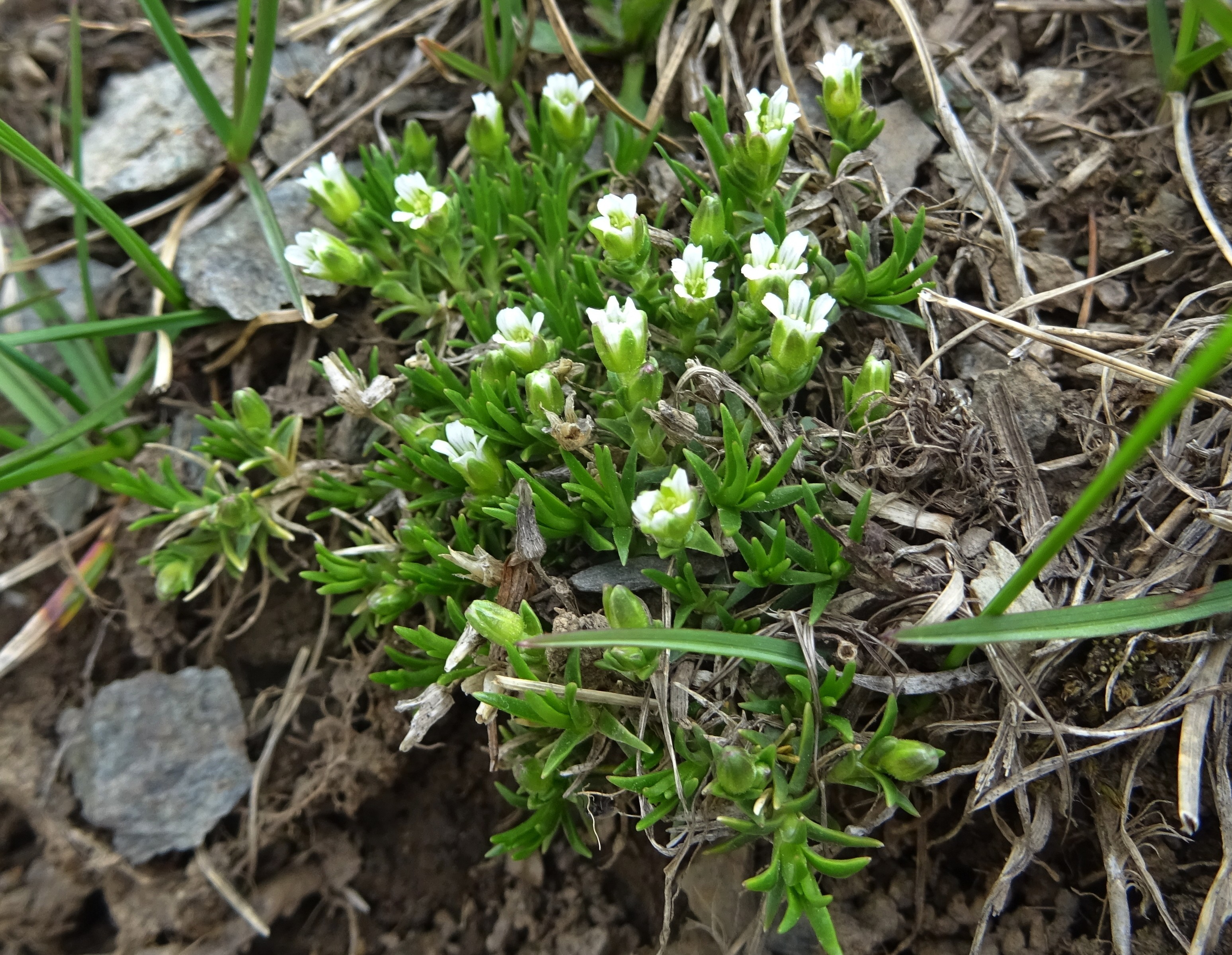 Un peu plus haut, nous atteignons l’entrée nord du tunnel du col (42° 21′ 23.6″ N, 73° 48′ 51.9″ E ; 3 135 m). Les pelouses sont ici rases, plus sèches et surpâturées. Pourtant, quelques espèces sont visibles ; toutes ou presque sont des endémiques d’Asie centrale, comme Eritrichium tianschanicum Iljin ex Ovczinnikova (photo 28 ; PCPR021706), Primula algida Adams (photo 29 ; PCPR021704), Cherleria biflora (L.) A.J. Moore & Dillenb. (= Minuartia b. (L.) Schinz. & Thell. : photo 30 ; PCPR021700), Trollius lilacinus Bunge, à corolle blanche lavée de violet (photo 31 ; PCPR021703) Silene gonosperma (Rupr.) Bocquet à calice typiquement renflé (photo 32 ; PCPR021705), l’apiaceae naine Schulzia albiflora (Kar. & Kir.) Popov (photo 33 ; PCPR021707). Nous observons également Oxytropis lapponica (Wahlenb.) J. Gay (photo 34 ; PCPR021988).