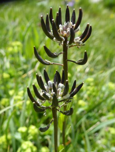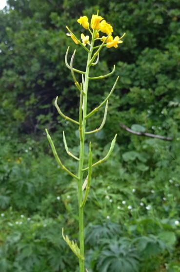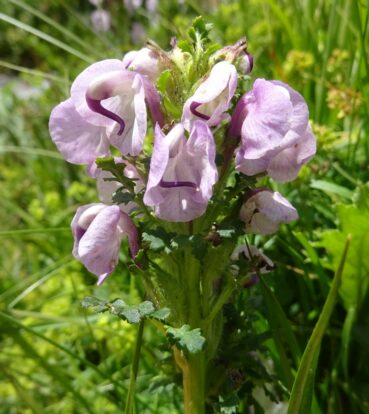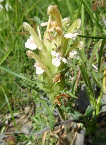 Amorçant notre route vers la plaine du nord, nous décidons de nous arrêter dans des prairies tourbeuses situées un peu nord du carrefour entre la route principale M41 et la piste A367 (42° 17′ 30.1″ N, 73° 49′ 34.5″ E ; 2 479 m). Après un peu de recherche, nous y observons la plante que nous espérions y voir, l’endémique d’Asie centrale Pedicularis rhinanthoides Schrenk ex Fisch. & C.A. Mey. subsp. rhinanthoides (photo 129 ; PCPR021889 & PCPR021890), accompagnée de Chorispora tenella (Pall.) DC. (photo 130 ; PCPR021899 & PCPR021900) et de Veronica anagalloides Guss. (PCPR021898).