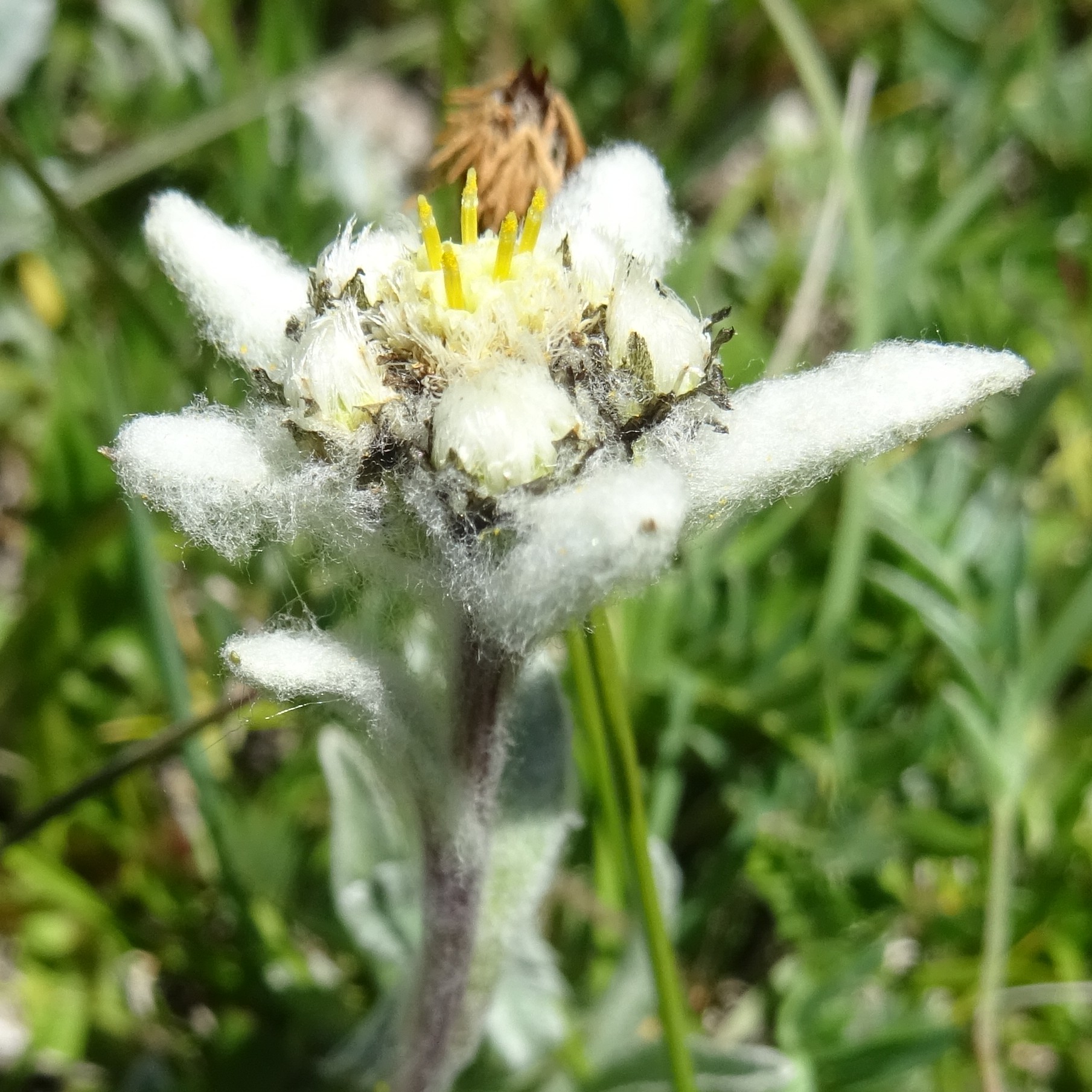 Nous terminerons nos herborisations par les prairies alpines, cette fois-ci moins pâturées, situées au niveau de l’entrée nord du tunnel du col Too Ashuu (42° 21′ 45.9″ N, 73° 48′ 51.3″ E ; 3 060 m). L’absence de broutage récent permet à toute une série de plantes naines de se développer. Nous y observons de nombreux taxons non encore vus lors du voyage, comme Gentiana karelinii Griseb. (plante naine à feuilles coriaces cartilagineuses blanchâtres sur les marges ; photo 131 ; PCPR021888), Draba altaica (C.A. Mey.) Bunge (à feuilles ciliées et fruits glabres ; photo 132 ; PCPR021926), Potentilla multifida L. (photo 133 ; PCPR021930), Carex melanantha C.A. Mey. (à inflorescence compacte, mâle au sommet, femelle à la base, et bractées brun foncé plus grandes que l’utricule ; PCPR002686 & PCPR021495), Leontopodium leontopodinum (DC.) Hand.-Mazz (= L. ochroleucum Beauverd ; photo 134 ; PCPR021885), mais également Schulzia albiflora (Kar. & Kir.) Popov, Plantago arachnoidea Schrenk (168* ; PCPR021925), Comastoma tenellum (Rottb.) Toyok. (= Gentianella tenella Rottb. ; PCPR021886), Trollius lilacinus, Silene gonosperma, Pedicularis korolkowii (PCPR021927), Primula algida et Thalictrum alpinum (PCPR021884).
