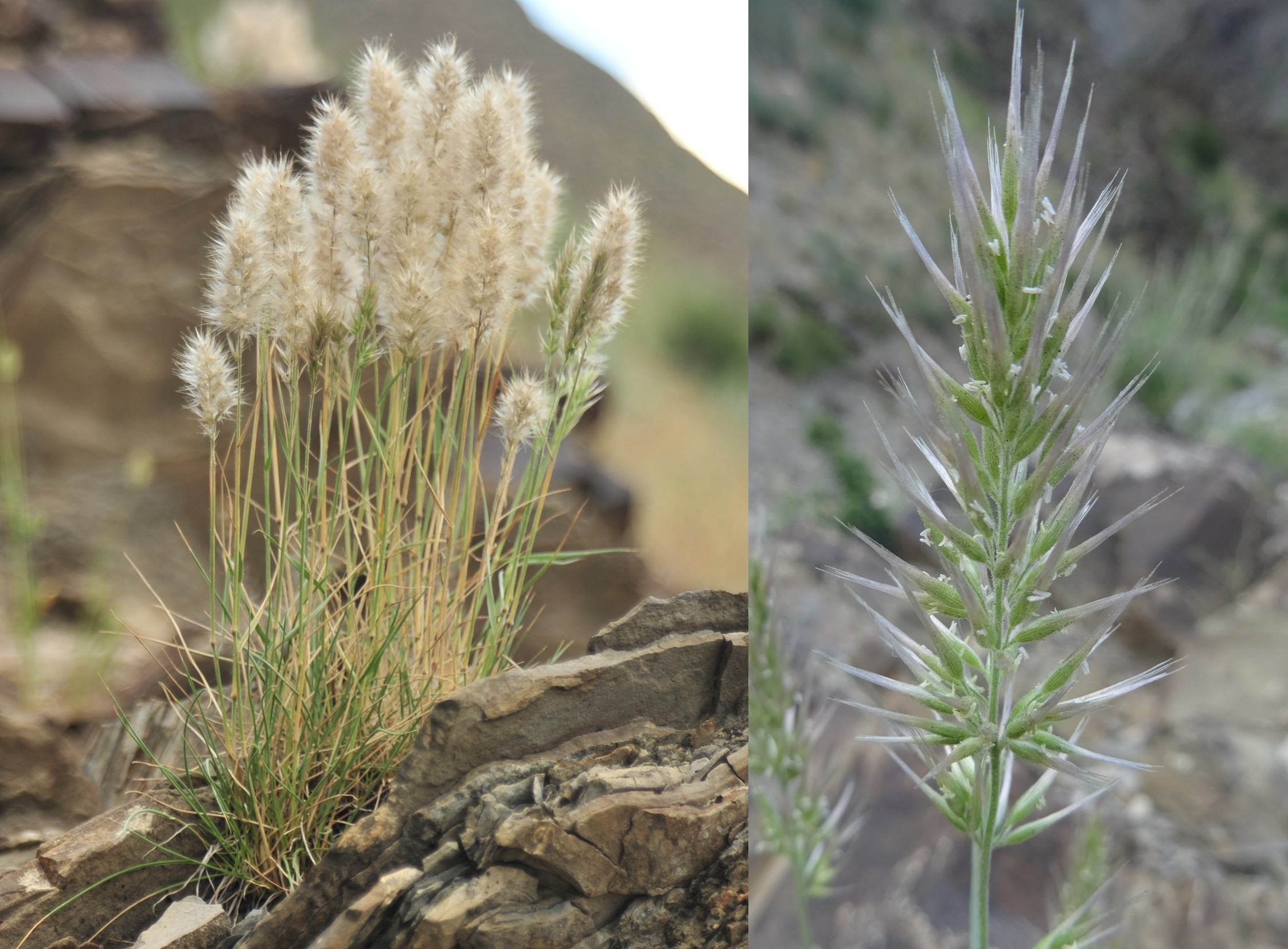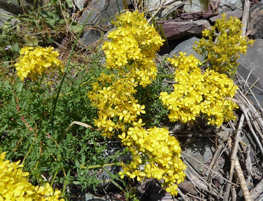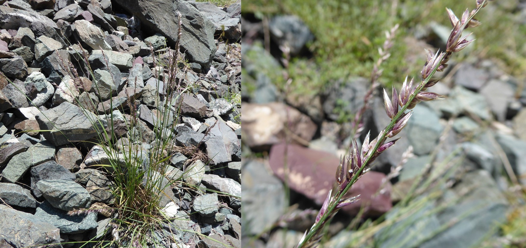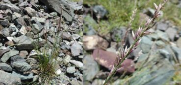 Le troisième arrêt, un peu plus au sud (42° 34′ 39.8″ N, 73° 52′ 12.8″ E ; 1 431 m) se fait sur un éboulis grossier. Entre les rochers nous notons des espèces d’Asie centrale déjà vues en 2022 comme Ziziphora clinopodioides Lam. (32* ; PCPR021958), Roemeria refracta (205*), Glaucium squamigerum Kar. & Kir. (66* ; PCPR022138 & PCPR022218) ou Eremurus fuscus (O. Fedtsch.) Vved. (97* ; PCPR020499 & PCPR002585), déjà bien fructifié. Le millepertuis ici présent est Hypericum scabrum L. (photo 15 ; PCPR021529, PCPR021530 & PCPR003940), espèce à aire plus large. Établir l’identité d’une mélique à épis velus et pourprés sera plus complexe ; nous la rattacherons finalement à Melica inaequiglumis Boiss. (planche 6), taxon à aire plus occidentale que les autres espèces du lieu, puisqu’elle se rencontre à l’ouest jusqu’à la Turquie, le Liban, la Jordanie et Israël.