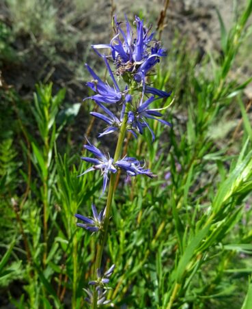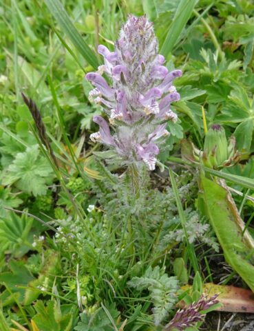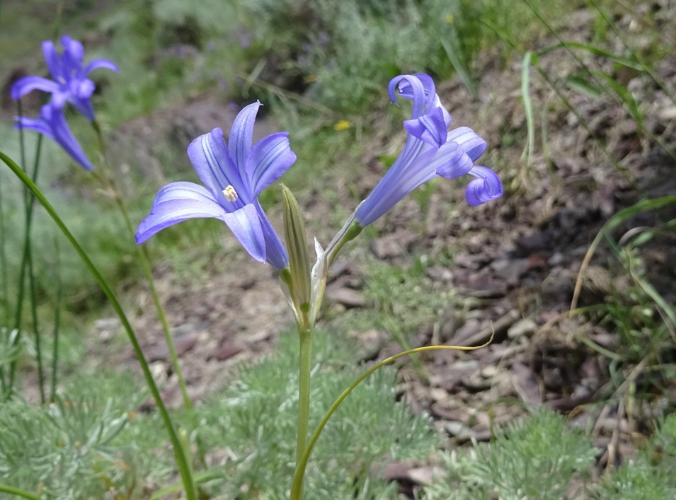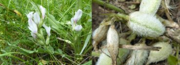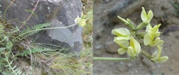 Un peu plus loin, dans une zone herbeuse entre les rochers (42° 35′ 26.4″ N, 74°29’00.2″E ; alt. 1 955 m., nous observons le toujours spectaculaire Phlomoides speciosa (Rupr.) Adylov, Kamelin & Makhm. (81*, 82* ; PCPR021951 & PCPR021952), ainsi que Phlomoides oreophila (Kar. & Kir.) Adylov, Kamelin & Makhm. (107* ; photo 8 ; PCPR021963 & PCPR021964), Astragalus platyphyllus (95*), Aconitum leucostomum (119*), Ixiolirion tataricum (Pall.) Schult. & Schult. f. et Polygala hybrida DC. (= P. comosa Schkuhr). Une plante retient particulièrement notre attention. Il s’agit d’un astragale à fleurs blanc bleuté et fruits courts densément velus, appartenant à la section asiatique Helmia, qui compte une vingtaine d’espèces. Cette plante est un endémique du Kirghizistan, connu de quelques échantillons seulement, Astragalus involutivus Sumn. (planche 1 ; PCPR021842, PCPR021843, PCPR021844 et PCPR021862).