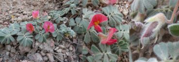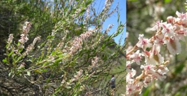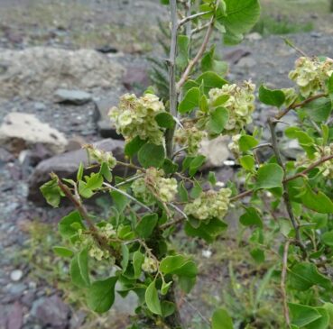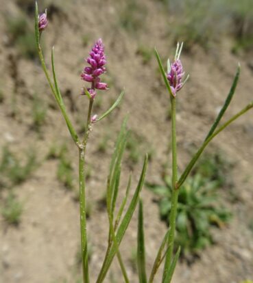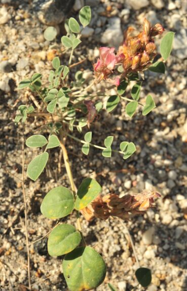 Un peu plus loin, toujours sur ces coteaux, nous observons un Atraphaxis arbustif, genre très bien représenté en Asie centrale. Il s’agit d’A. frutescens (L.) K. Koch (planche 33 ; PCPR021785 & PCPR021786), à feuilles plus larges que l’espèce vue en 2002 au bord du lac Ysyk-Kôl, A. virgata (Regel) Krasn. (26* ; PCPR022021 & PCPR022022). Avec lui pousse un splendide Oxytropis formant de grandes touffes à feuilles cendrées, O. rosea Bunge, de la section Eumorpha Bunge (planche 34 ; PCPR021852, PCPR021853 & PCPR021854).