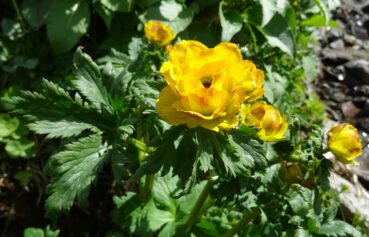 Nous espérions trouver de nombreuses espèces dans les pelouses alpines de l’Otmok Pass, à 3 200 m d’altitude (42° 16′ 55.5″ N, 73° 09′ 20.6″ E), mais de véritables tondeuses animales ont avalé tout ce qui pousse ici (photo 127). Ce ne sont que dans de rares interstices que nous arrivons à observer quelques pieds de Trollius komarovii Pachom. (photo 128 ; PCPR004004), Dracocephalum nutans, Chorispora macropoda et Primula algida.