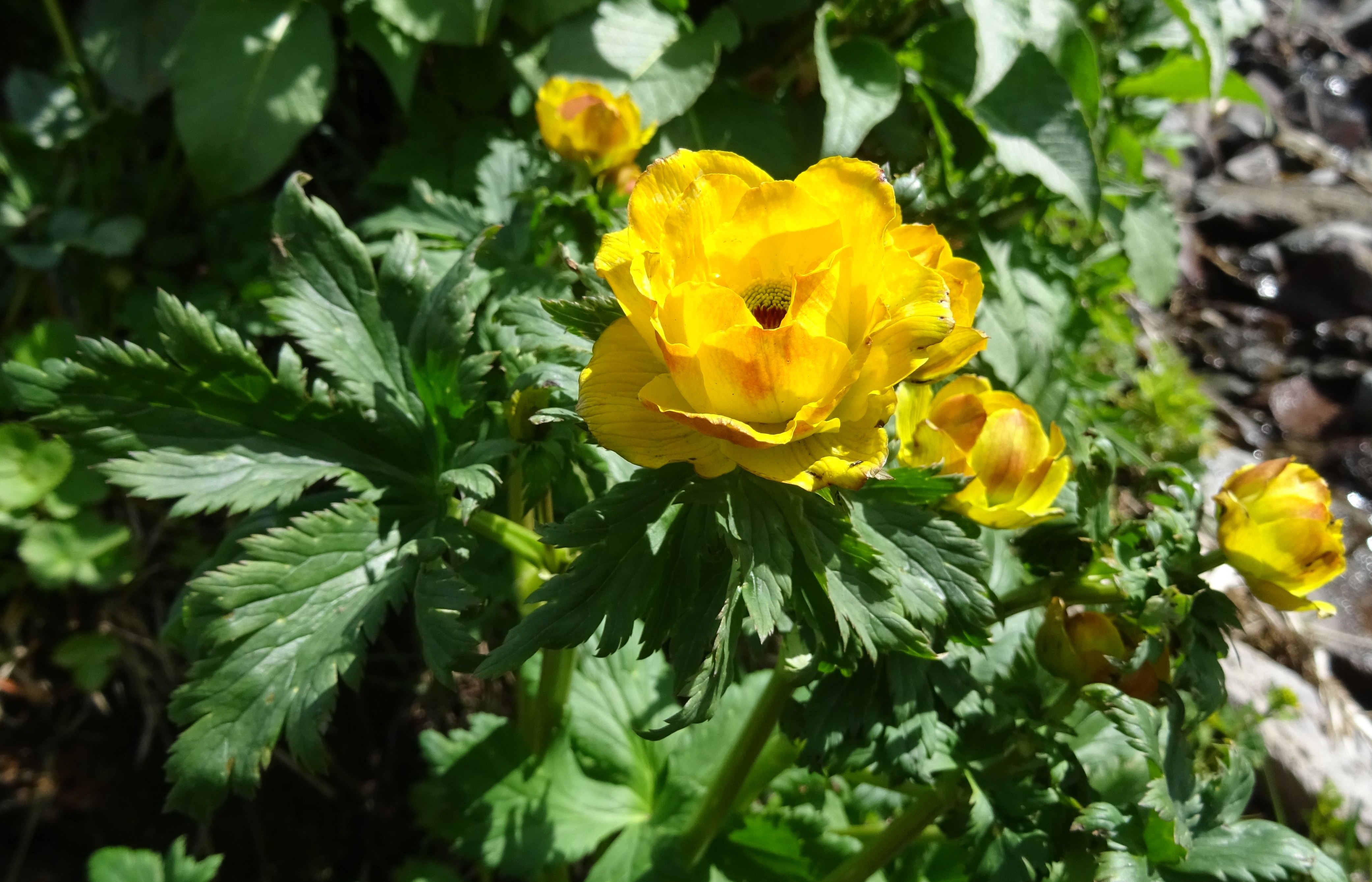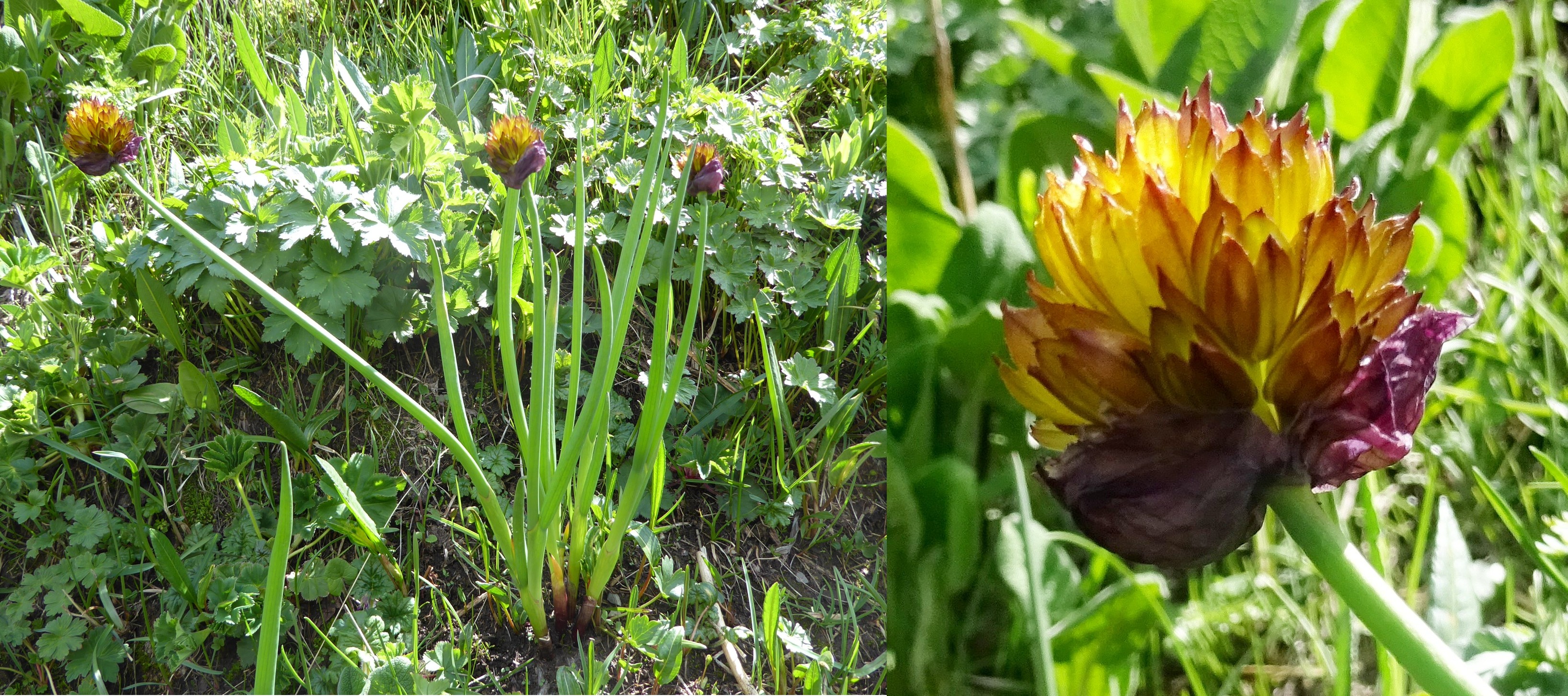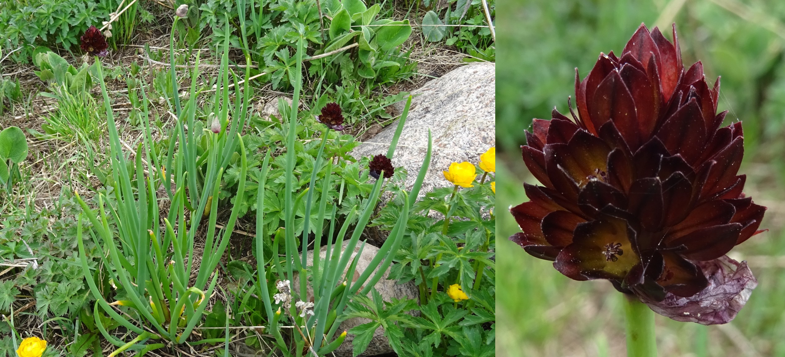 Le col est tout proche quand nous atteignons de vastes prairies humides au sommet, à 3 033 m d’altitude (41° 54′ 28.5″ N, 74° 00′ 52.8″ E). Peu de plantes fleurissent à cette époque mais le spectacle n’en est pas moins magnifique, ces prés étant couverts des corolles orangées de Trollius altaicus, jaunes de Tulipa dasystemon et brun noirâtre d’un ail déjà vu la veille, mais cette-fois ci dans sa variété type, Allium atrosanguineum Schrenk var. atrosanguineum (planche 23 ; PCPR002693, PCPR021484 & PCPR021485).