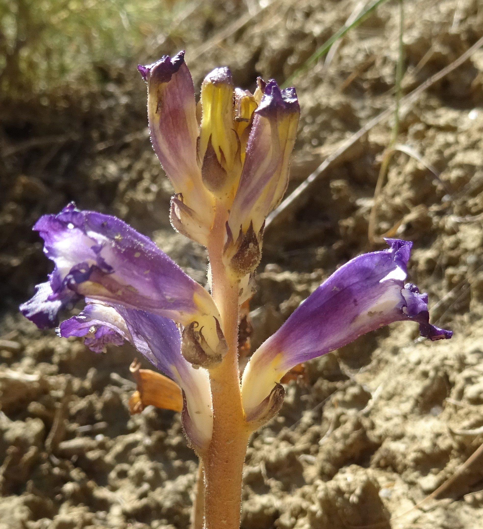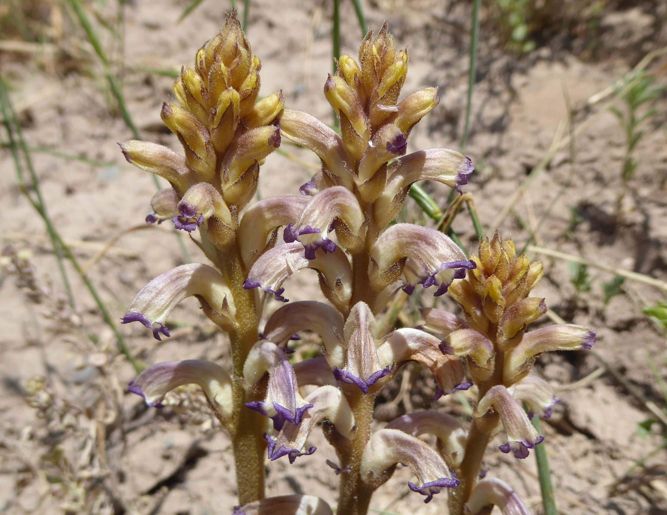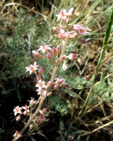Un peu plus au sud, nous retrouvons Moluccella olgae, abondante en bordure d’une prairie sèche au (41° 49′ 08.7″ N, 73° 11′ 10.0″ E ; 115 m). Delphinium rugulosum est également présent, ainsi qu’Allium caesium Schrenk (13* ; PCPR021468), Handelia trichophylla (16*), la crassulacée Rosularia radicosa (Boiss. & Hohen.) Eggli (photo 73 ; PCPR021768), plante glabre à inflorescence en panicule étroite, et une orobanche à corolles violacées, d’Asie centrale, O. amoena C.A. Mey. (identification confirmée par notre ami Luis Carlón : photo 74 ; PCPR021769). Elle parasite Artemisia sp. (non fleurie).