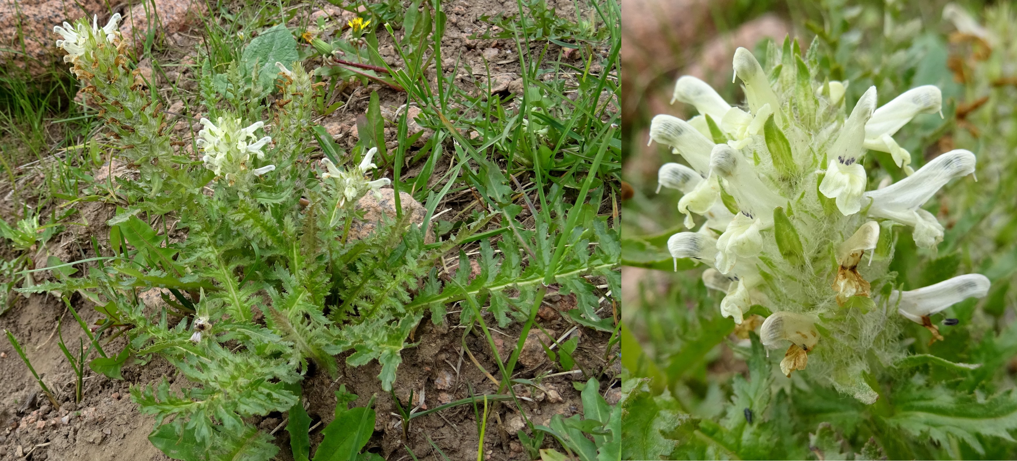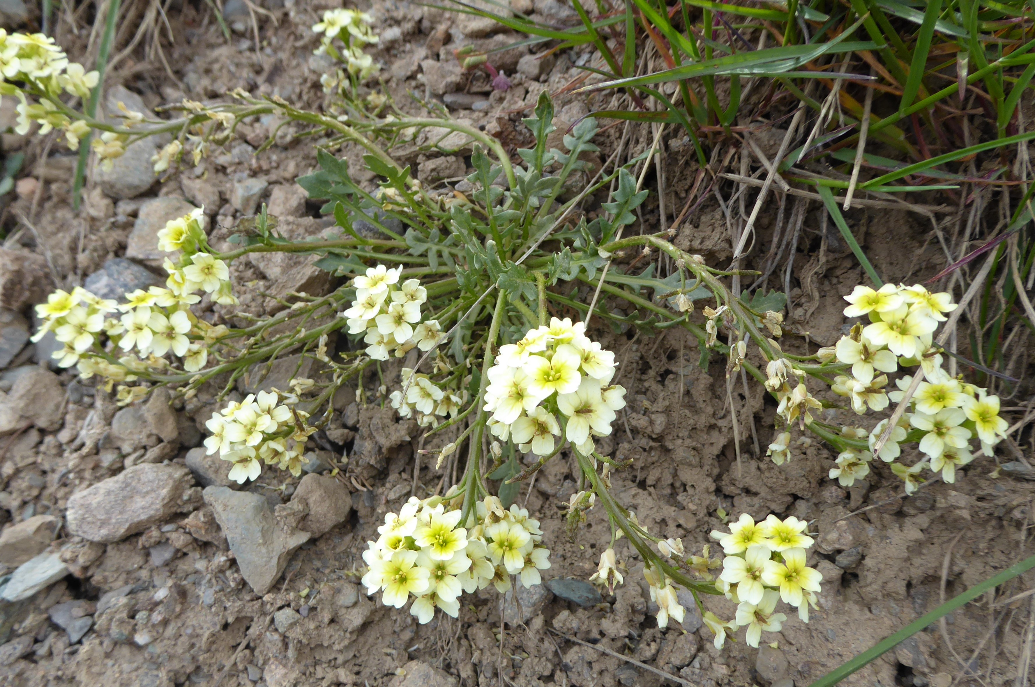Un peu plus haut, une prairie le long de la piste est miraculeusement épargnée par les moutons. Nous sommes à 2 828 m (41° 54′ 02.4″ N, 74° 02′ 01.5″ E). Plusieurs espèces sont déjà fleuries. Sans surprise, en de tels lieux il ne s’agit que d’endémiques d’Asie centrale. Nous observons Ligularia alpigena Pojark., petit plante glabre dressée (planche 21 ; PCPR021737), une autre crucifère du genre Eutrema vu la veille, E. integrifolium (DC.) Bunge (photo 61 ; PCPR021738 & PCPR021739), la robuste Pedicularis olgae Regel (planche 22 ; PCPR021741 & PCPR021742) dans une forme albinique, ainsi que Pedicularis macrochila Vved. (87* ; PCPR022019, PCPR022020 & PCPR022058), Dracocephalum nutans (115*), Anemonastrum protractum (110*) et une Caryophyllaceae à quatre styles que nous désespérons de pouvoir identifier. Un peu plus haut (41° 54′ 35.3″ N, 74° 00′ 50.5″ E), nous revoyons en bord de piste Chorispora macropoda et Tulipa dasystemon.