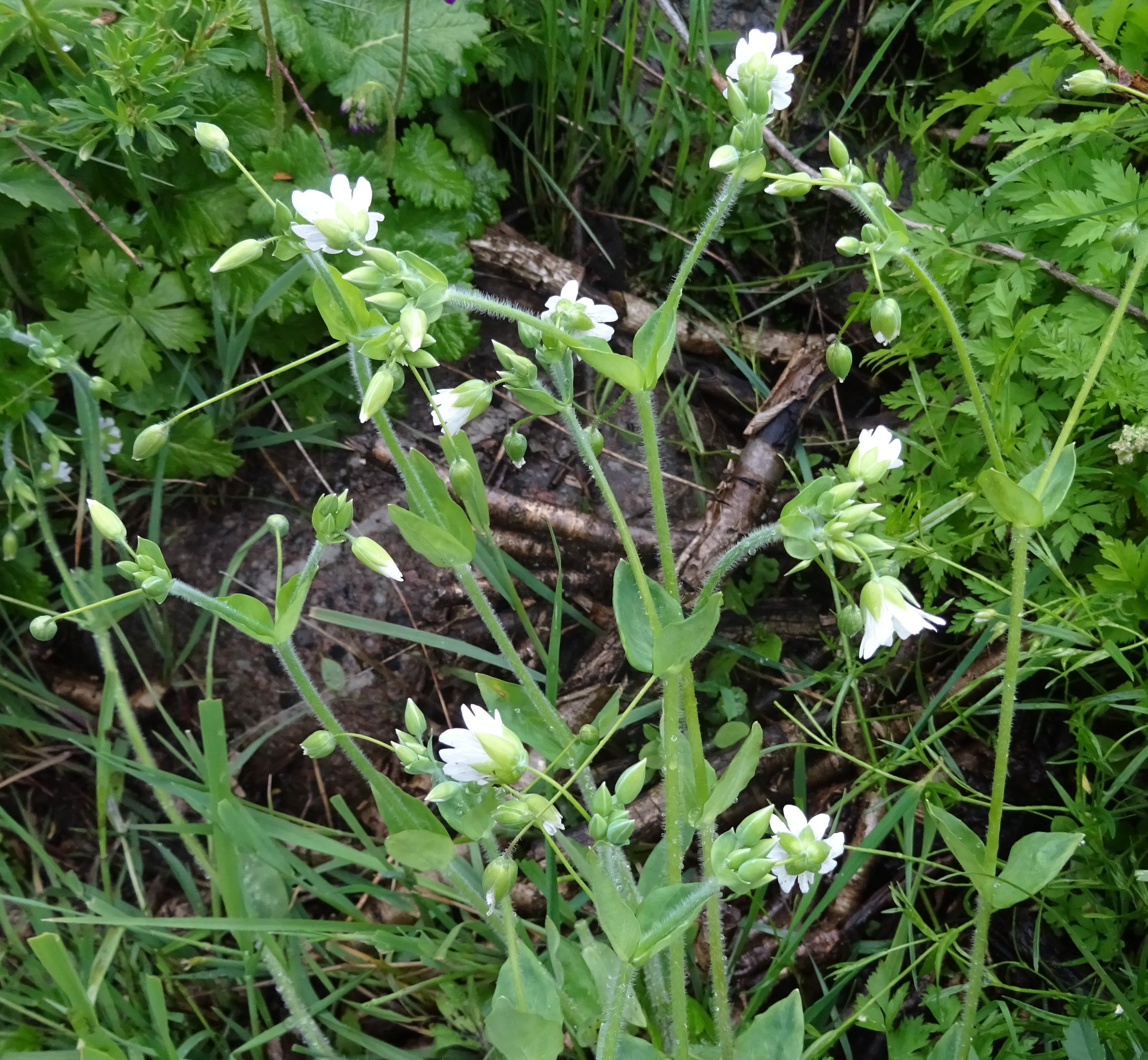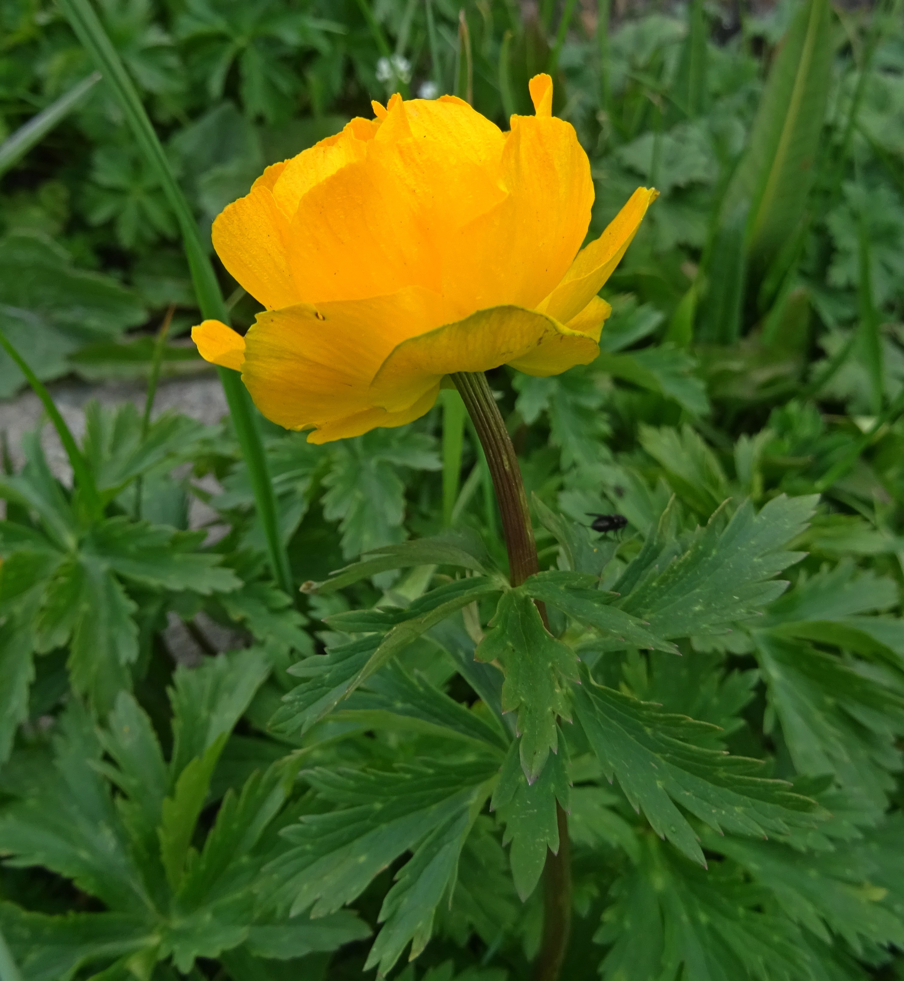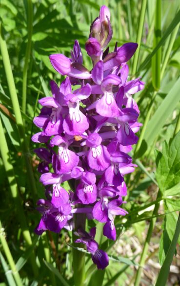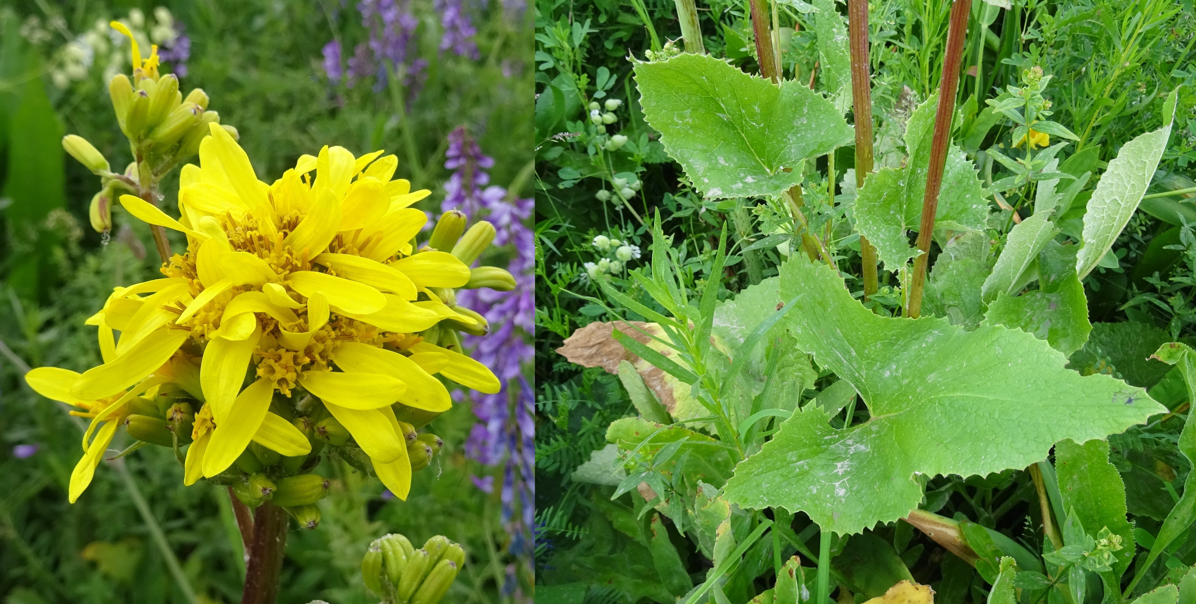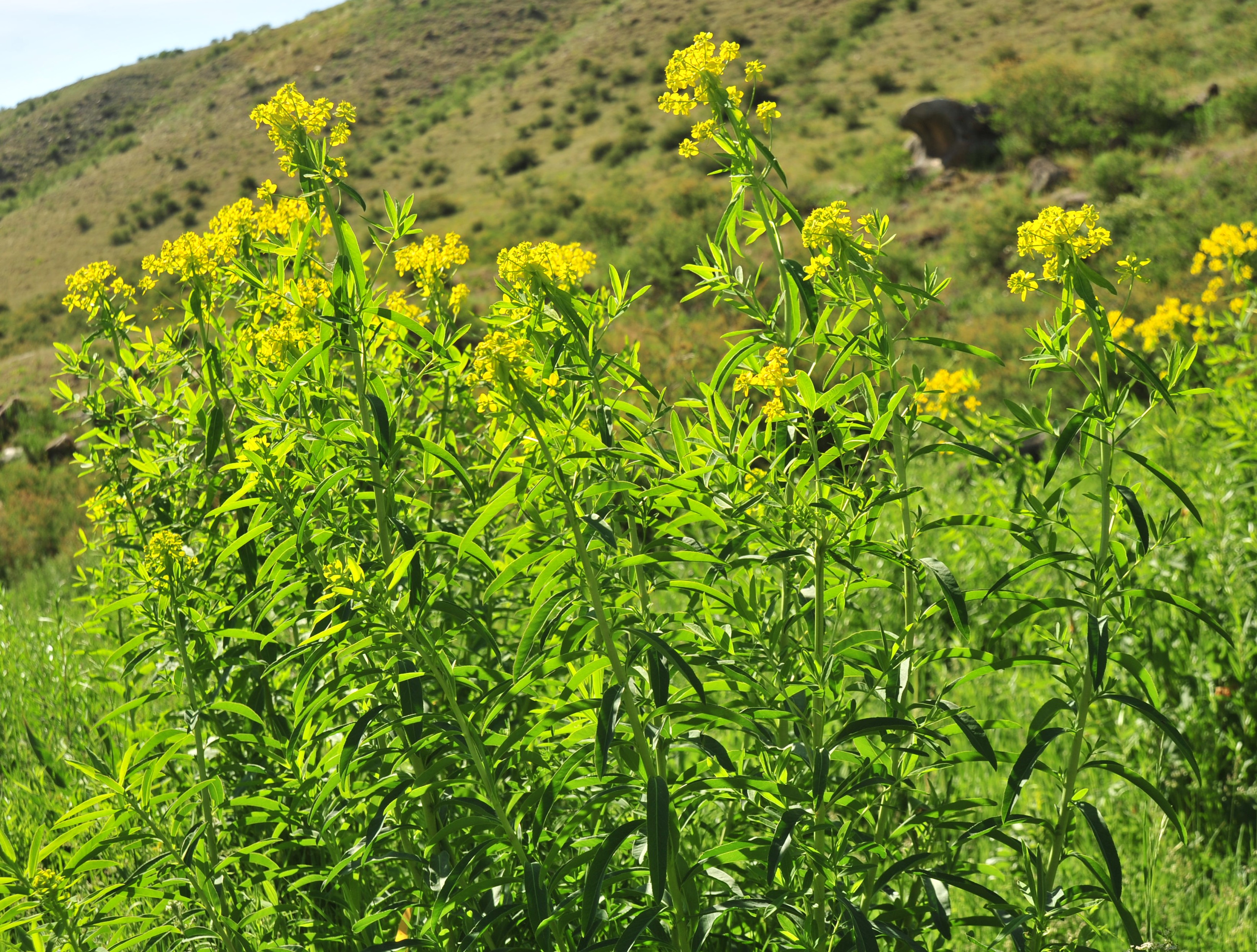 Nous y ferons quelques arrêts pour observer la flore de ces prairies, pour commencer sur un coteau frais (42° 34′ 09.7″ N, 74° 28′ 56.6″ E, alt. 2 110 m) où nous observons Turritis glabra L. (PCPR021647), Bupleurum aureum Fisch. ex Hoffm. (photo 7) en début de floraison (PCPR003129, PCPR021511, PCPR021512, PCPR021513), Astragalus platyphyllus Kar. & Kir. (sect. Incani ; 95* ; PCPR021965 & PCPR021966), Spiraea lasiocarpa Kar. & Kir. (67* ; PCPR022111), Lonicera hispida Pall. ex Schult. (123* ; PCPR022203 & PCPR022204), Polemonium caeruleum L. et Aconitum leucostomum Vorosch. (119* ; PCPR021962 & PCPR021980). Dans le fossé le sous-tendant plusieurs Carex sont développés mais pas encore mûrs à cette date. Nous y observons également Dactylorhiza umbrosa (Kar. & Kir.) Nevski (= D. incarnata subsp. cilicica (Klinge) H.Sund. ; 116* ; PCPR001594, PCPR001595, PCPR002694, PCPR018745, PCPR021481).