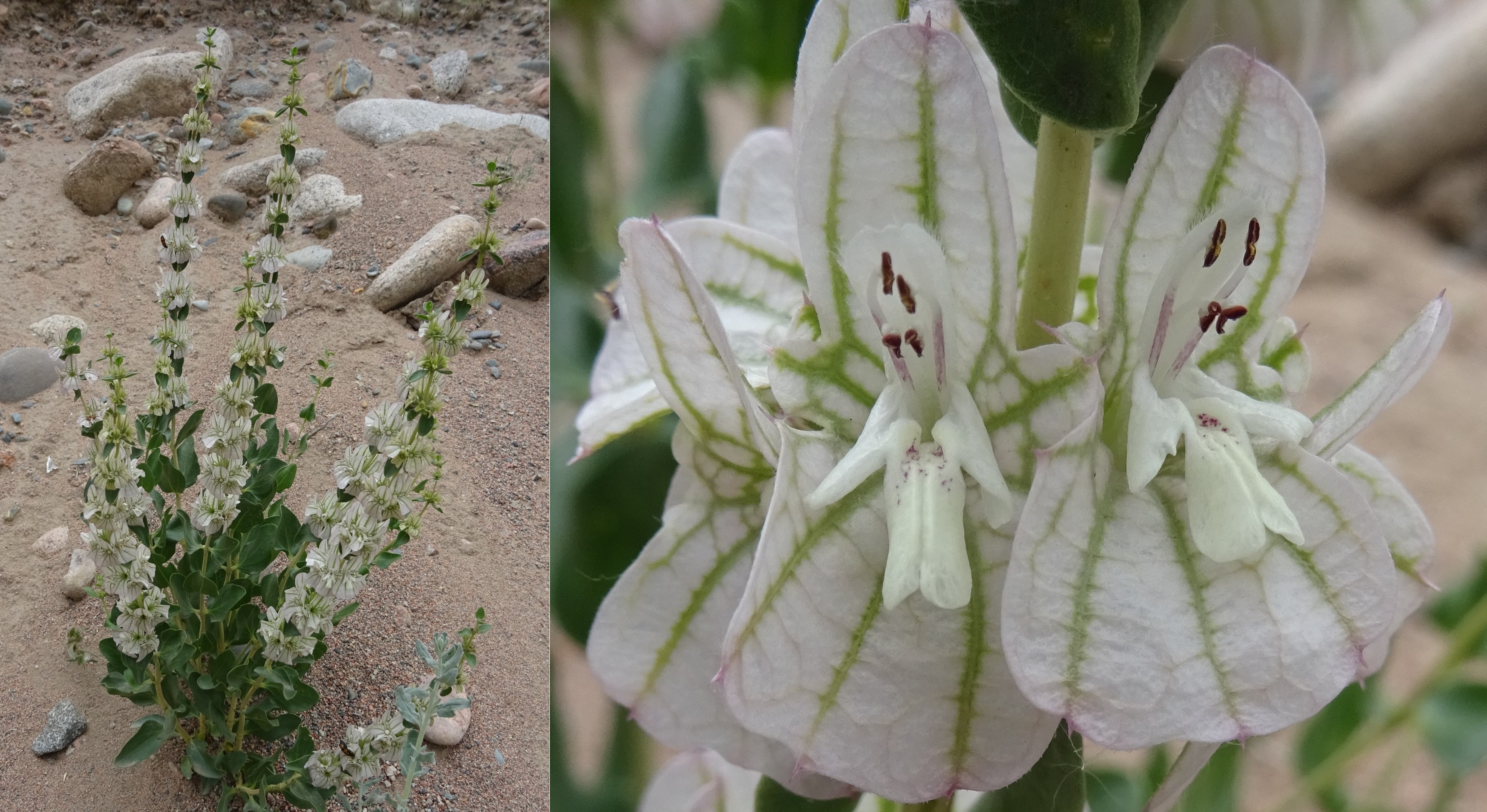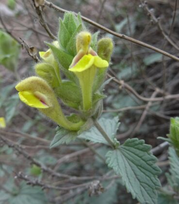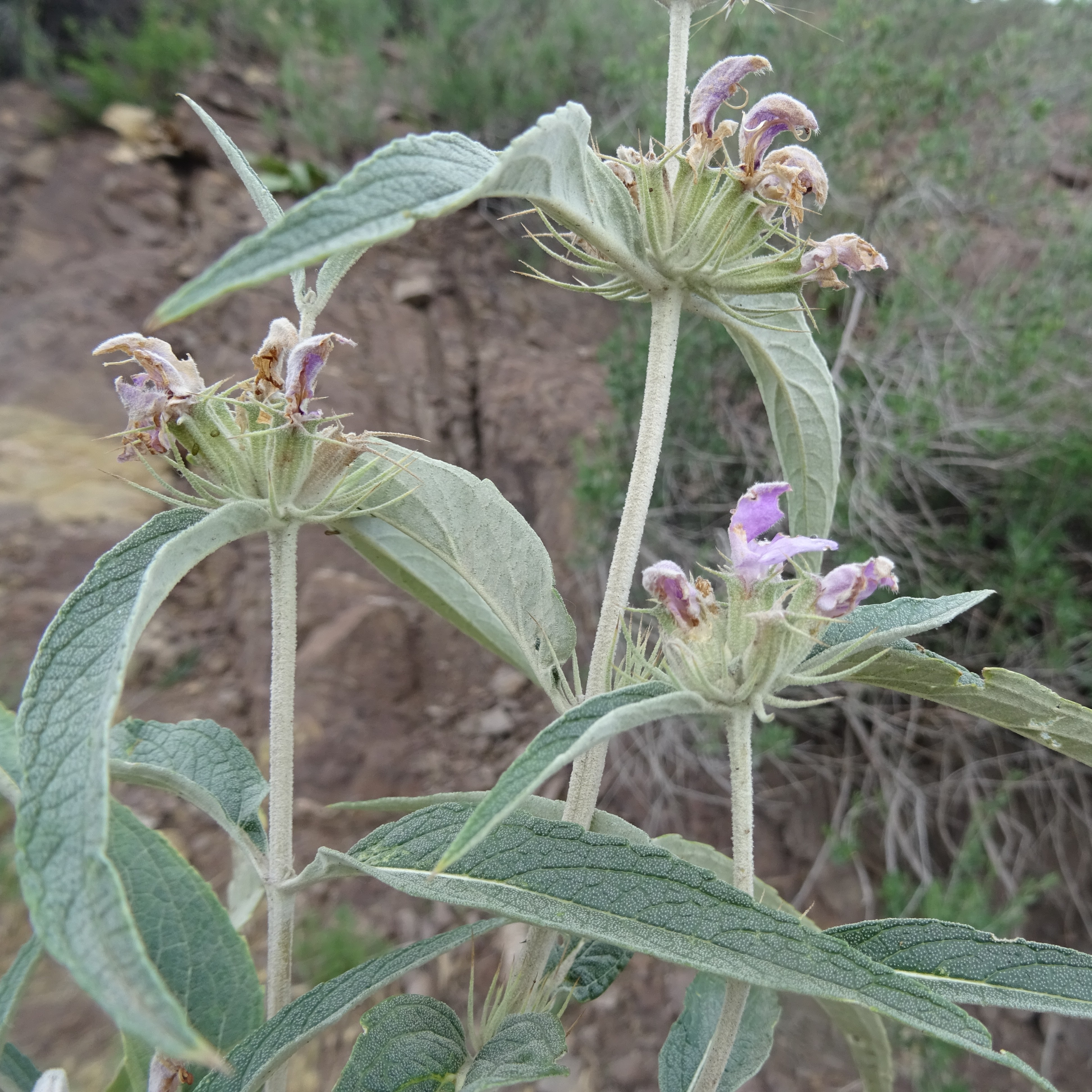 Notre dernier arrêt de la journée se fait sur des coteaux siliceux surplombant la route, entre Kurpsay et Tachkoumyr (41° 25′ 35.7″ N, 72° 15′ 27.6″ E ; 670 m), pour observer Phlomis hypoleuca Vved., à fleurs roses et feuilles bicolores, leur face inférieure étant velue blanchâtre, d’où son nom (photo 86 ; PCPR021787 & PCPR021788). Il est pratiquement fané à cette époque et nous n’observons que quelques pieds en fin de floraison.