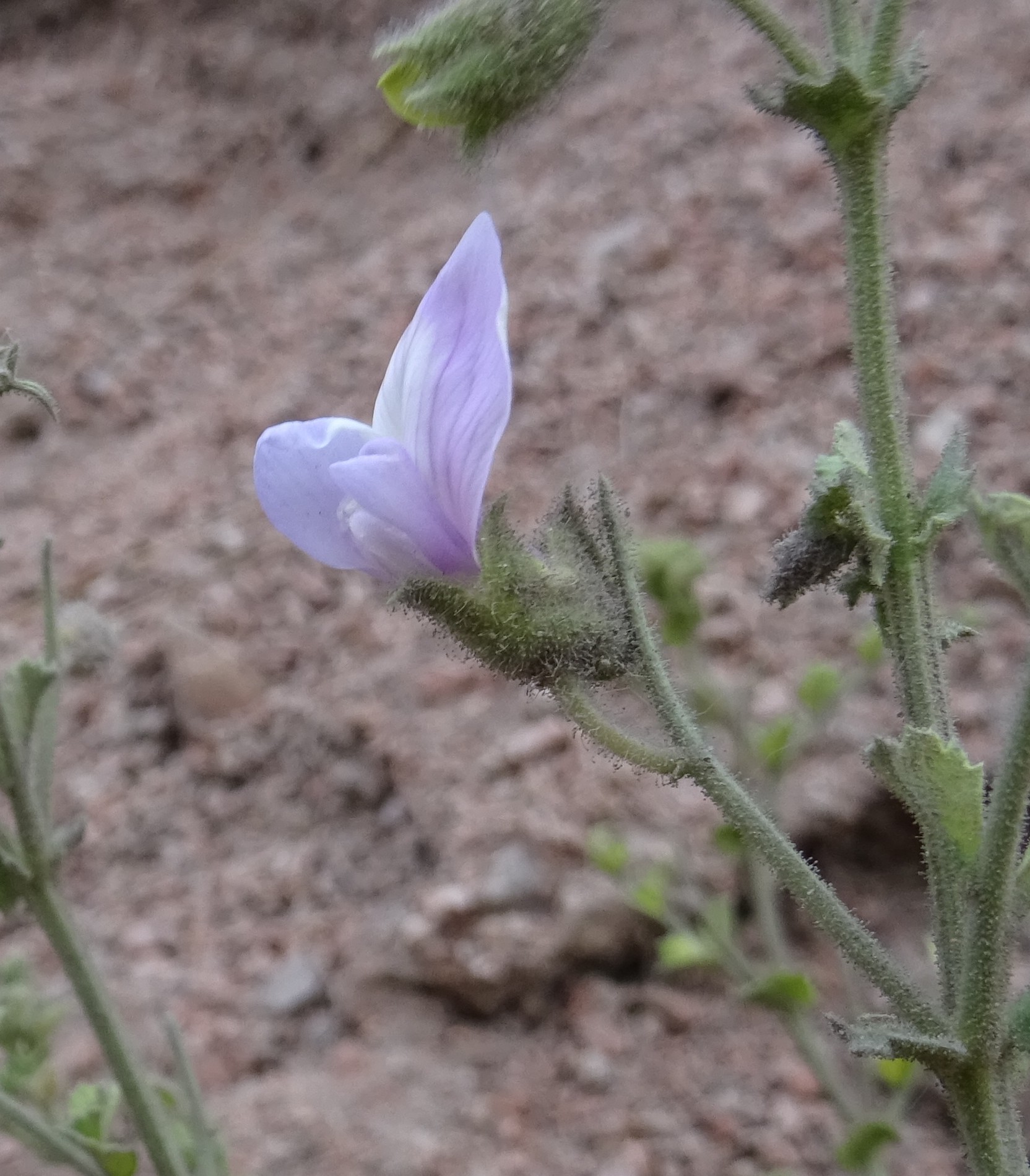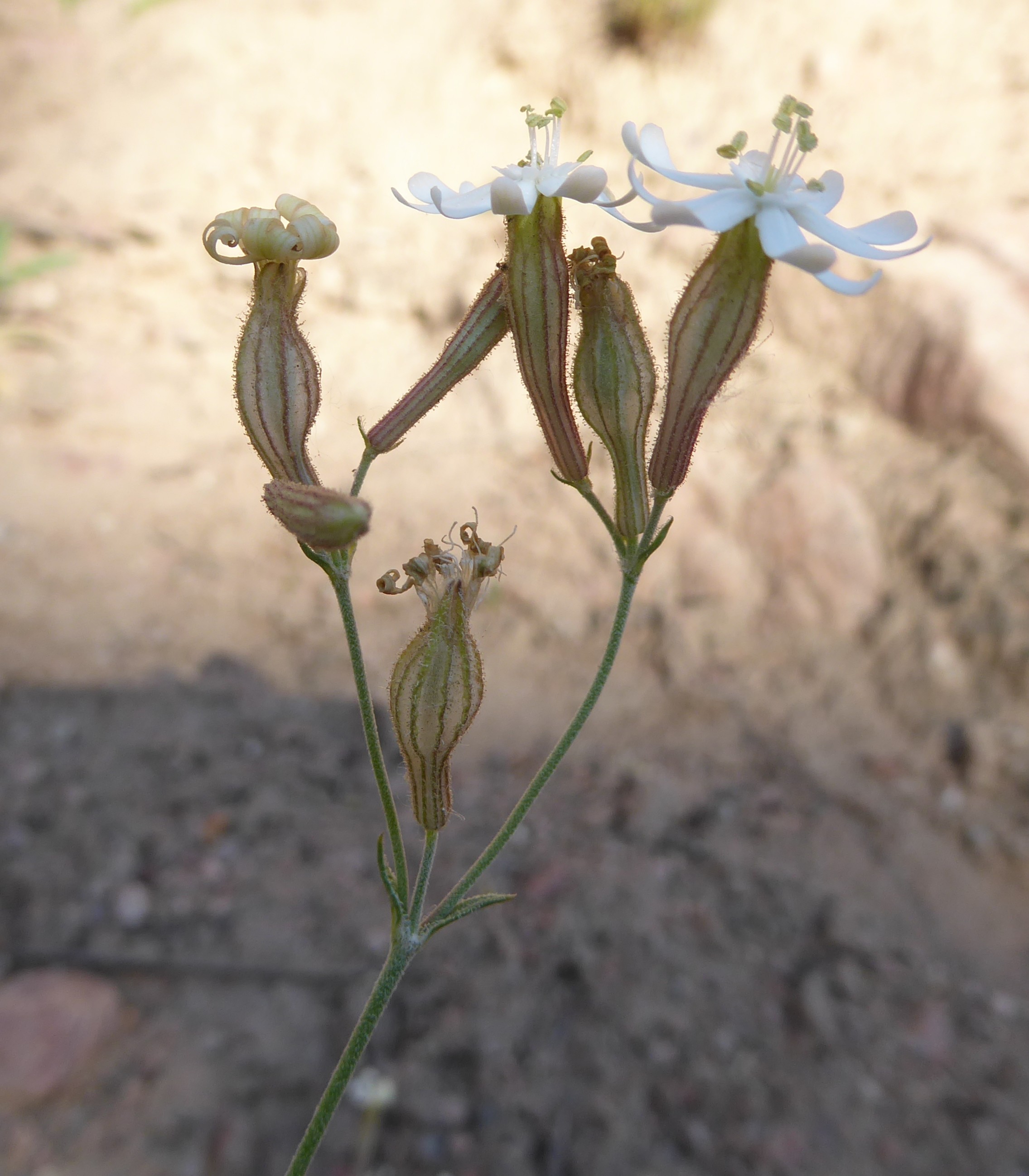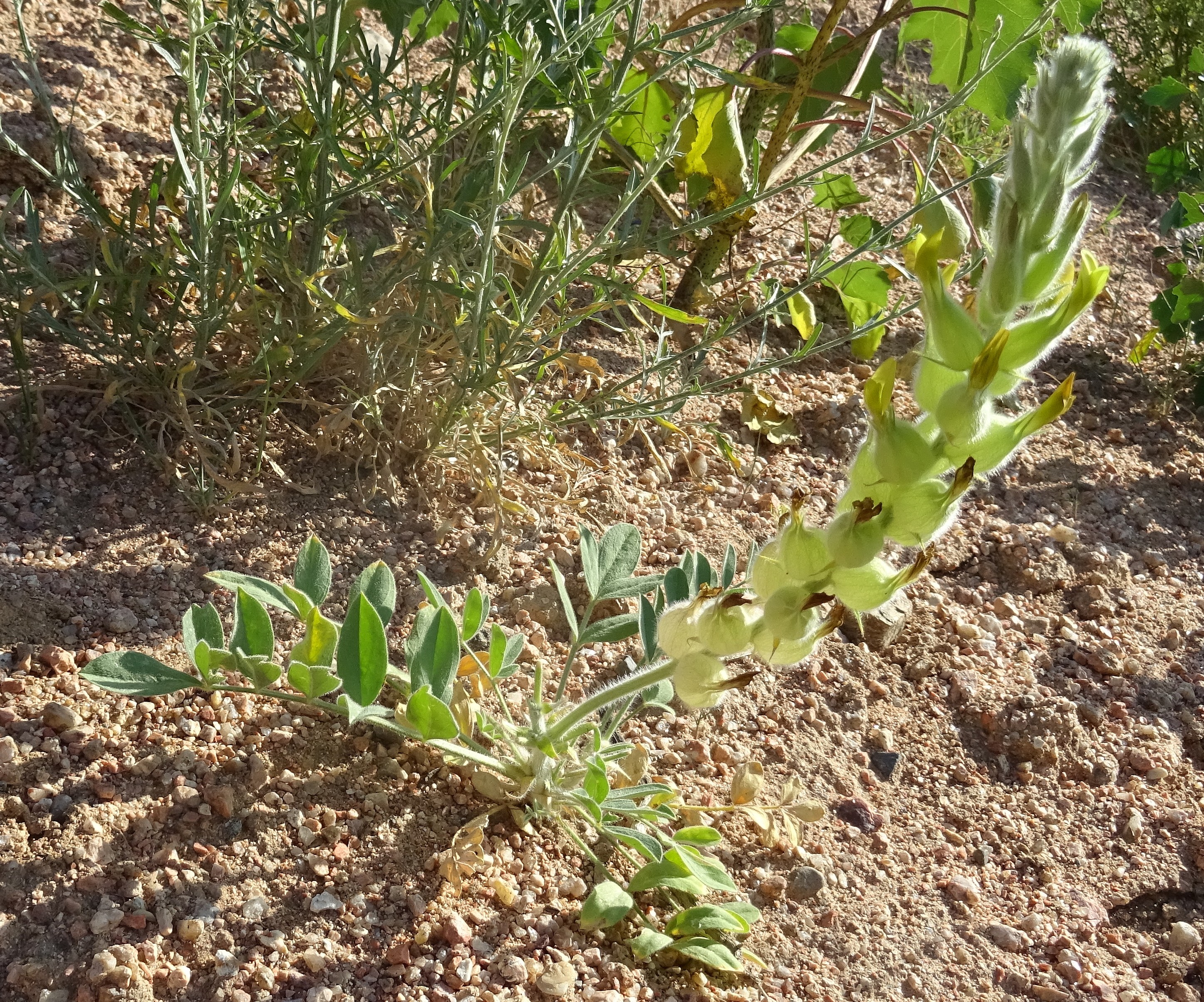 Le deuxième arrêt se fait au bord d’un chemin de fins graviers sur coteau sec marneux entre Karaköl et Kyzylbeyit (41° 32′ 47.6″ N, 72° 29′ 42.4″ E ; 778 m). Nous y observons un autre astragale de la petite section Chaetodon, beaucoup plus longuement velu que celui vu le matin. Il s’agit d’Astragalus stenocystis Bunge (photo 84 ; PCPR021857), accompagné des annuelles Velezia rigida L. et Sideritis montana L.