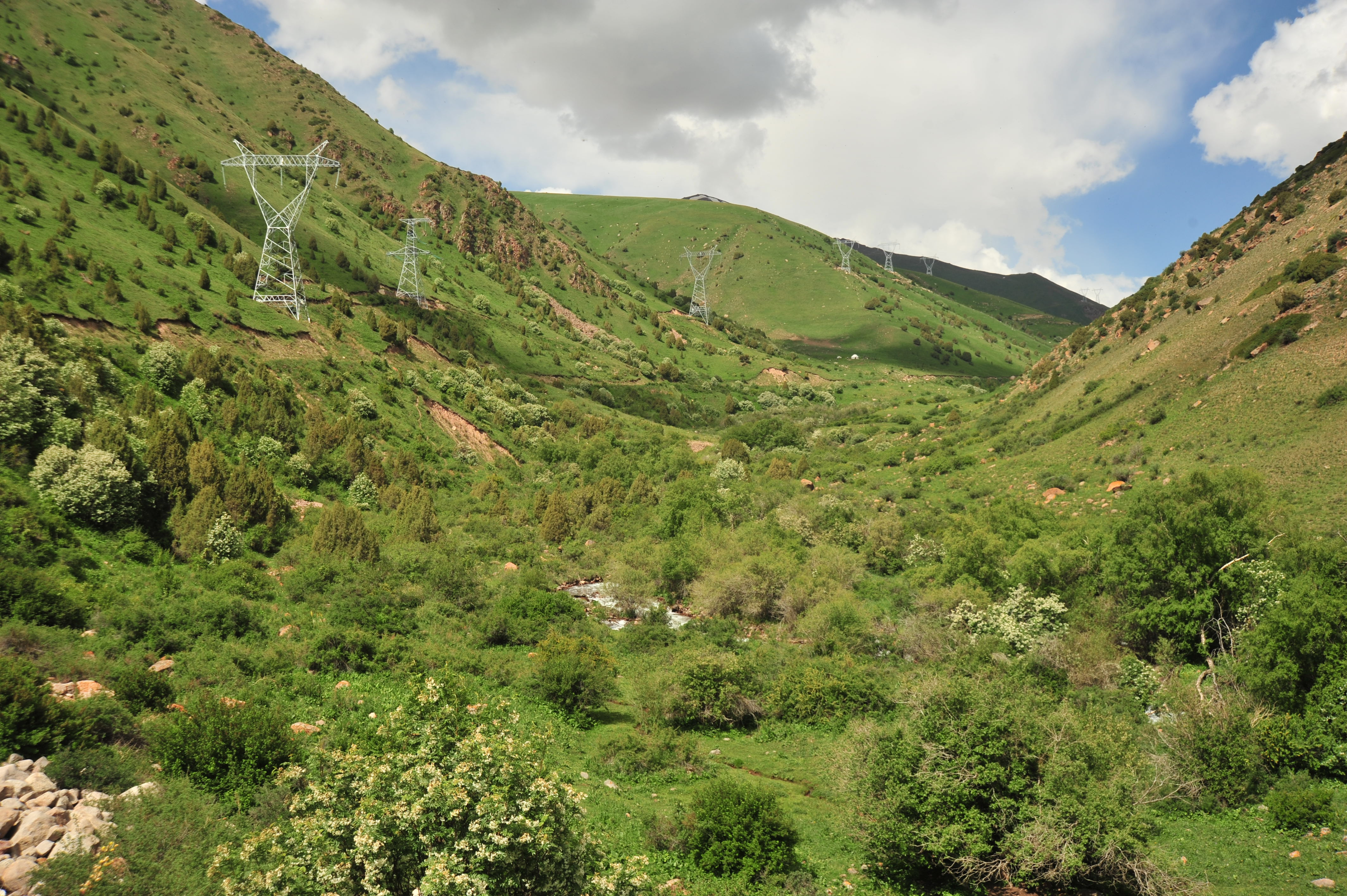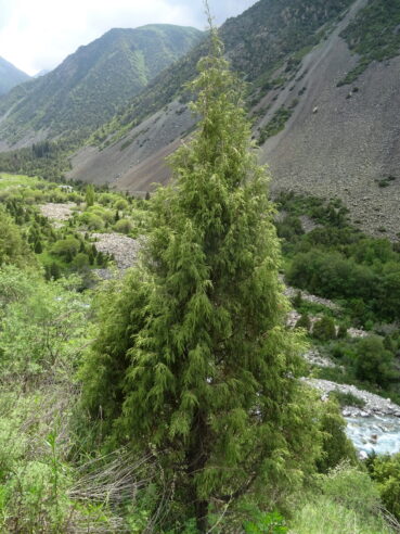 En ce samedi, jour de repos, les Kirghizes sont très nombreux, en famillle, pour venir prendre le frais et pique-niquer sous les arbres, principalement des épicéas de Schrenk, Picea schrenkiana Fisch. & C.A. Mey., et des genévriers crayons de l’Himalaya, Juniperus semiglobosa L. (photos 4 et 5 ; PCPR021653 & PCPR021654). L’endroit est étonnamment frais, la vallée étant jonchée de petites zones arborées et de vastes prairies de fauche (photo 6).