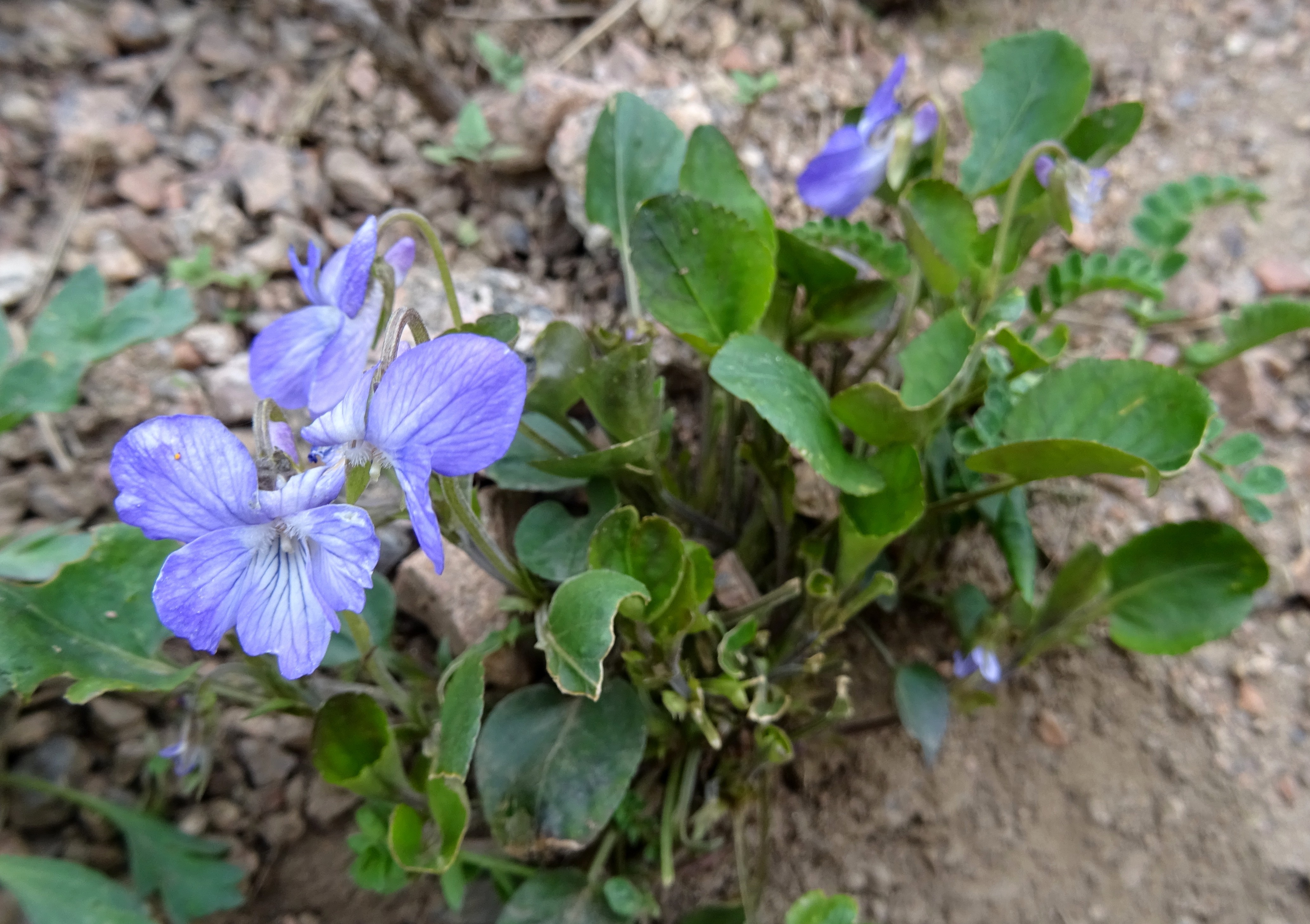 Nous atteignons ensuite des prairies alpines, qui sont incroyablement surpâturées, comme nous le verrons de façon quasi systématique au-dessus de 3 000 m d’altitude (photo 59). Il nous faut donc chercher dans les zones épargnées par les ovins pour trouver des plantes entières. Même si elles sont rares, elles sont particulièrement intéressantes. Dans une zone écorchée et pentue, à 2 800 m d’altitude, nous observons probablement la plante la plus emblématique du séjour, un astragale de la section asiatique Gontscharoviella Kamelin. Cette section est très proche de Caprini (plantes acaules ou subacaules, corolles jaunes, souche forte), et a d’ailleurs été traitée en sous-section de celle-ci par certains auteurs, elle s’en distingue par les feuilles se présentant en verticilles de folioles. Notre plante est Astragalus alaicus Freyn, endémique d’Asie centrale (planche 20 ; PCPR021735 & PCPR021736) ; elle est très proche d’un autre endémique de la même section, A. alatavicus Kar. & Kir., qui s’en distingue par la face supérieure des folioles glabre (elle est velue chez A. alaicus). Elle pousse en compagnie d’une violette évoquant Viola rupestris F.W. Schmidt, sans que nous puissions confirmer cette identification (photo 60).