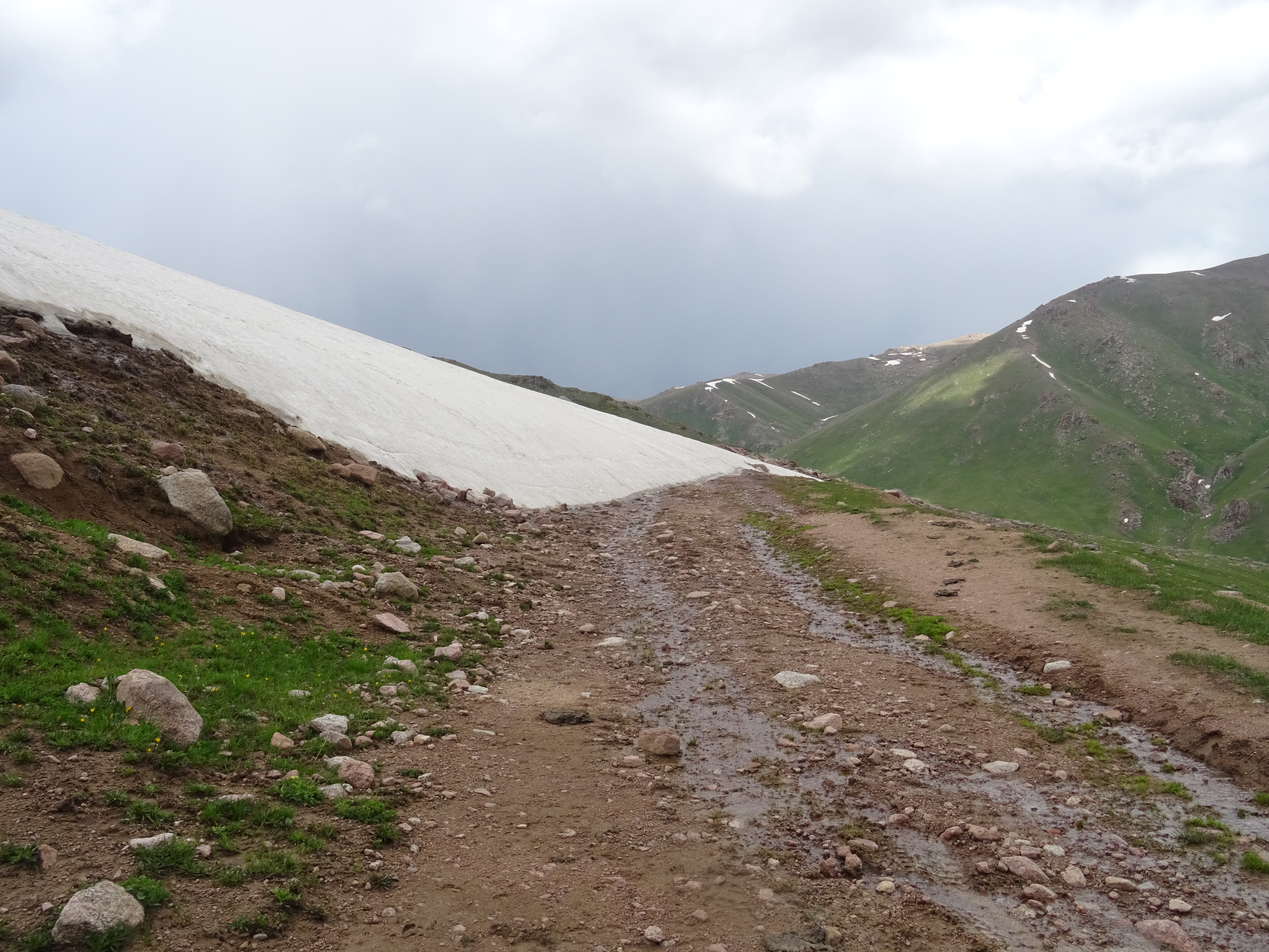 Nous reprenons notre route pour basculer vers la face ouest en direction de Toluk, mais avons la surprise de voir que la piste est coupée par un névé (photo 62). Même en prenant des risques, il est raisonnablement impossible de continuer, malgré le col qui n’est qu’à une centaine de mètres. Nous nous résignons donc à faire demi-tour et envisageons, carte en mains, de redescendre vers Kyzylkurgan, pour voir si la piste parallèle située un peu plus au sud est praticable.