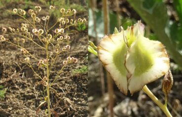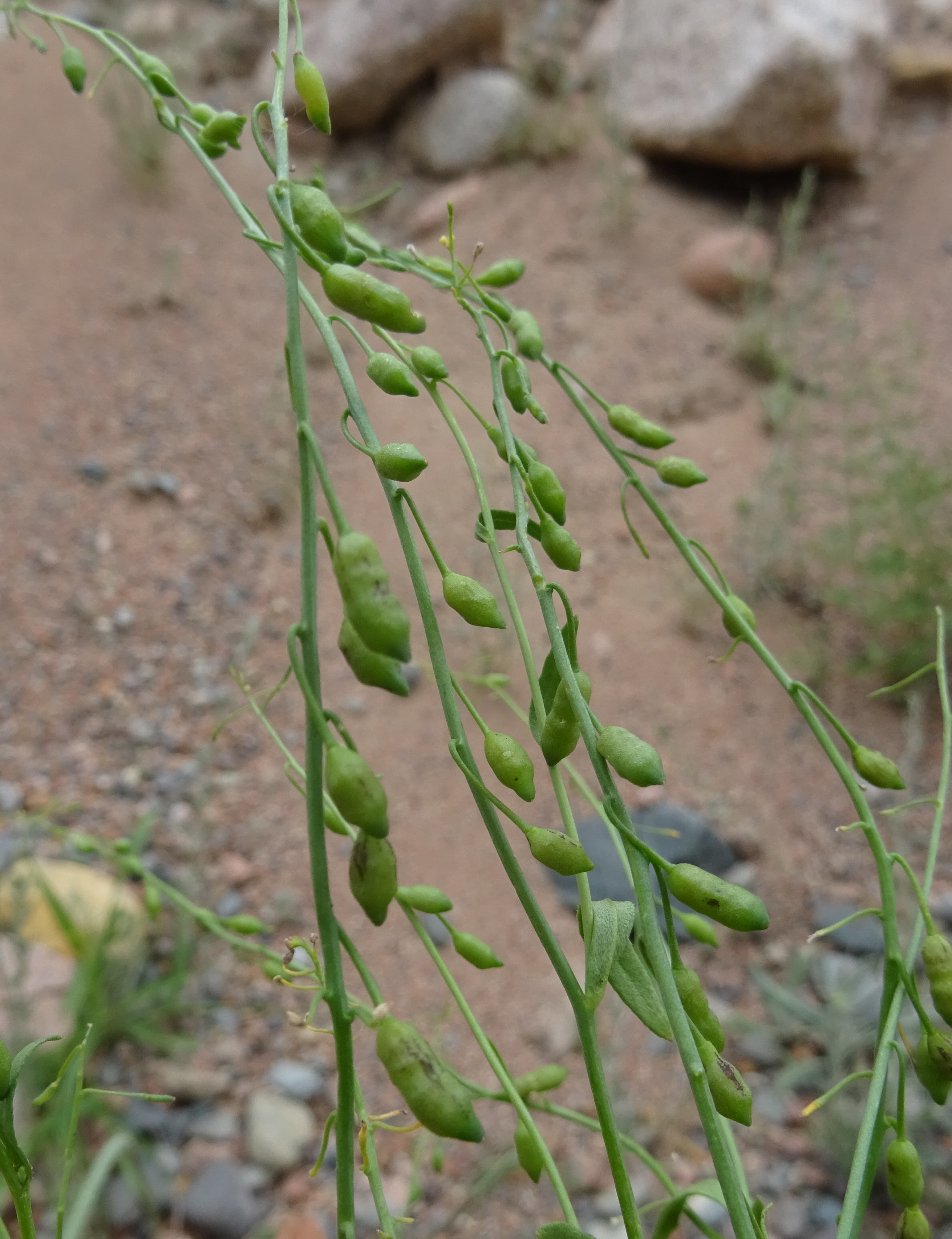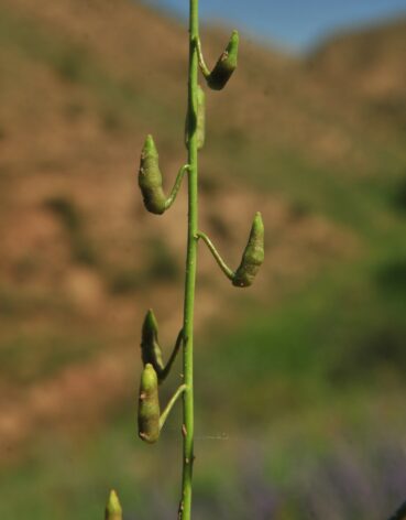 Nous faisons donc la cinquantaine de kilomètres qui nous sépare de ce village. Juste avant d’y arriver, nous stoppons sur des talus sablonneux très secs, situés au niveau de la station-service RedPetroleum sur la commune de Kyzylkurgan (41° 45′ 26.1″ N, 74° 15′ 36.0″ E ; 1 428 m). Nous retrouvons une végétation steppique et observons pour la première fois la magnifique endémique Molucella olgae (Regel) Ryding (planche 24 ; PCPR021747 & PCPR021748), aux calices accrescents blancs et veinés de vert, accompagnée de deux crucifères annuelles, Camelina microcarpa Andrz. ex DC. (PCPR021745) et surtout Goldbachia pendula Botsch., remarquable par ses fruits pendants, ovoïdes, réticulés et terminés en un bec large (photo 63 ; PCPR021743 & PCPR021744). Arrivés dans le bourg de Kyzylkurgan, nous demandons aux habitants si la piste envisagée pour rejoindre le lac de Toktogul est elle aussi coupée par la neige. Certains nous disent que c’est le cas, d’autres nous prétendent le contraire. Bref, face à une telle incertitude, nous décidons de rebrousser chemin. Dans le village, sur les talus, nous en profitons pour observer une armoise annuelle à gros capitules. Il s’agit d’Artemisia macrocephala Jacquem. ex Besser (PCPR021746), qui se reconnaît également par sa tige nettement striée et son inflorescence simple non rameuse.