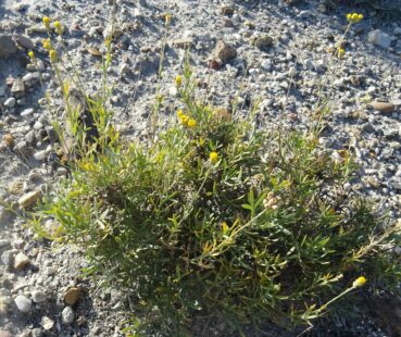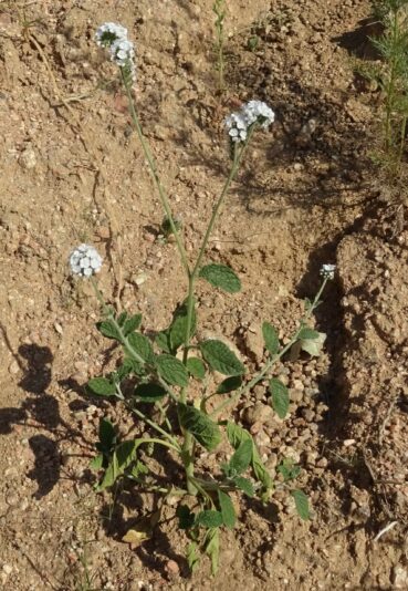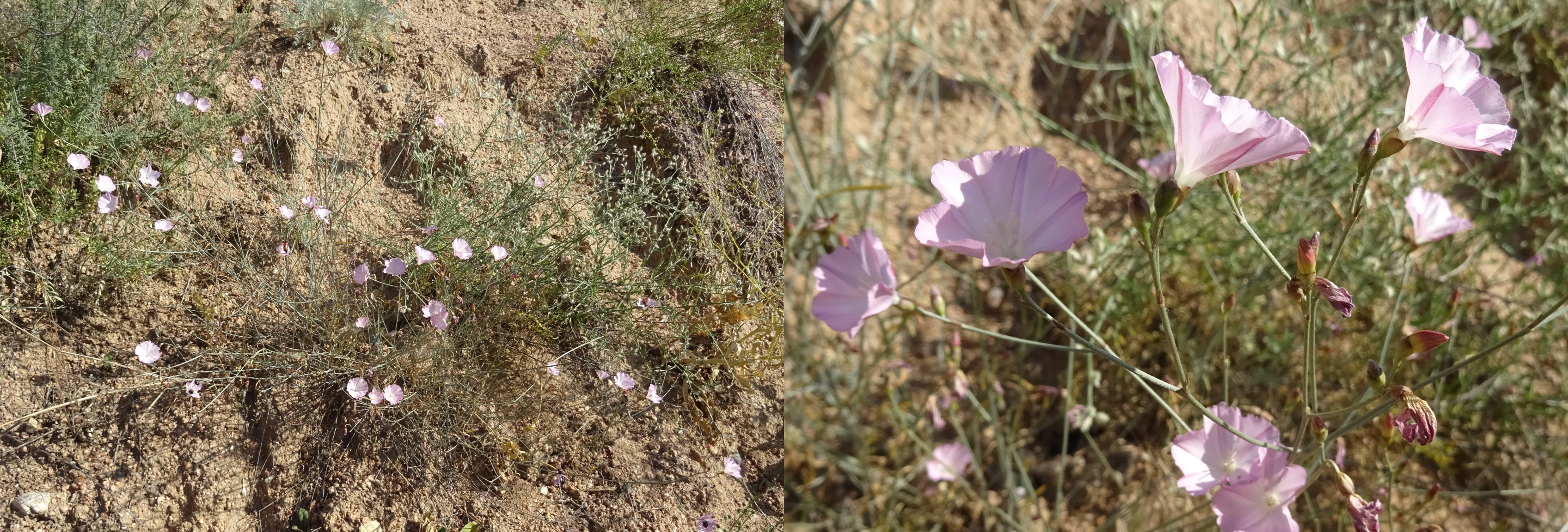 Notre premier arrêt se fait non loin de Toktogul, sur des talus de fins graviers le long de la route entre Toktogul et Torkent, au nord du lac (41° 51′ 26.4″ N, 73° 01′ 46.9″ E ; 1 080 m). Les espèces fleuries sont Convolvulus pseudocantabrica Schrenk, qui se distingue des espèces proches par ses sépales glabres à apex arrondi et court mucron (planche 26 ; PCPR021761 & PCPR021762), Plantago arenaria Waldst. & Kit. (photo 66 ; PCPR021756), Heliotropium ellipticum Ledeb. (photo 67 ; PCPR021757 & PCPR021758), ainsi que Scutellaria adenostegia, Glaucium elegans Fisch. & C.A. Mey. (31* ; PCPR022180 & PCPR022181), Salvia deserta (12*) et Tribulus terrestris L. Mais la plante qui retient toute notre attention est un spectaculaire astragale de la section centro-asiatique Chaetodon Bunge (photo 68). Elle est proche d’A. melanocomus Popov mais a des folioles beaucoup plus grandes et à face supérieure presque glabre. Après de nombreux échanges avec Georgii Lazkov, grand spécialiste de la flore kyrghize et qui a également observé cette plante non loin de là en 2025, nous sommes arrivés à la conclusion qu’il s’agissait d’une espèce non décrite. Nous sommes en cours de rédaction de sa publication à cette heure.