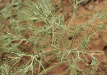 Nous approchons de la centrale hydroélectique de Kurpsay, dans les gorges de la rivière Naryn. Là encore nous nous régalons des paysages, qui deviennent progressivement schisteux (photo 85). Les coteaux sont désormais constitués de plaquettes rocheuses qui se détachent facilement, formant de petits éboulis. Sur l’un d’entre eux nous observons d’autres espèces, non rencontrées jusqu’alors (41° 29′ 52.7″ N, 72° 20′ 49.0″ E ; 670 m). Malheureusement nous n’aurons pas le plaisir de voir les grandes fleurs jaunes de Sophora griffithii Stocks (= S. mollis (Royle) Graham ex Baker subsp. griffithii (Stocks) Ali), qui est déjà largement fructifié, mais ses fruits lomentacés et ailés permettent de l’identifier, tout comme son feuillage velouté cendré du plus bel effet (planche 37 ; PCPR021789 & PCPR021790). Il s’agit d’une espèce très ornementale, endémique d’Asie centrale, Deux autres espèces remarquables sont par contre en pleine floraison, l’endémique Nepeta olgae Regel (planche 38 ; PCPR021791 & PCPR021792) et le délicat Enneapogon persicus Boiss. (planche 39 ; PCPR002689, PCPR021490 & PCPR021491). Enfin nous notons la petite rubiacée annuelle Callipeltis cucullaris (L.) DC. que nous connaissons bien d’Afrique du Nord et de Méditerranée orientale, et Chrozophora hierosolymitana Spreng. (PCPR022193).