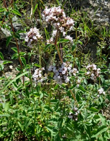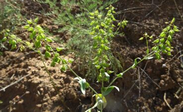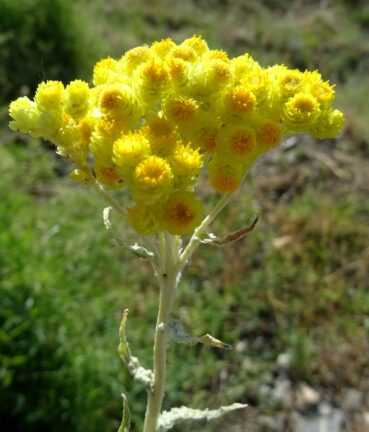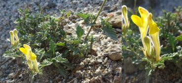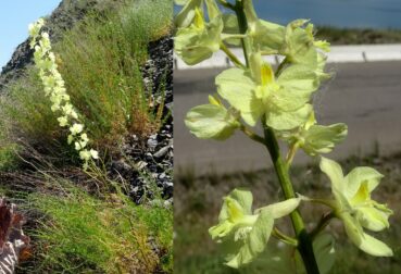 72° 58′ 04.2″E ; 935 m), une grande dauphinelle à fleurs jaunes est en pleine floraison. Il s’agit de Delphinium semibarbatum Bien. ex Boiss. (planche 32 ; PCPR021783 & PCPR021784). Elle pousse en compagnie d’Origanum vulgare L. subsp. gracile (K. Koch) Ietsw. aux corolles blanches de 4-5 mm et feuilles abondamment ponctuées de glandes sur les deux faces (photo 79 ; PCPR021803 & PCPR021804), de l’immortelle endémique Helichrysum maracandicum Popov ex Kirp. (photo 80 ; PCPR021782) ainsi que d’Handelia trichophylla et Alcea nudiflora (Lindl.) Boiss. (208* ; PCPR022100).