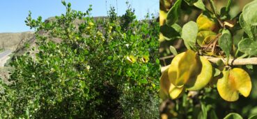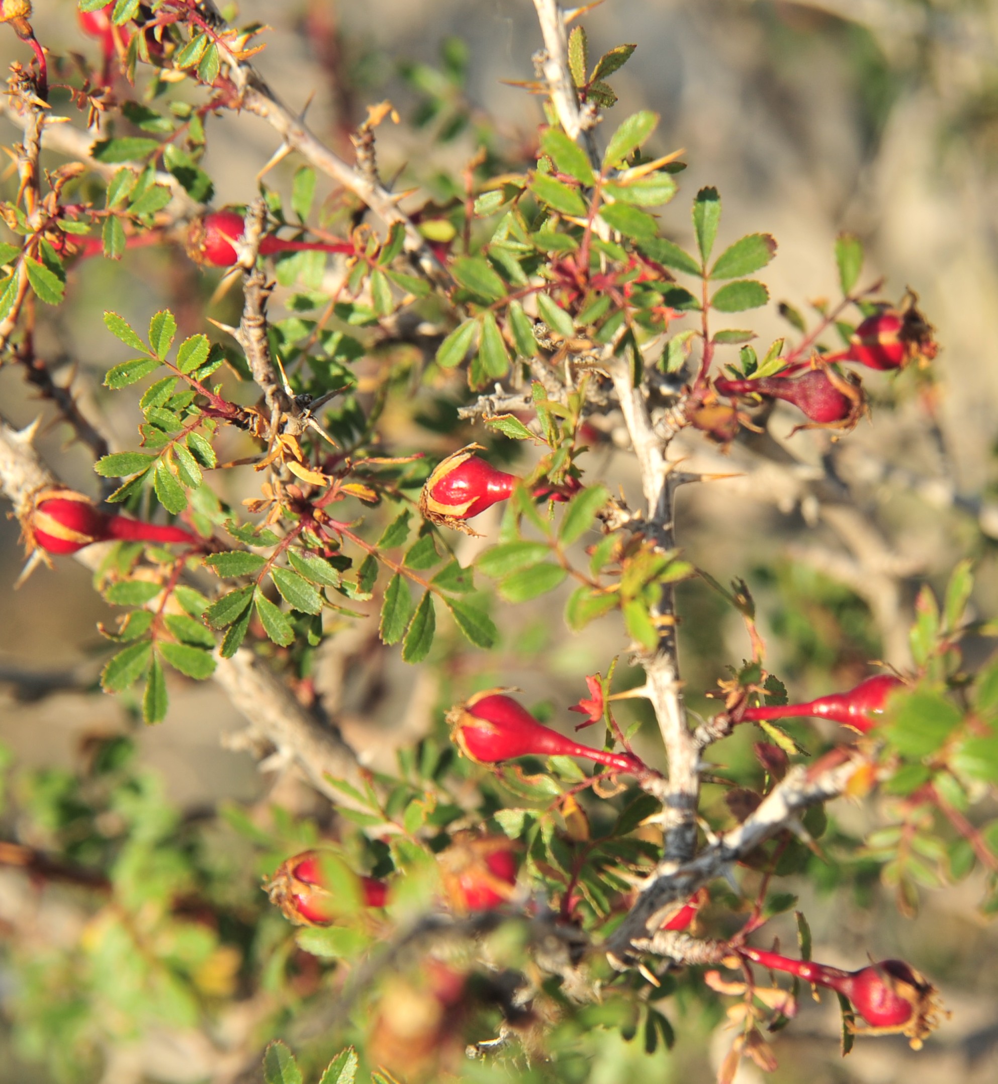 Peu au nord de Tachkoumyr nous commençons notre journée par une herborisation sur des zones de gypse très particulières sur lesquelles nous n’observerons presque que des espèces inféodées à ces milieux ; nous ne les verrons nulle part ailleurs pendant notre séjour, pas plus qu’en 2022. En cette mi-juin la végétation est déjà bien avancée ; nous ne sommes qu’à 810 m d’altitude (41° 26′ 56.8″ N, 72° 13′ 07.3″ E ; photo 87). Les rares arbustes sont des touffes de Rosa ecae Aitch., déjà largement fructifié à cette époque. Nous ne pourrons observer ses jolies petites fleurs jaunes, mais la reconnaissons aisément par ses très petites folioles (5-7mm) fortement glanduleuses (photo 88 ; PCPR021833 & PCPR021834).