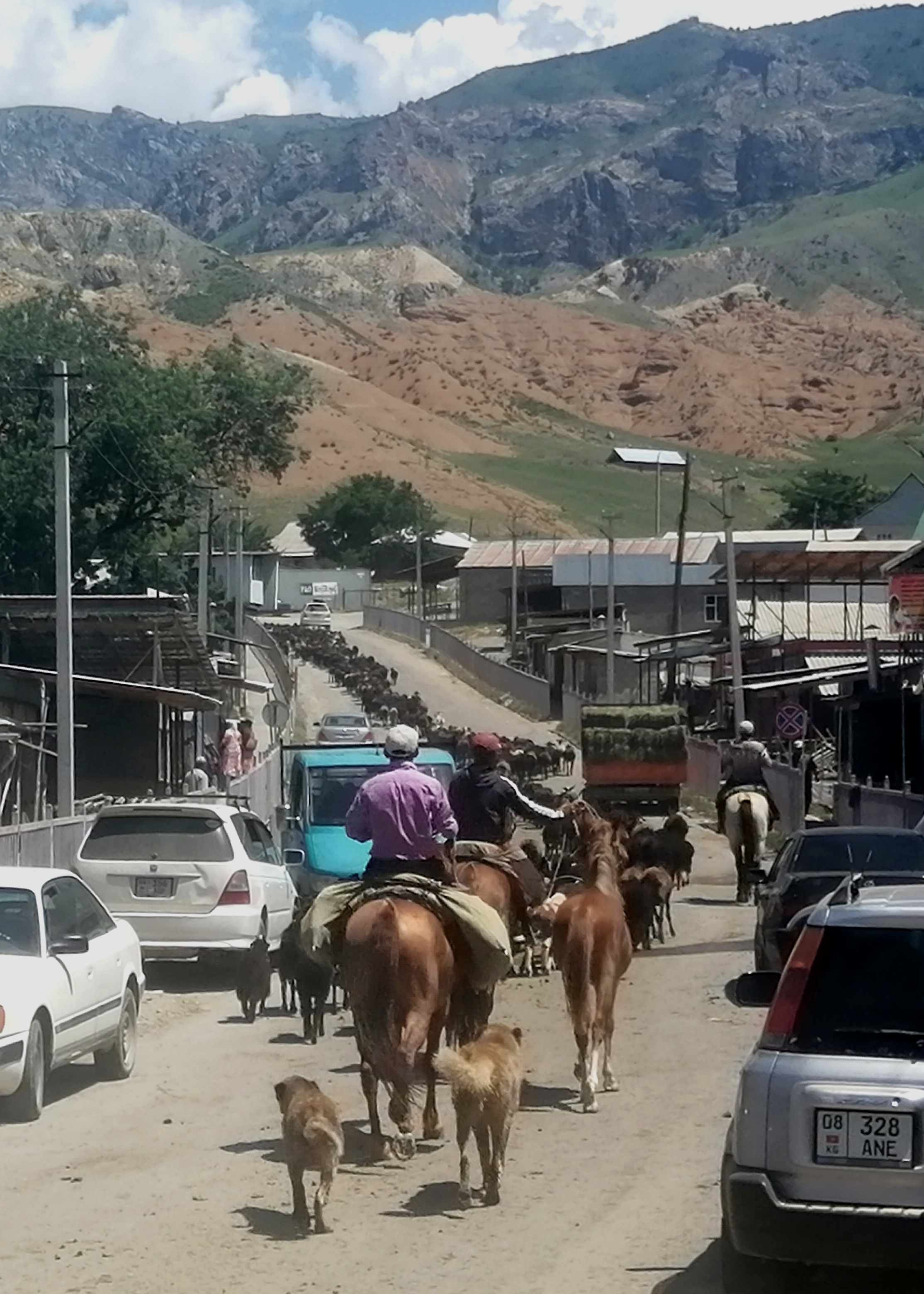 Dès le lever du jour nous sommes de retour à l’aéroport de Bichkek. Fort heureusement, nos bagages sont arrivés avec le vol d’Istanbul du matin. Nous pouvons donc poursuivre notre voyage sereinement et filer vers le sud-ouest, comme initialement prévu. Notre objectif est de rejoindre la région de Kyzyl-Oi, au centre du pays. Nous prenons donc la route de Talas, un des principaux axes routiers du pays. Elle est déjà passablement encombrée à cette heure, jusqu’à la bifurcation vers le sud, à Kalinin.