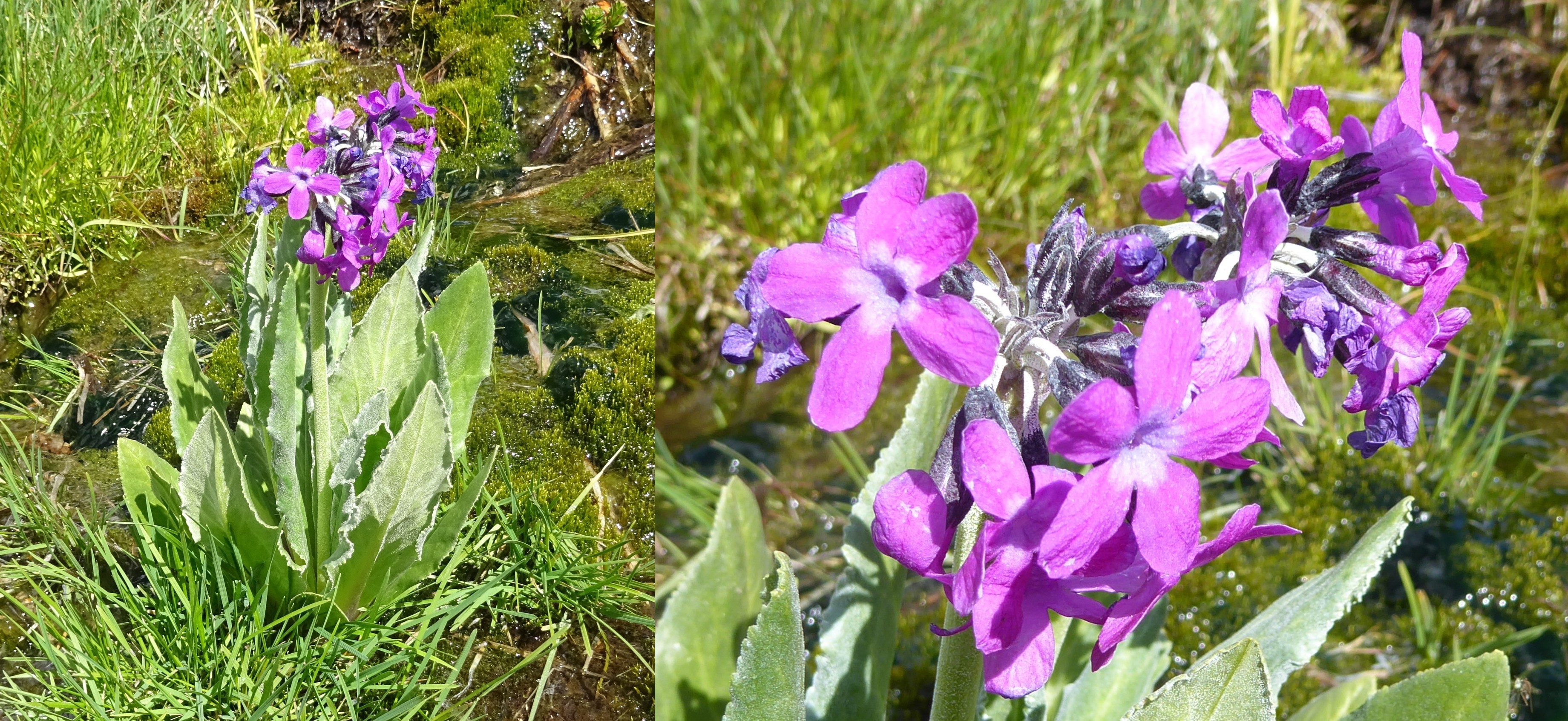 Là encore le genre Allium est représenté par une espèce très particulière, caractérisée par ses tiges épaisses et fistuleuses et ses inflorescences à grandes fleurs jaunes lavées de pourpre, Allium atrosanguineum Schrenk var. fedschenkoanum (Regel) G.H. Zhu & Turland (planche 9 ; PCPR002696, PCPR021476 & PCPR021477). Nous observons également Thermopsis alpina (Pall.) Ledeb. (planche 10 ; PCPR021717), espèce à fleurs jaunes proche de Th. turkestanica Gand. (PCPR022054 & PCPR022055), que nous avions vu en 2022 plus à l’est autour du lac Yssyk-Köl, mais beaucoup plus densément velu. Le cortège floristique est magnifique, avec de nombreuses autres endémiques d’Asie centrale comme Trollius dschungaricus Regel (PCPR021713 & PCPR021714), à stigmates jaune-verdâtre de tailles variables (photo 20 ), Pedicularis alatavica Stadlm. ex Vved. (photo 21 ; PCPR021715), la robuste Primula nivalis Pall. subsp. turkestanica (J.N. Haage & E. Schmidt) Kovt. (planche 11 ; PCPR021712), dont les plus grands exemplaires atteignent 40 cm, Barbarea arcuata (Opiz) Rchb. (PCPR021716), la brassicacée Eutrema heterophyllum (W.W. Sm.) H. Hara (= E. edwardsi sensu Komarov ; photo 22 ; PCPR021710 & PCPR021711), la polygonacée Koenigia songarica (Schrenk) T.M. Schust. & Reveal (photo 23 ; PCPR021709), à corolles rougeâtres et feuilles à pubescence éparse en-dessous, Doronicum turkestanicum Cavill. (photo 24 ; PCPR021708), la rare Potentilla pamiroalaica Juz. (photo 25 ; PCPR021931 & PCPR021932), manifestement non connue de cette zone, ainsi que Primula matthioli (L.) V.A. Richt. (= Cortusa m. L. ; photo 26 ; PCPR021978), Phlomoides oreophila (107*), Anemonastrum protractum (Ulbr.) Holub (110* ; PCPR021961), Androsace septentrionalis L. (72* ; PCPR022114), la délicate Pulsatilla campanella (Regel & Tiling) Fisch. ex Krylov (photo 27 ; PCPR021981), Ranunculus albertii Regel & Schmalh. (171* ; PCPR022056 & PCPR022057) et Thalictrum minus L. (PCPR021933).