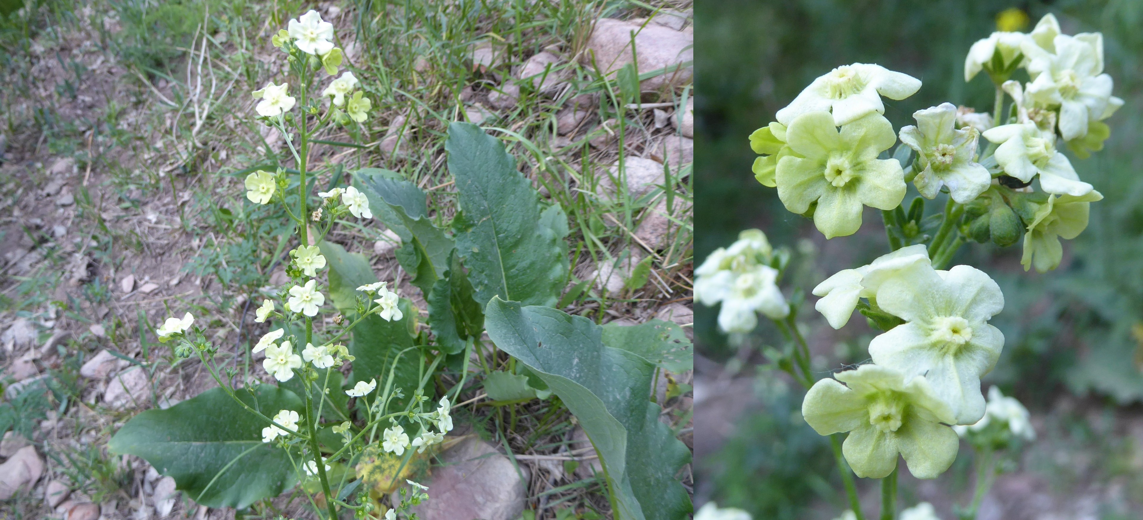 De l’autre côté de la piste, dans la ripisylve ombragée de la rivière Kokemeren, nous revoyons des plantes vues en 2022, Iris halophila Pall. var. sogdiana (Bunge) Skeels (photo 47 ; PCPR021479 & PCPR021480) et Glycyrrhiza uralensis Fisch. ex DC. (photo 48 ; 77* ; PCPR021670 & PCPR022108), et rencontrons pour la première fois Cynoglossum viridiflorum Pall. ex Lehm., remarquable par sa grande taille, son port très ramifié et ses fleurs verdâtres qui lui donnent son nom (planche 16 ; PCPR021718 & PCPR021719). Au sud de Kysyl-Oi, nous prenons vers l’ouest la piste qui longe un ruisseau séparant les provinces de Tchouï et de Naryn, en direction de Toluk. Le programme de la journée doit, par cette piste, nous amener à rejoindre les bords du lac de Toktogul.