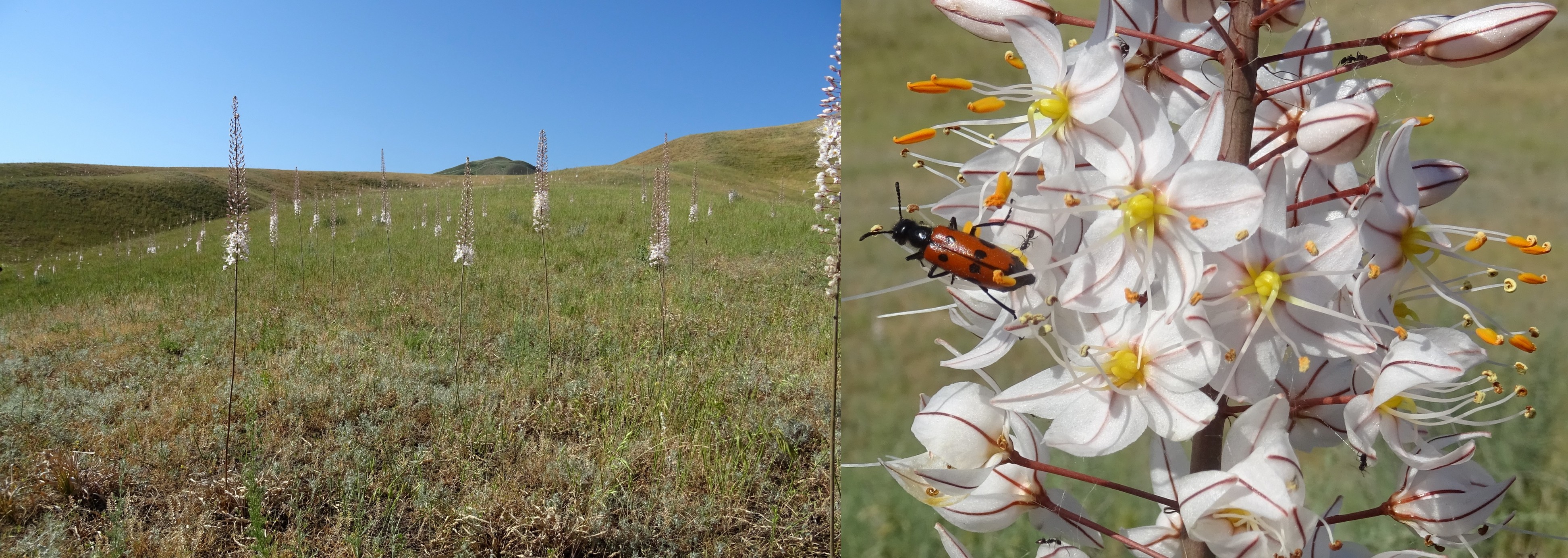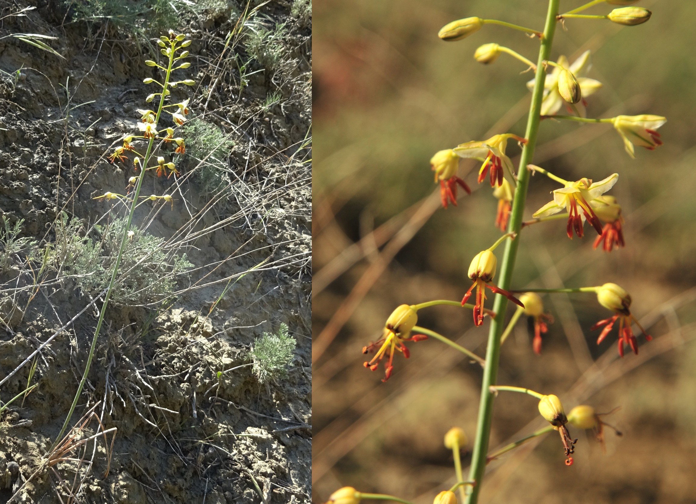 Nous reprenons la route longeant le lac et nous nous arrêtons sur un coteau marneux plus ou moins suintant, toujours au sud-est (41° 48′ 58.4″ N, 73° 11′ 30.1″ E ; 1 062 m). En effet, c’est un autre Eremurus qui attire notre regard, plus fin que le précédent et à corolles jaune pâle. Il s’agit d’un endémique kirghize, à répartition limitée à cette zone du pays et décrit par Georgii Laskov, en 2011, Eremurus czatkalicus Lazkov (planche 29 ; PCPR002691 & PCPR021489).